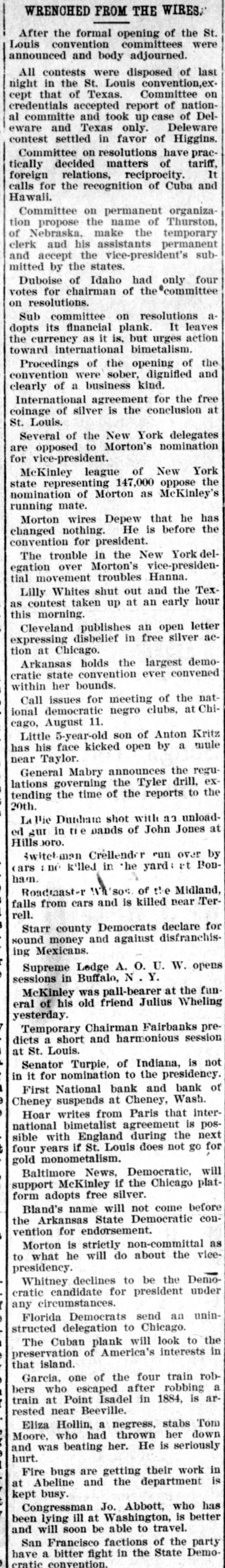 VRENCHED FROM THE WIRES. the formal opening of the St. convention committees were ounced and body adjourned. contests were disposed of last in the St. Louis convention,exthat of Texas. Committee on lentials accepted report of nationommitte and took up case of Deland Texas only. Deleware settled in favor of Higgins. ommittee on resolutions have pracdecided matters of tariff, relations, reciprocity. It for the recognition of Cuba and waii. ommittee on permanent organizapropose the name of Thurston, Nebraska, make the temporary and his assistants permanent accept the vice-president's subby the states. uboise of Idaho had only four for chairman of the committee resolutions. committee on resolutions aits financial plank. It leaves currency as it is, but urges action international bimetalism. rocedings of the opening of the vention were sober, dignified and of a business kind. ternational agreement for the free of silver is the conclusion at Louis. everal of the New York delegates opposed to Morton's nomination vice-president. leKinley league of New York representing 147,000 oppose the ination of Morton as McKinley's mate. orton wires Depew that he has nged nothing. He is before the vention for president. he trouble in the New York delover Morton's vice-presidenmovement troubles Hanna. Whites shut out and the Texcontest taken up at an early hour morning. leveland publishes an open letter ressing disbelief in free silver acat Chicago. rkansas holds the largest demostate convention ever convened her bounds. issues for meeting of the natdemocratic negro clubs, at ChiAugust 11. 5-year-old son of Anton Kritz his face kicked open by a mule Taylor. eneral Mabry announces the regugoverning the Tyler drill, exthe time of the reports to the Vie Dutchate shot with an unloadin " e bands of John Jones at oro. witchman Créllender run over by no killed in the yard: at Bonoudmaster Wa'sos of the Midland, from cars and is killed near Tercounty Democrats declare for money and against disfranchisMexicans. upreme Lodge A. O. U. W. opens in Buffalo, N Y. IcKinley was pall-bearer at the funof his old friend Julius Wheling terday. emporary Chairman Fairbanks prea short and harmonious session Louis. enator Turpie, of Indiana, is not for nomination to the presidency. 'irst National bank and bank of suspends at Cheney, Wash. loar writes from Paris that interional bimetalist agreement is poswith England during the next years if St. Louis does not go for monometalism. altimore News, Democratic, will McKinley if the Chicago platadopts free silver.