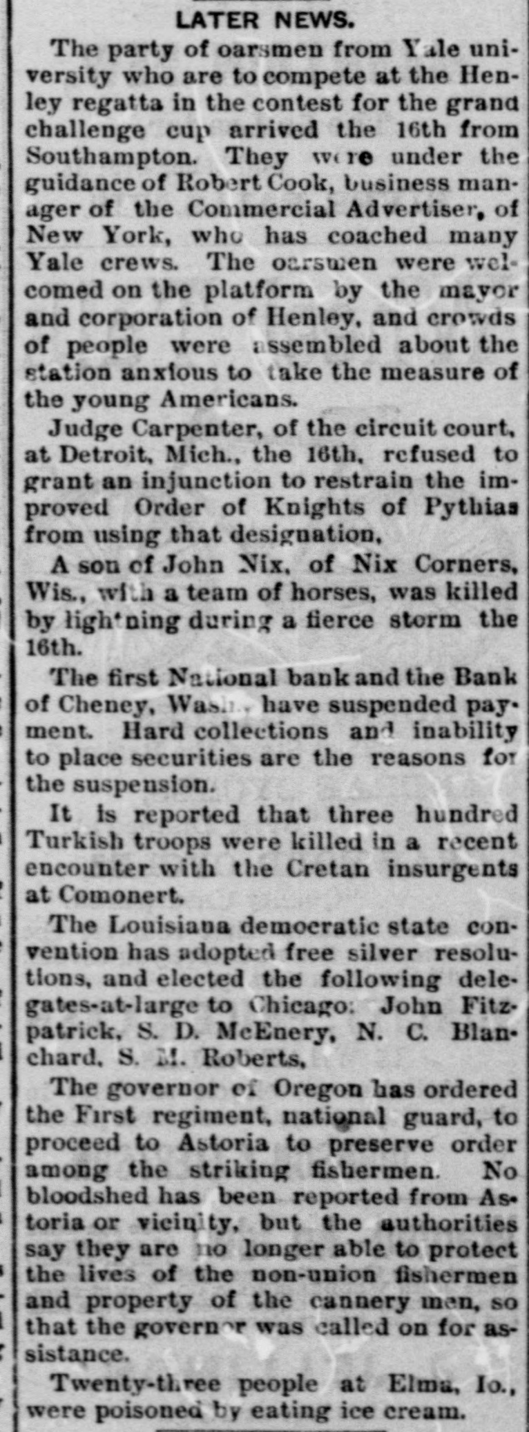 LATER NEWS. The party of oarsmen from Yale university who are to compete at the Henley regatta in the contest for the grand challenge cup arrived the 16th from Southampton. They were under the guidance of Robert Cook, business manager of the Commercial Advertiser, of New York, who has coached many Yale crews. The oarsmen were welcomed on the platform by the mayor and corporation of Henley, and crowds of people were assembled about the station anxious to take the measure of the young Americans. Judge Carpenter, of the circuit court, at Detroit, Mich., the 16th, refused to grant an injunction to restrain the improved Order of Knights of Pythias from using that designation. A son of John Nix, of Nix Corners, Wis., with a team of horses, was killed by lightning during a fierce storm the 16th. The first National bank and the Bank of Cheney, Wash., have suspended payment. Hard collections and inability to place securities are the reasons for the suspension. It is reported that three hundred Turkish troops were killed in a recent encounter with the Cretan insurgents at Comonert. The Louisiana democratic state convention has adopted free silver resolutions, and elected the following delegates-at-large to Chicago: John Fitzpatrick, S. D. McEnery, N. C. Blanchard, S. M. Roberts. The governor of Oregon has ordered the First regiment, national guard, to proceed to Astoria to preserve order among the striking fishermen. No bloodshed has been reported from Astoria or vicinity, but the authorities say they are no longer able to protect the lives of the non-union fishermen and property of the cannery men, so that the governor was called on for assistance. Twenty-three people at Elma, Io., were poisoned by eating ice cream.