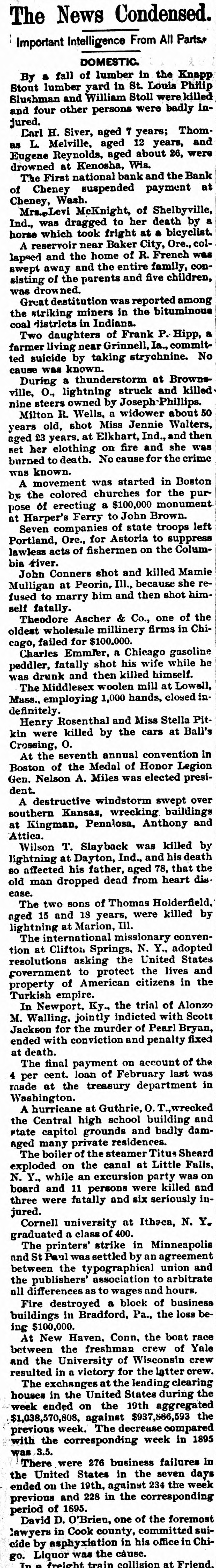 The News Condensed. : Important Intelligence From All Parts DOMESTIC. By a fall of lumber in the Knapp Stout lumber yard in St. Louis Philip Slushman and William Stoll were killed and four other persons were badly injured. Carl H. Siver, aged 7 years; Thomas L. Melville, aged 12 years, and Eugene Reynolds, aged about 26, were drowned at Kenosha, Wis. The First national bank and the Bank of Cheney suspended payment at Cheney, Wash. Mra.,Levi McKnight, of Shelbyville, Ind., was dragged to her death by a horse which took fright at a bicyclist. A reservoir near Baker City, Ore., collapsed and the home of R. French was swept away and the entire family, consisting of the parents and five children, was drowned. Great destitution was reported among the striking miners in the bituminous coal districts in Indiana. Two daughters of Frank P. Hipp, a farmer living near Grinnell, Ia., committed suicide by taking strychnine. No cause was known. During a thunderstorm at Brownsville, O., lightning struck and killed nine steers owned by Joseph Phillips. Milton R. Wells, a widower about 50 years old, shot Miss Jennie Walters, aged 23 years. at Elkhart, Ind., and then set her clothing on fire and she was burned to death. No cause for the crime was known. A movement was started in Boston by the colored churches for the pur pose of erecting a $100,000 monument at Harper's Ferry to John Brown. Seven companies of state troops left Portland, Ore., for Astoria to suppress lawless acts of fishermen on the Columbia river. John Conners shot and killed Mamie Mulligan at Peoria, III., because she refused to marry him and then shot himself fatally. Theodore Ascher & Co., one of the oldest wholesale millinery firms in Chicago, failed for $100,000. Charles Emmler, a Chicago gasoline peddler, fatally shot his wife while he was drunk and then killed himself. The Middlesex woolen mill at Lowell, Mass., employing 1,000 hands, closed indefinitely. Henry Rosenthal and Miss Stella Pitkin were killed by the cars at Ball's Crossing, O. At the seventh annual convention in Boston of the Medal of Honor Legion Gen. Nelson A. Miles was elected president. A destructive windstorm swept over southern Kansas, wrecking buildings at Kingman, Penalosa, Anthony and Attica. Wilson T. Slayback was killed by lightning at Dayton, Ind., and his death so affected his father, aged 78, that the old man dropped dead from heart dis. ease. The two sons of Thomas Holderfield. aged 15 and 18 years, were killed by lightning at Marion, III. The international missionary convention at Clifton Springs, N. Y., adopted resolutions asking the United States government to protect the lives and property of American citizens in the Turkish empire. In Newport. Ky., the trial of Alonzo M. Walling, jointly indicted with Scott Jackson for the murder of Pearl Bryan, ended with conviction and penalty fixed at death. The final payment on account of the 4 per cent. loan of February last was made at the treasury department in Washington. A hurricane at Guthrie, O. wrecked the Central high school building and rtate capitol grounds and badly damaged many private residences. The boiler of the steamer Titus Sheard exploded on the canal at Little Falls, N. Y., while an excursion party was on board and 11 persons were killed and three were fatally and six seriously injured. Cornell university at Ithaca, N. Y. graduated a class of 400. The printers' strike in Minneapolis and St Paul was settled by an agreement between the typographical union and the publishers' association to arbitrate all differences as to wages and hours. Fire destroyed a block of business buildings in Bradford, Pa., the loss being $100,000. At New Haven. Conn, the boat race between the freshman crew of Yale and the University of Wisconsin crew resulted in a victory for the latter crew. The exchanges at the leading clearing houses in the United States during the week ended on the 19th aggregated $1,038,570,808, against $937,886,593 the previous week. The decrease compared with the corresponding week in 1895 was 3.5. There were 276 business failures in the United States in the seven days ended on the 19th, against 234 the week previous and 228 in the corresponding period of 1895. David D. O'Brien, one of the foremost Lawyers in Cook county, committed suicide by asphyxiation in his office in Chi-