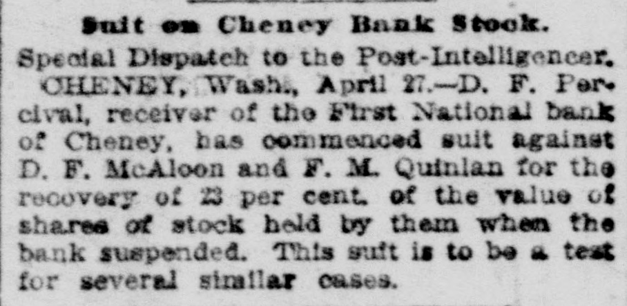 Duit on Cheney Bank Stock. Special Dispatch to the Post-Intelligencer. CHENEY, Wash, April 27.-D. F. Per. cival, receiver of the First National bank of Cheney, has commenced suit against D. F. McAloon and F. M. Quinlan for the recovery of 23 per cent. of the value of shares of stock held by them when the bank suspended. This suft is to be of test for several similar cases.