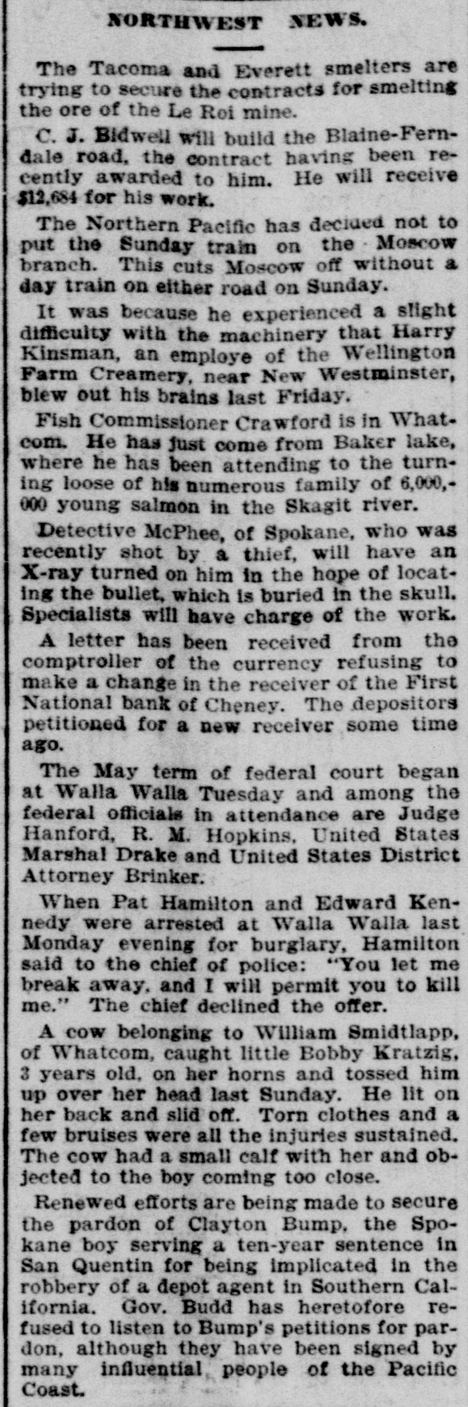 NORTHWEST NEWS. The Tacoma and Everett smelters are trying to secure the contracts for smelting the ore of the Le Roi mine. C. J. Bidwell will build the Blaine-Ferndale road, the contract having been recently awarded to him. He will receive $12,684 for his work. The Northern Pacific has declaed not to put the Sunday train on the Moscow branch. This cuts Moscow off without a day train on either road on Sunday. It was because he experienced a slight difficulty with the machinery that Harry Kinsman, an employe of the Wellington Farm Creamery, near New Westminster, blew out his brains last Friday. Fish Commissioner Crawford is in Whatcom. He has just come from Baker lake, where he has been attending to the turning loose of his numerous family of 6,000,000 young salmon in the Skagit river. Detective McPhee, of Spokane, who was recently shot by a thief, will have an X-ray turned on him in the hope of locating the bullet, which is buried in the skull. Specialists will have charge of the work. A letter has been received from the comptroller of the currency refusing to make a change in the receiver of the First National bank of Cheney. The depositors petitioned for a new receiver some time ago. The May term of federal court began at Walla Walla Tuesday and among the federal officials in attendance are Judge Hanford, R. M. Hopkins, United States Marshal Drake and United States District Attorney Brinker. When Pat Hamilton and Edward Kennedy were arrested at Walla Walla last Monday evening for burglary, Hamilton said to the chief of police: "You let me break away, and I will permit you to kill me." The chief declined the offer. A cow belonging to William Smidtlapp, of Whatcom, caught little Bobby Kratzig, 3 years old, on her horns and tossed him up over her head last Sunday. He lit on her back and slid off. Torn clothes and a few bruises were all the injuries sustained. The cow had a small calf with her and objected to the boy coming too close. Renewed efforts are being made to secure the pardon of Clayton Bump, the Spokane boy serving a ten-year sentence in San Quentin for being implicated in the robbery of a depot agent in Southern California. Gov. Budd has heretofore refused to listen to Bump's petitions for pardon, although they have been signed by many influential, people of the Pacific Coast.