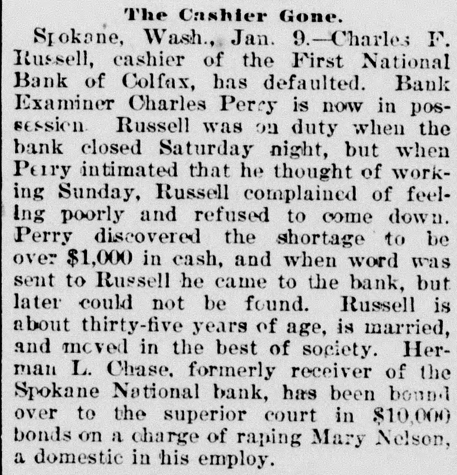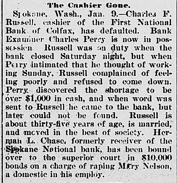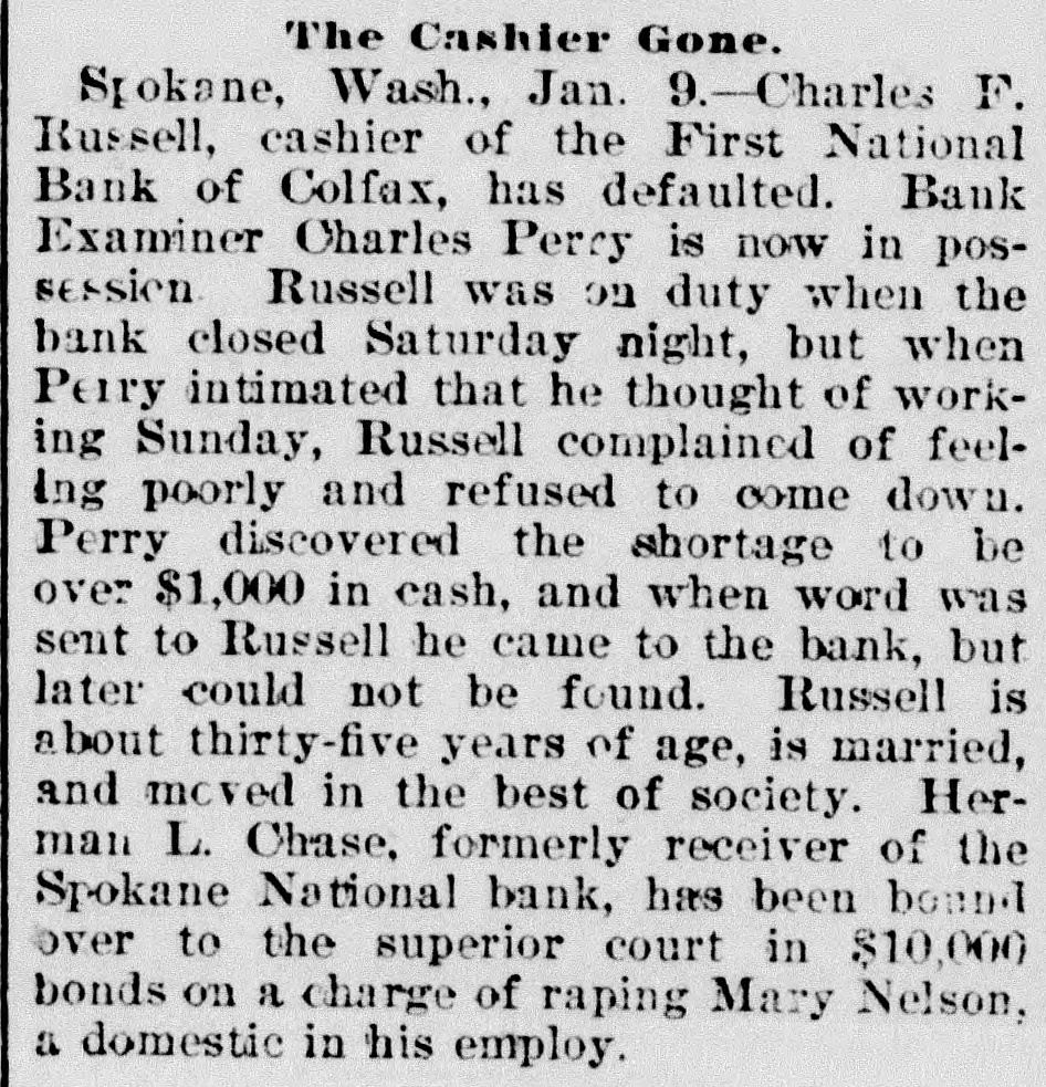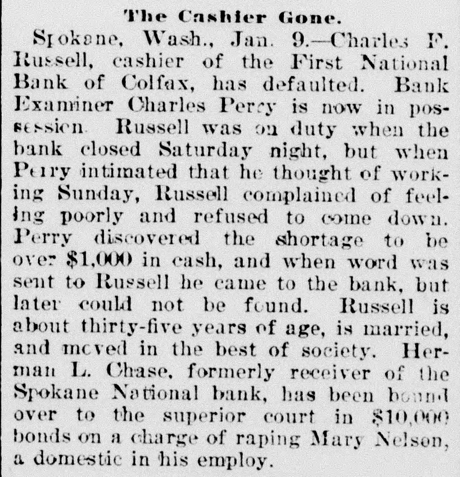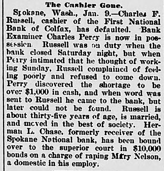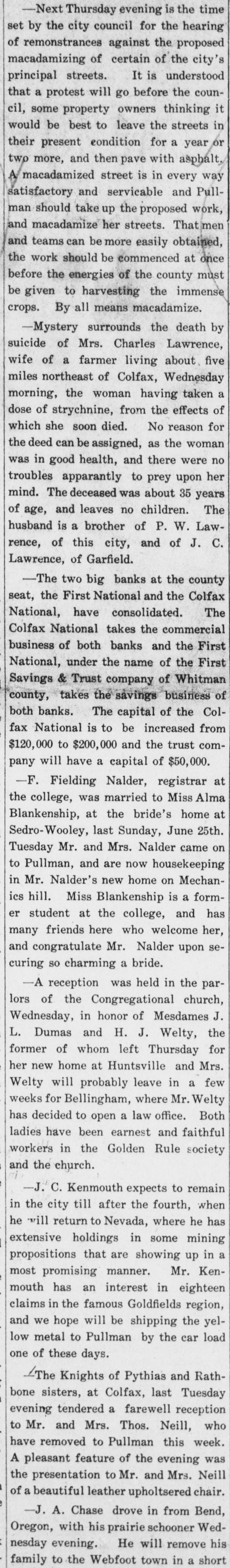 -Next Thursday evening is the time set by the city council for the hearing of remonstrances against the proposed macadamizing of certain of the city's principal streets. It is understood that a protest will go before the council, some property owners thinking it would be best to leave the streets in their present condition for a year or two more, and then pave with asphalt, A macadamized street is in every way satisfactory and servicable and Pullman should take up the proposed work, and macadamize her streets. That men and teams can be more easily obtained, the work should be commenced at once before the energies of the county must be given to harvesting the immense crops. By all means macadamize. -Mystery surrounds the death by suicide of Mrs. Charles Lawrence, wife of a farmer living about five miles northeast of Colfax, Wednesday morning, the woman having taken a dose of strychnine, from the effects of which she soon died. No reason for the deed can be assigned, as the woman was in good health, and there were no troubles apparantly to prey upon her mind. The deceased was about 35 years of age, and leaves no children. The husband is a brother of P. W. Lawrence, of this city, and of J. C. Lawrence, of Garfield. -The two big banks at the county seat, the First National and the Colfax The National, have consolidated. Colfax National takes the commercial business of both banks and the First National, under the name of the First Savings & Trust company of Whitman county, takes the savings business of both banks. The capital of the Colfax National is to be increased from $120,000 to $200,000 and the trust company will have a capital of $50,000. -F. Fielding Nalder, registrar at the college, was married to Miss Alma Blankenship, at the bride's home at Sedro-Wooley, last Sunday, June 25th. Tuesday Mr. and Mrs. Nalder came on to Pullman, and are now housekeeping in Mr. Nalder's new home on Mechanics hill. Miss Blankenship is a former student at the college, and has many friends here who welcome her, and congratulate Mr. Nalder upon securing so charming a bride. -A reception was held in the parlors of the Congregational church, Wednesday, in honor of Mesdames J. L. Dumas and H. J. Welty, the former of whom left Thursday for her new home at Huntsville and Mrs. Welty will probably leave in a few weeks for Bellingham, where Mr. Welty has decided to open a law office. Both ladies have been earnest and faithful workers in the Golden Rule society and the church. -J. C. Kenmouth expects to remain in the city till after the fourth, when he will return to Nevada, where he has extensive holdings in some mining propositions that are showing up in a most promising manner. Mr. Kenmouth has an interest in eighteen claims in the famous Goldfields region, and we hope will be shipping the yellow metal to Pullman by the car load one of these days. /The Knights of Pythias and Rathbone sisters, at Colfax, last Tuesday evening tendered a farewell reception to Mr. and Mrs. Thos. Neill, who have removed to Pullman this week. A pleasant feature of the evening was the presentation to Mr. and Mrs. Neill of a beautiful leather upholtsered chair. -J. A. Chase drove in from Bend, Oregon, with his prairie schooner Wednesday evening. He will remove his family to the Webfoot town in a short