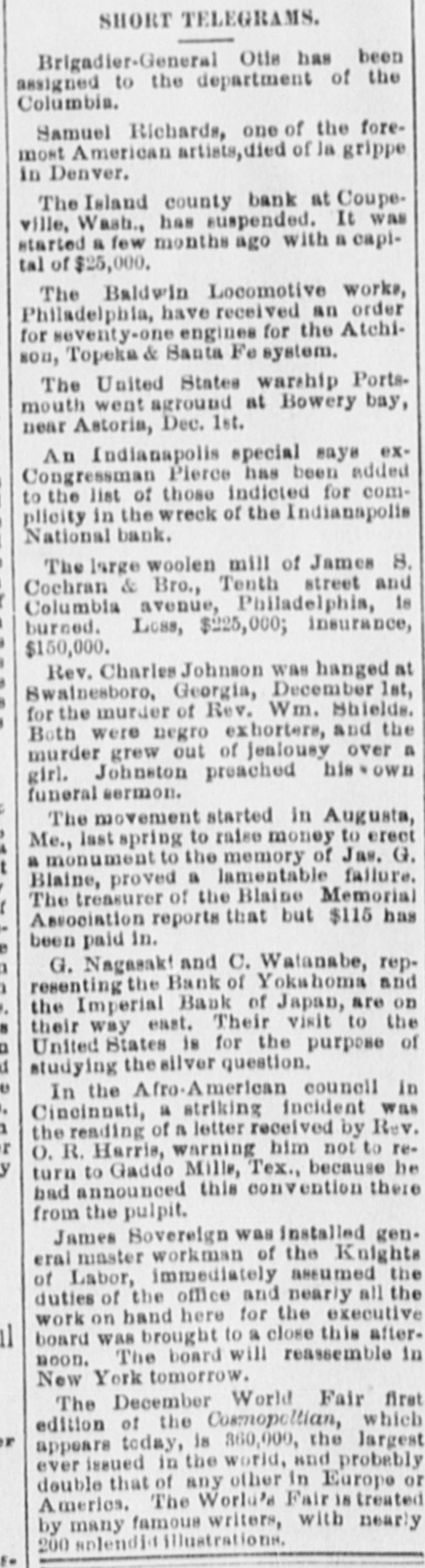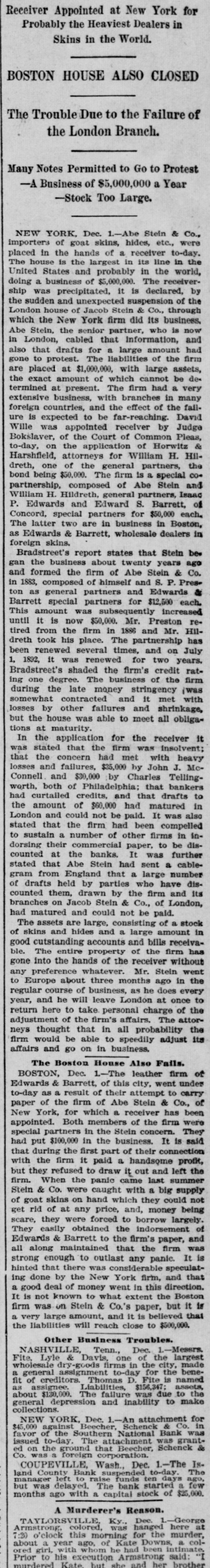 Probably the Heaviest Dealers in Skins in the World. BOSTON HOUSE ALSO CLOSED The Trouble Due to the Failure of the London Branch. Many Notes Permitted to Go to Protest -A Business of $5,000,000 a Year -Stock Too Large. NEW YORK, Dec. 1.-Abe Stein & Co., importers of goat skins, hides, etc., were placed in the hands of a receiver to-day. The house is the largest in its line in the United States and probably in the world, doing a business of $5,000,000. The receivership was precipitated, it is declared, by the sudden and unexpected suspension of the London house of Jacob Stein & Co., through which the New York firm did its business, Abe Stein, the senior partner, who is now in London, cabled that information, and also that drafts for a large amount had gone to protest. The liabilities of the firm are placed at $1,000,000, with large assets, the exact amount of which cannot be determined at present. The firm had a very extensive business, with branches in many foreign countries, and the effect of the fallure is expected to be far-reaching. David Wille was appointed receiver by Judge Bokslaver, of the Court of Common Pleas, to-day, on the application of Horwitz & Harshfield, attorneys for William H. Hildreth, one of the general partners, the bond being $50,000. The firm is a special CO. partnership, composed of Abe Stein and William H. Hildreth, general partners, Isaac P. Edwards and Edward S. Barrett, of Concord, special partners for $50,000 each. The latter two are in business in Boston, as Edwards & Barrett, wholesale dealers in foreign skins. Bradstreet's report states that Stein be gan the business about twenty years age and formed the firm of Abe Stein & Co. in 1883, composed of himself and S. P. Preston as general partners and Edwards & Barrett special partners for $12,500 each. This amount was subsequently increased until it is now $50,000. Mr. Preston retired from the firm in 1886 and Mr. Hildreth took his place. The partnership has been renewed several times, and on July 1, 1892, it was renewed for two years. Bradstreet's shaded the firm's credit rating one degree. The business of the firm during the late money stringency (was somewhat contracted and it met with losses by other failures and shrinkage, but the house was able to meet all obligations at maturity. In the application for the receiver it was stated that the firm was insolvent; that the concern had met with heavy losses and failures, $35,000 by John J. McConnell and $30,000 by Charles Tellingworth, both of Philadelphia; that bankers had curtailed credits, and that drafts to the amount of $60,000 had matured in London and could not be paid. It was also stated that the firm had been compelled to sustain a number of other firms in indorsing their commercial paper, to be discounted at the banks. It was further stated that Abe Stein had sent a cablegram from England that a large number of drafts held by parties who have discounted them, drawn by the firm and its branches on Jacob Stein & Co., of London, had matured and could not be paid. The assets are large, consisting of a stock of skins and hides and a large amount in good cutstanding accounts and bills receivable. The entire property of the firm has gone into the hands of the receiver without any preference whatever. Mr. Stein went to Europe about three months ago in the regular course of business, as he does every year, and he will leave London at once to return here to take personal charge of the adjustment of the firm's affairs. The attorneys thought that in all probability the firm would be able to speedily adjust its affairs and go on in business. The Boston House Also Fails. BOSTON, Dec. 1.-The leather firm of Edwards & Barrett, of this city, went under to-day as a result of their attempt to carry paper of the firm of Abe Stein & Co., of New York, for which a receiver has been appointed. Both members of the firm were special partners in the Stein concern. They had put $100,000 in the business. It is said that during the first part of their connection with the firm it paid a handsome profit, but they refused to draw it out and left the firm. When the panic came last summer Stein & Co. were caught with a big supply of goat skins on hand which they could not get rid of at any price, and, money being scare, they were forced to borrow largely. They easily obtained the indorsement of Edwards & Barrett to the firm's paper, and all along maintained that the firm was strong enough to outlast any panic. It is hinted that there was considerable speculating done by the New York firm, and that a good deal of money went in this direction. It is not known to what extent the Boston firm was on Stein & Co.'s paper, but it is a very large amount, and it is believed that the liabilities will reach close to $500,000. Other Business Troubles. NASHVILLE, Tenn., Dec. 1.-Messrs. Fite, Lyle & Davis, one of the largest wholesale dry-goods firms in the city, made a general assignment to-day for the beneflt of creditors. Thomas D. Fite is named as assignee. Liabilities, $156,347; assets, about $130,000. The failure was due to the general depression and inability to make collections. NEW YORK, Dec. 1.-An attachment for $45,000 against Beecher, Schenck & Co. in favor of the Southern National Bank was issued to-day. The attachment was granted on the ground that Beecher, Schenck & Co. was a foreign corporation. COUPEVILLE, Wash., Dec. 1.-The Island County Bank suspended to-day. The manager left to raise funds ten days ago, but was delayed. The bank started a few months ago with a capital stock of $25,000. A Murderer's Reason. TAYLORSVILLE, Ky., Dec. 1.-George Armstrong, colored, was hanged here at 7:20 o'clock this morning for the murder, about a year ago, of Kate Downs, a colored girl, with whom he had been intimate.