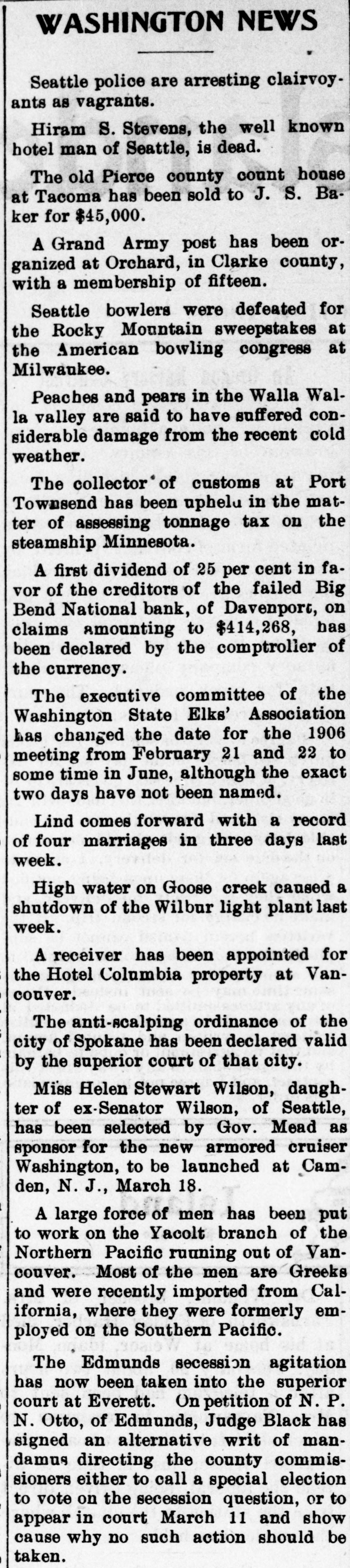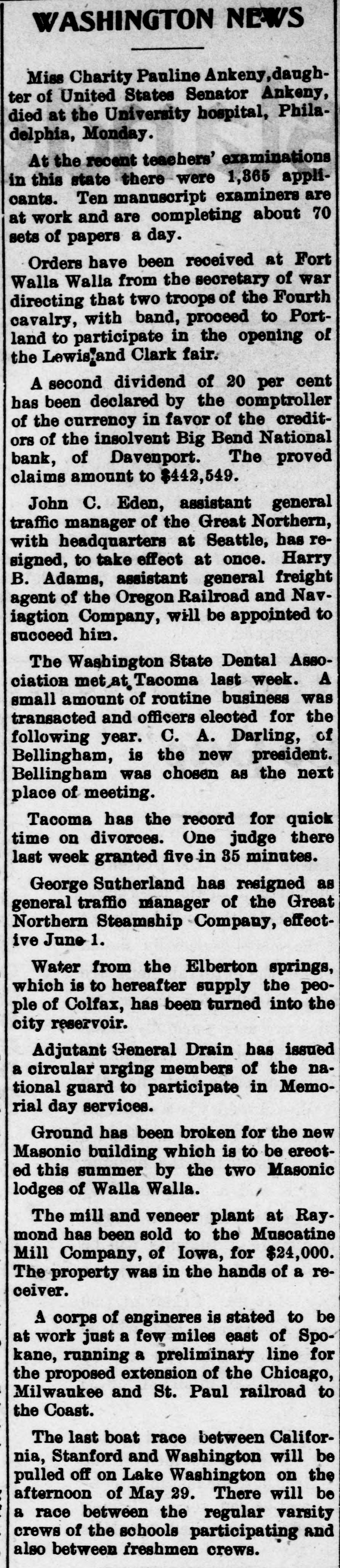 NEWS IN SHORT ORDER. The Latest Happenings Condensed for Rapid Reading. Domestic. M. Delcasse, the French foreign minister, protested in the Chamber of Deputies against the criticism of the Franco-Russian alliance in the report of the committee on the foreign budget. Continuous heavy rains interfere with the inspection of the Panama Canal zone by the American congressional party. The members had a conference with President Amador. Samuel Gompers was re-elected president of the American Federation of Labor, only one delegate in the San Francisco convention, a socialist leader, voting against him. Mrs. Rosie Lusander, aged 25 years, wat shot and killed in Philadelphia by her husband, to whom she had been married but two months. The body of Mrs. Emma Brigham, of Leicester, Mass., was found in the woods covered with leaves. She had been murdered. Arrangements have been made for beginning the work of dismantling the World's Fair promptly on December I. Frank Brady, against whom several charges were pending, was shot and killed by officers at Rock Creek, near Bonita, Mont. The Big Bend National Bank of Davenport, Wash., was closed by direction of the Comptroller of the Currency. Mrs. Maria B. Wilkes, the oldest actress in the country, died in the Prince of Peace Hospital in Philadelphia. The National Grange decided in Portland, Ore., to hold the next annual session in the State of New Jersey. Otis Loveland was electrocuted in Columbus, O., for the murder of Geo Geyer, a farmer, near Alton. By the overturning of a patrol wagon in New York several policemen were seriously. injured. The Union Pacific Railroad is reported to have bought the Chicago Great Western. Frank Duncan, a notorious safeblower, was hanged in Birmingham, Ala., for murder. The United States South Atlantic Squadron sailed from Rio Janeiro for Bahia. A fire in a Chinese tenement in New York caused something of a panic. A Confederate monument was unveiled in Eufaula, Ala. James Wallace, who was secretary to James Breitung, of Marquette, Mich., and who was accused of stealing $30,000 worth of securities from him, was arrested in Liverpool. The American barkentine Webfoot, waterlogged and dismasted. arrived at Astoria, Ore, with three of her crew missing and the survivors exhausted. Col. William Moore, once prominent in Tennessee politics, died at his home, in Nashville, Tenn. He was 74 years old. The apartments of Prince Fushimi were robbed while the Prince and his attendants were at the World's Fair. Milt Shaw, a prominent lawyer, of Hickman, Ky., shot and killed his uncle, Robert Buck. The plea is selfdefense. Four men were drowned from a rowboat while being ferried from Port Huron, Mich., to Sarnia, Ont. - The congressional committee has arrived at Panama to make a study of canal conditions. The grand jury of Tonawanda. Pa.,