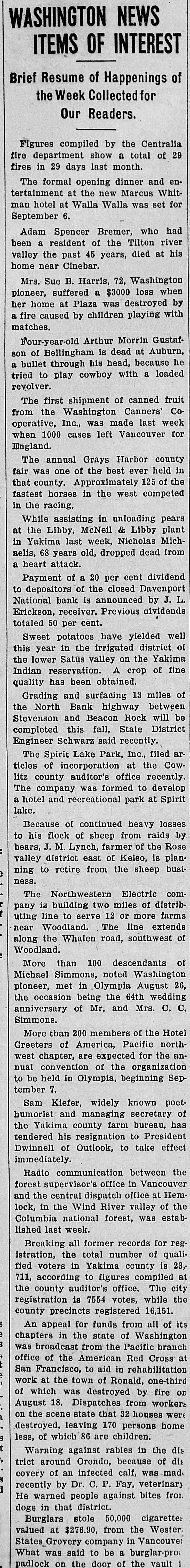 WASHINGTON NEWS ITEMS OF INTEREST Brief Resume of Happenings of the Week Collected for Our Readers. Figures compiled by the Centralia fire department show a total of 29 fires in 29 days last month. The formal opening dinner and entertainment at the new Marcus Whitman hotel at Walla Walla was set for September 6. Adam Spencer Bremer, who had been a resident of the Tilton river valley the past 45 years, died at his home near Cinebar. Mrs. Sue B. Harris, 72, Washington pioneer, suffered a $3000 loss when her home at Plaza was destroyed by a fire caused by children playing with matches. Four-year-old Arthur Morrin Gustafson of Bellingham is dead at Auburn, a bullet through his head, because he tried to play cowboy with a loaded revolver. The first shipment of canned fruit from the Washington Canners' Cooperative, Inc., was made last week when 1000 cases left Vancouver for England. The annual Grays Harbor county fair was one of the best ever held in that county. Approximately 125 of the fastest horses in the west competed in the racing. While assisting in unloading pears at the Libby, McNeil & Libby plant in Yakima last week, Nicholas Michaelis, 68 years old, dropped dead from a heart attack. Payment of a 20 per cent dividend to depositors of the closed Davenport National bank is announced by J. L. Erickson, receiver. Previous dividends totaled 50 per cent. Sweet potatoes have yielded well this year in the irrigated district of the lower Satus valley on the Yakima Indian reservation. A crop of fine quality has been obtained. Grading and surfacing 13 miles of the North Bank highway between Stevenson and Beacon Rock will be completed this fall, State District Engineer Schwarz said recently. The Spirit Lake Park, Inc., filed articles of incorporation at the Cowlitz county auditor's office recently. The company was formed to develop a hotel and recreational park at Spirit lake. Because of continued heavy losses to his flock of sheep from raids by bears, J. M. Lynch, farmer of the Rose valley district east of Kelso, is planning to retire from the sheep business. The Northwestern Electric company is building two miles of distributing line to serve 12 or more farms near Woodland. The line extends along the Whalen road, southwest of Woodland. More than 100 descendants of Michael Simmons, noted Washington pioneer, met in Olympia August 26, the occasion being the 64th wedding anniversary of Mr. and Mrs. C. C. Simmons. More than 200 members of the Hotel Greeters of America, Pacific northwest chapter, are expected for the annual convention of the organization to be held in Olympia, beginning September 7. Sam Kiefer, widely known poethumorist and managing secretary of the Yakima county farm bureau, has tendered his resignation to President Dwinnell of Outlook, to take effect immediately. Radio communication between the forest supervisor's office in Vancouver and the central dispatch office at Hemlock, in the Wind River valley of the Columbia national forest, was established last week. Breaking all former records for registration, the total number of qualified voters in Yakima county is 23,711, according to figures compiled at the county auditor's office. The city registration is 7554 votes, while the county precincts registered 16,151. An appeal for funds from all of its chapters in the state of Washington was broadcast from the Pacific branch office of the American Red Cross at San Francisco, to aid in rehabilitation work at the town of Ronald, one-third of which was destroyed by fire on August 18. Dispatches from workers on the scene state that 32 houses were destroyed, leaving 170 persons home less, of which 86 are children. Warning against rabies in the dis trict around Orondo, because of dis covery of an infected calf, was mad. recently by Dr. C. P. Fay, veterinary He warned people against bites froi dogs in that district.
