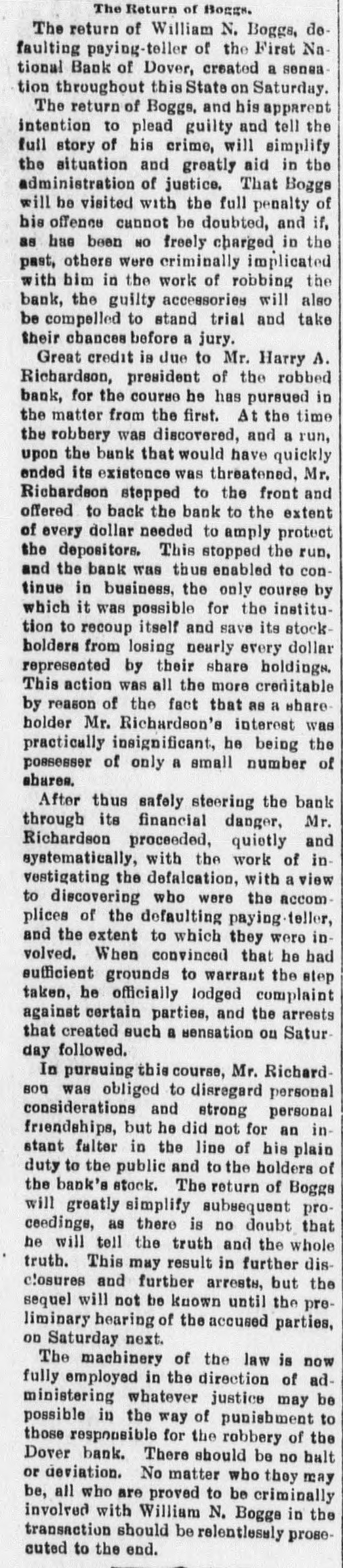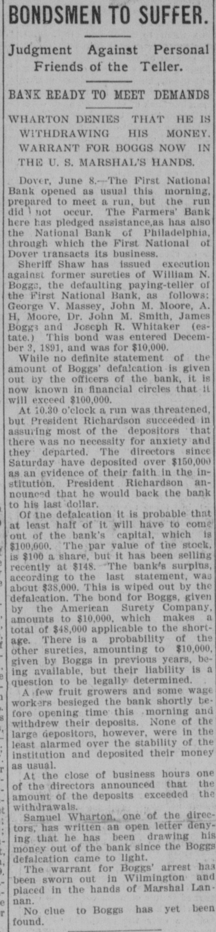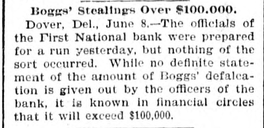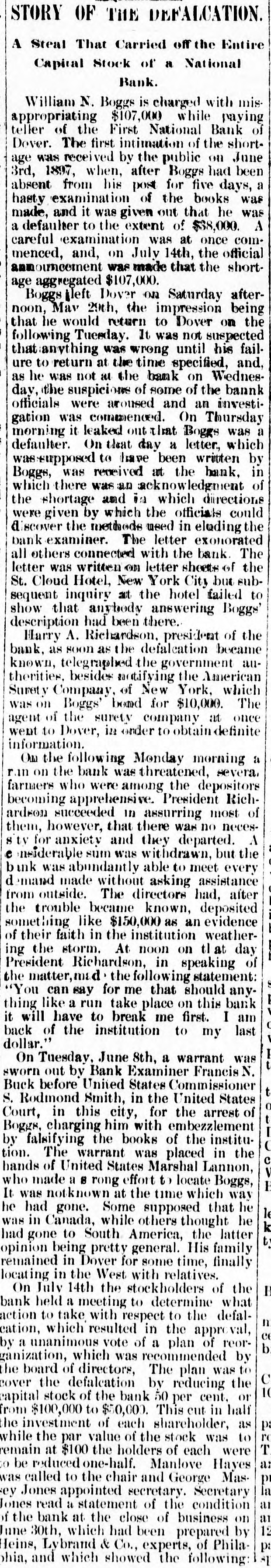 STORY OF THE DEFALCATION. A Steal That Carried off the Entire Bank. Capital Stock of a National N. Boggs is charged with mis William $107,000 while Bank paying of teller appropriating of The the first First intimation National of the on short- June was received after Boggs had 1897, his post for five was a age 3rd, Dover. from when, by the public the books days, been absent examination of out that he was A the made, hasty and it was given extent of $38,000. careful a defaulter examination to July was 14th, at the once official comannouncement menced, and, was on made that the shortage Boggs aggregated May left 29th, Dover $107,000. the on impression Saturday Dover on being after- the noon, he would return to not suspected that Tuesday. It was until his failfollowing was wrong specified, and, to not at the the bannk that anything ure he was return at the time bank of on Wednesday, as the suspicious aroused of some and an investiofficials were commenced. On Thursday was a gation was it leaked out that a Boggs letter, which morning On that day written by defaulter. was+upposed received to have at been the bank, in of Boggs, was was an acknowledgment directions which there and in which could the shortage given by which the officials in eluding the discover were the methods The used letter exonorated bank examiner. with the bank The all others connected on letter sheet# of sub- the letter was written York City but St. Cloud Hotel, New at the hotel failed to sequent that inquiry anybody answering Boggs show had been there. of the description Richardson. president became known, matifying the bank, Harry as telegraphed A. soon as the the defalcation government American aubesides New York, Surety bond for therities, Company Boggs of $10,000. at which once The went agent was on to of Dover, the surety in order company to obtain definite information. following Monday morning severa. a Ow the bank was threatened, depositore ran on the who were among President the Richfarmers becoming apprehensive. in assurring most ardson that there was them, however, succeeded and they departed. no but neces- the A of 8 tv for anxiety sum was withdrawn, every e insiderable abundantly able to meet assistance bank demand was made without The directors asking had, after from trouble outside. became known, an deposited evidence the like $150,000 as weathersomething faith in the institution on tlat day of their At noon of ing the storm. Richardson, in speaking statement: President the following anythe matter, say for me that should this bank "You like can run take place on first. I am thing have a to break me last back it will of the institution to my dollar." June 8th, a warrant Francis was N. On Tuesday, out by Bank Examiner Commissioner sworn before United States United States Buck Rodmond Smith, in the the arrest of S. this city, for embezzlement Court, charging in him with of the instituBoggs, the books in the by falsifying warrant was placed Lannon, tion. of The United States Marshal to locate Boggs, hands made a S rong effort which way who It was notknown Some at the supposed time that he he he had Canada, gone. while others thought the latter was in to South America, His family opinion had gone being pretty for general. some time, in the West with of B remained locating in Dover stockholders relatives. finally the 14th the what On July a meeting to determine the defalbank held with respect to val, action to which take resulted in the appro of cation, unanimous vote of recommended a plan reor- by by a which was The plan was to ganization, the board of defalcation directors, by reducing cent. the or cover the stock of the bank 50 This per cut in half from capital $100,000 to $50,000. each shareholder, as to the investment the par value of of the stock of each was were $100 the holders pt be reduced and George la while remain to at to the one-half. chair Manlove Secretary Hayes Maswas Jones called appointed secretary. of the condition Jones ey read a statement the close of business by on of the 30th, bank which at had been prepared of Phila June Lybrand & Co., experts, following phia, Heins, and which showed the