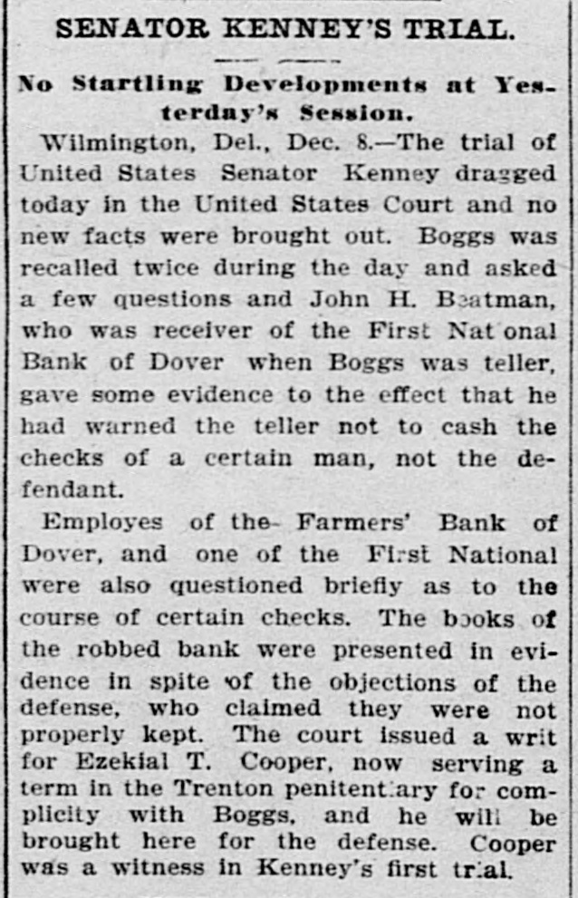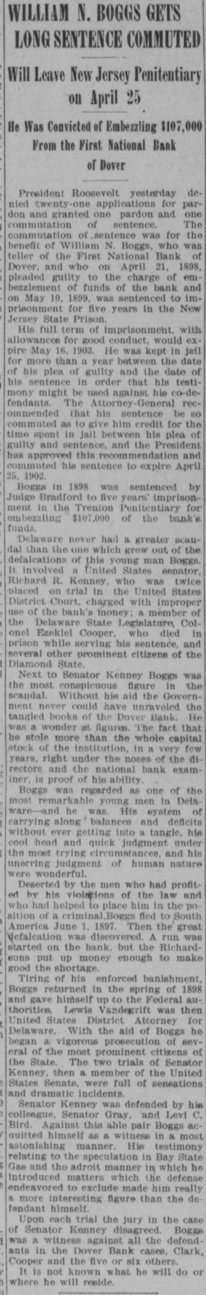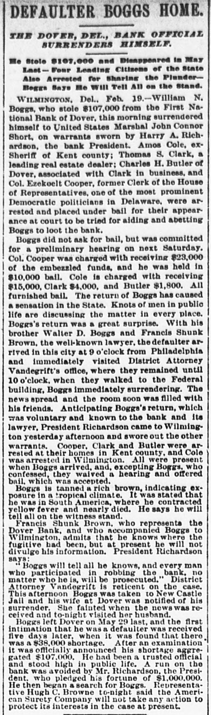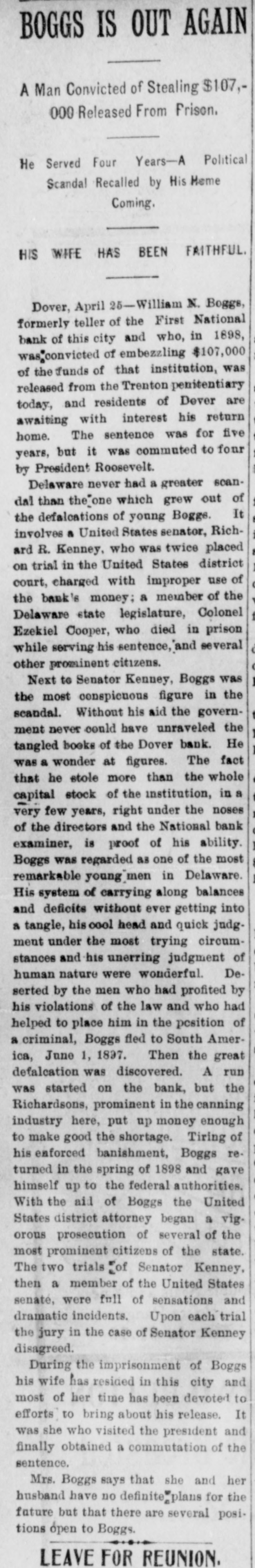 STORY OF THE DEFALCATION. A Steal That Carried off the Entire Bank. Capital Stock of a National N. Boggs is charged with mis William $107,000 while Bank paying of teller appropriating of The the first First intimation National of the on short- June was received after Boggs had 1897, his post for five was a age 3rd, Dover. from when, by the public the books days, been absent examination of out that he was A the made, hasty and it was given extent of $38,000. careful a defaulter examination to July was 14th, at the once official comannouncement menced, and, was on made that the shortage Boggs aggregated May left 29th, Dover $107,000. the on impression Saturday Dover on being after- the noon, he would return to not suspected that Tuesday. It was until his failfollowing was wrong specified, and, to not at the the bannk that anything ure he was return at the time bank of on Wednesday, as the suspicious aroused of some and an investiofficials were commenced. On Thursday was a gation was it leaked out that a Boggs letter, which morning On that day written by defaulter. was+upposed received to have at been the bank, in of Boggs, was was an acknowledgment directions which there and in which could the shortage given by which the officials in eluding the discover were the methods The used letter exonorated bank examiner. with the bank The all others connected on letter sheet# of sub- the letter was written York City but St. Cloud Hotel, New at the hotel failed to sequent that inquiry anybody answering Boggs show had been there. of the description Richardson. president became known, matifying the bank, Harry as telegraphed A. soon as the the defalcation government American aubesides New York, Surety bond for therities, Company Boggs of $10,000. at which once The went agent was on to of Dover, the surety in order company to obtain definite information. following Monday morning severa. a Ow the bank was threatened, depositore ran on the who were among President the Richfarmers becoming apprehensive. in assurring most ardson that there was them, however, succeeded and they departed. no but neces- the A of 8 tv for anxiety sum was withdrawn, every e insiderable abundantly able to meet assistance bank demand was made without The directors asking had, after from trouble outside. became known, an deposited evidence the like $150,000 as weathersomething faith in the institution on tlat day of their At noon of ing the storm. Richardson, in speaking statement: President the following anythe matter, say for me that should this bank "You like can run take place on first. I am thing have a to break me last back it will of the institution to my dollar." June 8th, a warrant Francis was N. On Tuesday, out by Bank Examiner Commissioner sworn before United States United States Buck Rodmond Smith, in the the arrest of S. this city, for embezzlement Court, charging in him with of the instituBoggs, the books in the by falsifying warrant was placed Lannon, tion. of The United States Marshal to locate Boggs, hands made a S rong effort which way who It was notknown Some at the supposed time that he he he had Canada, gone. while others thought the latter was in to South America, His family opinion had gone being pretty for general. some time, in the West with of B remained locating in Dover stockholders relatives. finally the 14th the what On July a meeting to determine the defalbank held with respect to val, action to which take resulted in the appro of cation, unanimous vote of recommended a plan reor- by by a which was The plan was to ganization, the board of defalcation directors, by reducing cent. the or cover the stock of the bank 50 This per cut in half from capital $100,000 to $50,000. each shareholder, as to the investment the par value of of the stock of each was were $100 the holders pt be reduced and George la while remain to at to the one-half. chair Manlove Secretary Hayes Maswas Jones called appointed secretary. of the condition Jones ey read a statement the close of business by on of the 30th, bank which at had been prepared of Phila June Lybrand & Co., experts, following phia, Heins, and which showed the