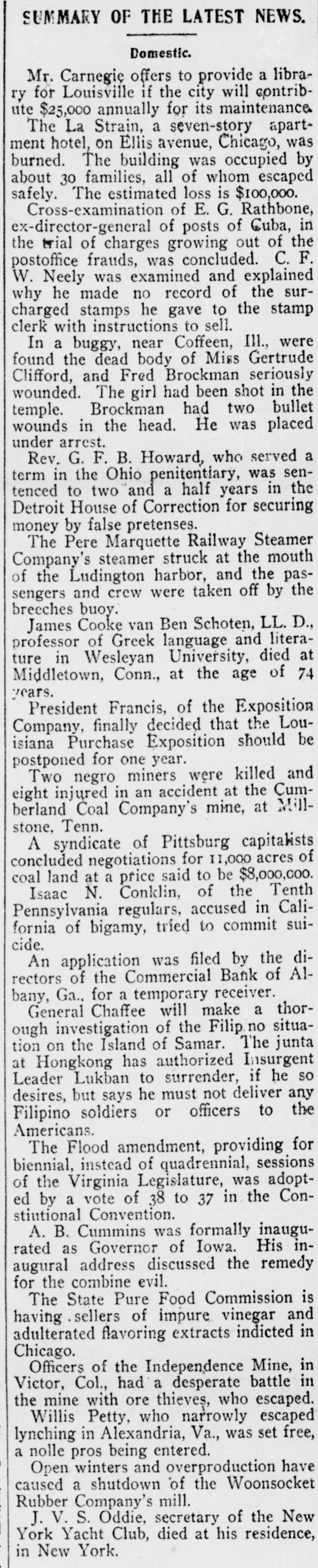 SUMMARY OF THE LATEST NEWS. Domestic. Mr. Carnegie offers to provide a library for Louisville if the city will contribute $25,000 annually for its maintenance. The La Strain, a seven-story apartment hotel, on Ellis avenue, Chicago, was burned. The building was occupied by about 30 families, all of whom escaped safely. The estimated loss is $100,000. Cross-examination of E. G. Rathbone, ex-director-general of posts of Guba, in the trial of charges growing out of the postoffice frauds, was concluded. C. W. Neely was examined and explained surto stamp charged why he stamps made no he record gave of the the clerk with instructions to sell. In a buggy, near Coffeen, III., were found the dead body of Miss Gertrude Clifford, and Fred Brockman seriously wounded. The girl had been shot in the temple. Brockman had two bullet wounds in the head. He was placed under arrest. Rev. G. F. B. Howard, who served a term in the Ohio penitentiary, was sentenced to two and a half years in the Detroit House of Correction for securing money by false pretenses. The Pere Marquette Railway Steamer Company's steamer struck at the mouth of the Ludington harbor, and the passengers and crew were taken off by the breeches buoy. James Cooke van Ben Schoten, LL.D., professor of Greek language and literature in Wesleyan University, died at Middletown, Conn., at the age of 74 years. President Francis, of the Exposition Company, finally decided that the Louisiana Purchase Exposition should be postponed for one year. Two negro miners were killed and eight injured in an accident at the Cumberland Coal Company's mine, at Millstone. Tenn. A syndicate of Pittsburg capitalists concluded negotiations for 11,000 acres of coal land at a price said to be $8,000,000. Isaac N. Conklin, of the Tenth Pennsylvania regulars, accused in California of bigamy, tried to commit suicide. An application was filed by the directors of the Commercial Bank of A1bany, Ga., for a temporary receiver. General Chaffee will make a thorough investigation of the Filip no situation on the Island of Samar. The junta at Hongkong has authorized Insurgent Leader Lukban to surrender, if he so desires, but says he must not deliver any Filipino soldiers or officers to the Americans. The Flood amendment, providing for biennial, instead of quadrennial, sessions of the Virginia Legislature, was adopted by a vote of 38 to 37 in the Constiutional Convention. A. B. Cummins was formally inaugurated as Governor of Iowa. His inaugural address discussed the remedy for the combine evil. The State Pure Food Commission is having sellers of impure vinegar and adulterated flavoring extracts indicted in Chicago. Officers of the Independence Mine, in Victor, Col., had a desperate battle in the mine with ore thieves, who escaped. Willis Petty, who narrowly escaped lynching in Alexandria, Va., was set free, a nolle pros being entered. Open winters and overproduction have caused a shutdown 'of the Woonsocket Rubber Company's mill. J. V. S. Oddie, secretary of the New York Yacht Club, died at his residence, in New York.