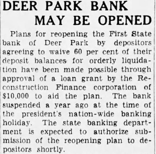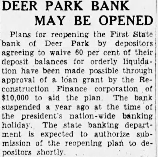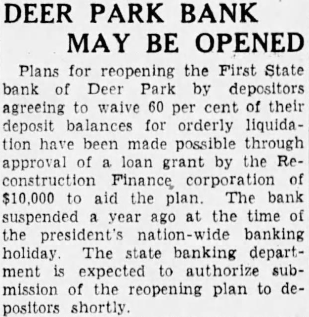 Plans for reopening the First State bank Deer Park by depositors agreeing to waive 60 per cent their deposit balances for orderly liquida made possible through approval loan grant by Reconstruction Finance corporation $10,000 aid the suspended year the time president's banking holiday banking department expected authorize mission of the reopening plan to depositors shortly
