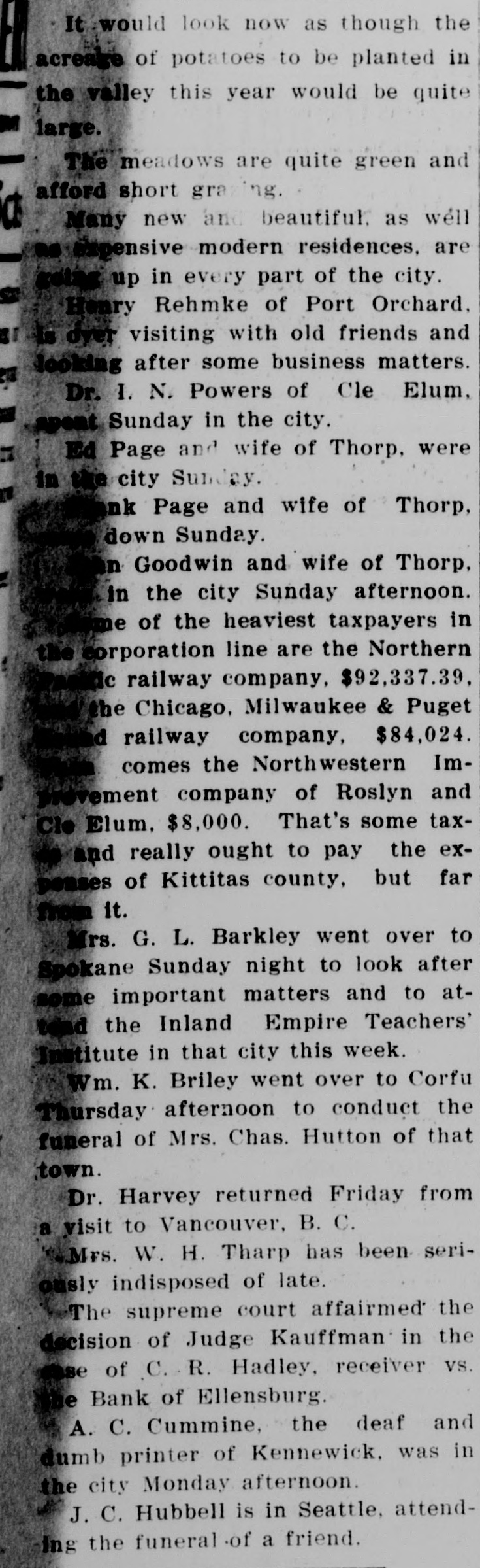 It would look now as though the acreage of potatoes to be planted in the valley this year would be quite large. The meadows are quite green and afford short graing. Many new and beautiful, as well as expensive modern residences, are going up in every part of the city. Henry Rehmke of Port Orchard, is over visiting with old friends and looking after some business matters. Dr. I. N. Powers of Cle Elum, spent Sunday in the city. Ed Page and wife of Thorp, were in the city Sunday. Frank Page and wife of Thorp, down Sunday. John Goodwin and wife of Thorp, in the city Sunday afternoon. Some of the heaviest taxpayers in the corporation line are the Northern Pacific railway company, $92,337.39, the Chicago, Milwaukee & Puget Sound railway company, $84,024. Next comes the Northwestern Improvement company of Roslyn and Cle Elum, $8,000. That's some tax- and really ought to pay the expenses of Kittitas county, but far from it. Mrs. G. L. Barkley went over to Spokane Sunday night to look after some important matters and to attend the Inland Empire Teachers' Institute in that city this week. Wm. K. Briley went over to Corfu Thursday afternoon to conduct the funeral of Mrs. Chas. Hutton of that town. Dr. Harvey returned Friday from a visit to Vancouver, B. C. Mrs. W. H. Tharp has been seriously indisposed of late. The supreme court affirmed the decision of Judge Kauffman in the case of C. R. Hadley, receiver vs. the Bank of Ellensburg. A. C. Cummine, the deaf and dumb printer of Kennewick, was in the city Monday afternoon. J. C. Hubbell is in Seattle, attending the funeral of a friend.