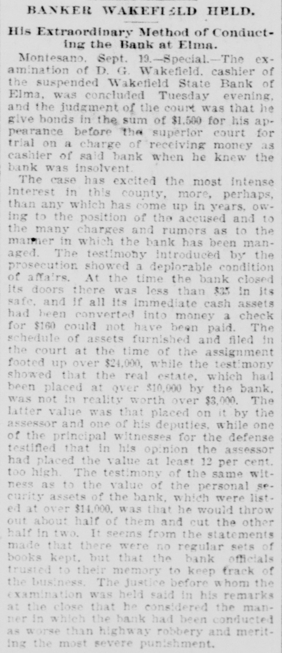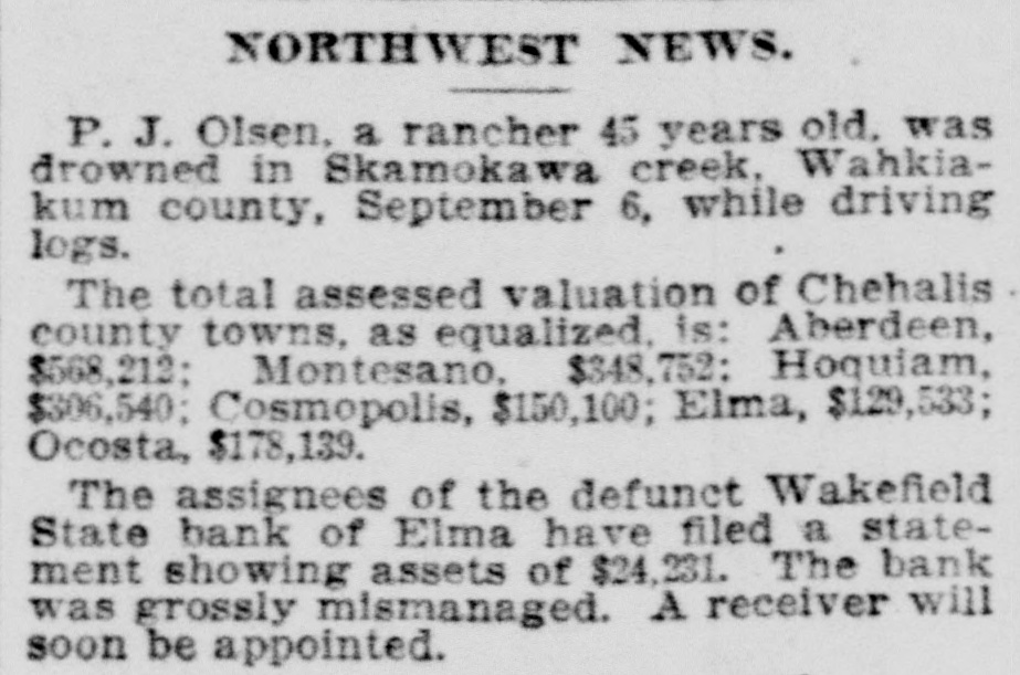 NORTHWEST NEWS. P. J. Olsen. a rancher 45 years old. was drowned in Skamokawa creek, Wahkiakum county, September 6, while driving logs. The total assessed valuation of Chehalis county towns, as equalized, is: Aberdeen, $568,212; Montesano, $348,752: Hoquiam, $306,540; Cosmopolis, $150,100; Elma, $129,533; Ocosta, $178,139. The assignees of the defunct Wakefield State bank of Elma have filed a statement showing assets of $24,231. The bank was grossly mismanaged. A receiver will soon be appointed.