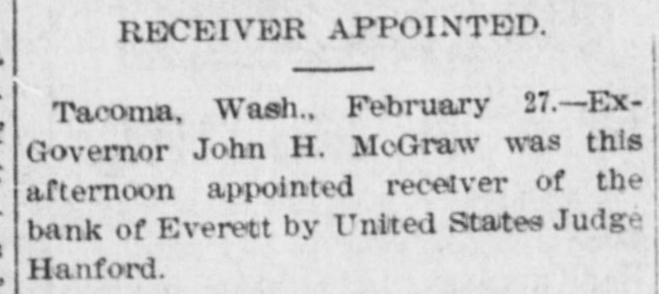RECEIVER APPOINTED. Tacoma, Wash., February 27.-ExGovernor John H. McGraw was this afternoon appointed receiver of the bank of Everett by United States Judge Hanford.