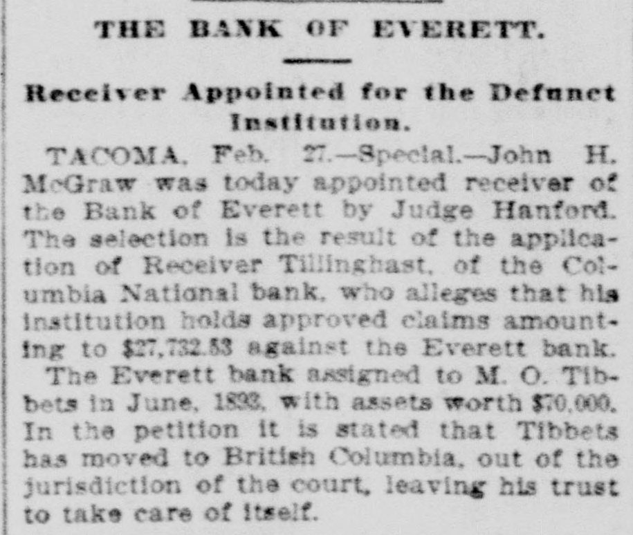THE BANK OF EVERETT. Receiver Appointed for the Defunct Institution. TACOMA. Feb. 27.-Special.John H. McGraw was today appointed receiver of the Bank of Everett by Judge Hanford. The selection is the result of the application of Receiver Tillinghast. of the Columbia National bank. who alleges that his institution holds approved claims amounting to $27,732.53 against the Everett bank. The Everett bank assigned to M. O. Tibbets in June, 1833, with assets worth $70,000. In the petition it is stated that Tibbets has moved to British Columbia, out of the jurisdiction of the court, leaving his trust to take care of itself.
