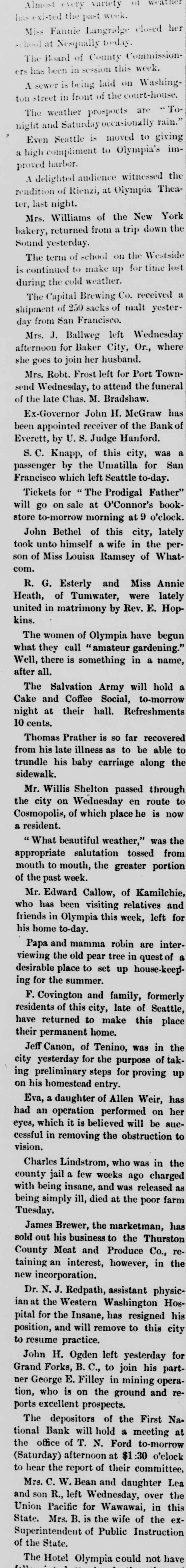 The weather prospocts are Tonight and Saturday occasionally rain." Even Seattle is moved to giving a high compliment to Olympia's improved harbor. A delighted audience witnessed the rendition of Rienzi, at Olympia Theater, last night. Mrs. Williams of the New York bakery, returned from a trip down the Sound yesterday. The term of school on the Westside is continued to make up for time lost during the cold weather. The Capital Brewing Co. received a shipment of 250 sacks of malt yesterday from San Francisco. Mrs. J. Ballweg left Wednesday afternoon for Baker City, Or., where she goes to join her husband. Mrs. Robt. Frost left for Port Townsend Wednesday, to attend the funeral of the late Chas. M. Bradshaw. Ex-Governor John H. McGraw has been appointed receiver of the Bank of Everett, by U.S. Judge Hanford. S.C. Knapp, of this city, was a passenger by the Umatilla for San Francisco which left Seattle to-day. Tickets for The Prodigal Father" will go on sale at O'Connor's bookstore to-morrow morning at 9 o'clock. John Bethel of this city, lately took unto himself a wife in the person of Miss Louisa Ramsey of Whatcom. R. G. Esterly and Miss Annie Heath, of Tumwater, were lately united in matrimony by Rev. E. Hopkins. The women of Olympia have begun what they call "amateur gardening." Well, there is something in a name, after all. The Salvation Army will hold a Cake and Coffee Social, to-morrow night at their hall. Refreshments 10 cents. Thomas Prather is so far recovered from his late illness as to be able to trundle his baby carriage along the sidewalk. Mr. Willis Shelton passed through the city on Wednesday en route to Cosmopolis, of which place he is now a resident. " What beautiful weather," was the appropriate salutation tossed from mouth to mouth, the greater portion of the past week. Mr. Edward Callow, of Kamilchie, who has been visiting relatives and friends in Olympia this week, left for his home to-day. Papa and mamma robin are interviewing the old pear tree in quest of a desirable place to set up house-keeping for the summer. F. Covington and family, formerly residents of this city, late of Seattle, have returned to make this place their permanent home. Jeff Canon, of Tenino, was in the city yesterday for the purpose of taking preliminary steps for proving up on his homestead entry. Eva, a daughter of Allen Weir, has had an operation performed on her eyes, which it is believed will be successful in removing the obstruction to vision. Charles Lindstrom, who was in the county jail a few weeks ago charged with being insane, and was released as being simply ill, died at the poor farm Tuesday. James Brewer, the marketman, has sold out his business to the Thurston County Meat and Produce Co., retaining an interest, however, in the new incorporation. Dr. N. J. Redpath, assistant physician at the Western Washington Hospital for the Insane, has resigned his position, and will remove to this city to resume practice. John H. Ogden left yesterday for Grand Forks, B.C., to join his partner George E. Filley in mining operation, who is on the ground and reports excellent prospects. The depositors of the First National Bank will hold a meeting at the office of T. N. Ford to-morrow (Saturday) afternoon at $1:30 o'clock