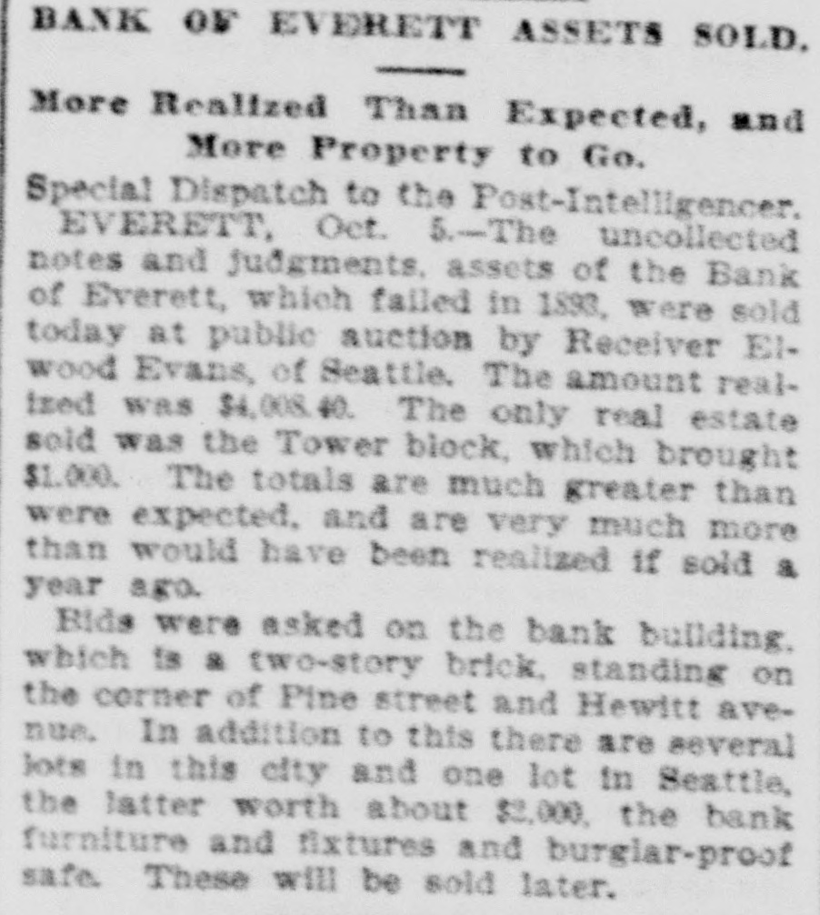 BANK OF EVERETT ASSETS SOLD. More Realized Than Expected, and More Property to Go. Special Dispatch to the Post-Intelligencer. EVERETT, Oct. 5.-The uncollected notes and judgments, assets of the Bank of Everett, which failed in 1893, were sold today at public auction by Receiver Elwood Evans, of Seattle. The amount realtred was $4,008.40. The only real estate sold was the Tower block, which brought $1.000. The totals are much greater than were expected, and are very much more than would have been realized if sold a year ago. Bids were asked on the bank building. which is & two-story brick, standing on the corner of Pine street and Hewitt avenue. In addition to this there are several lots in this city and one lot in Seattle, the latter worth about $2,000, the bank furniture and fixtures and burgiar-proof safe. These will be sold later.