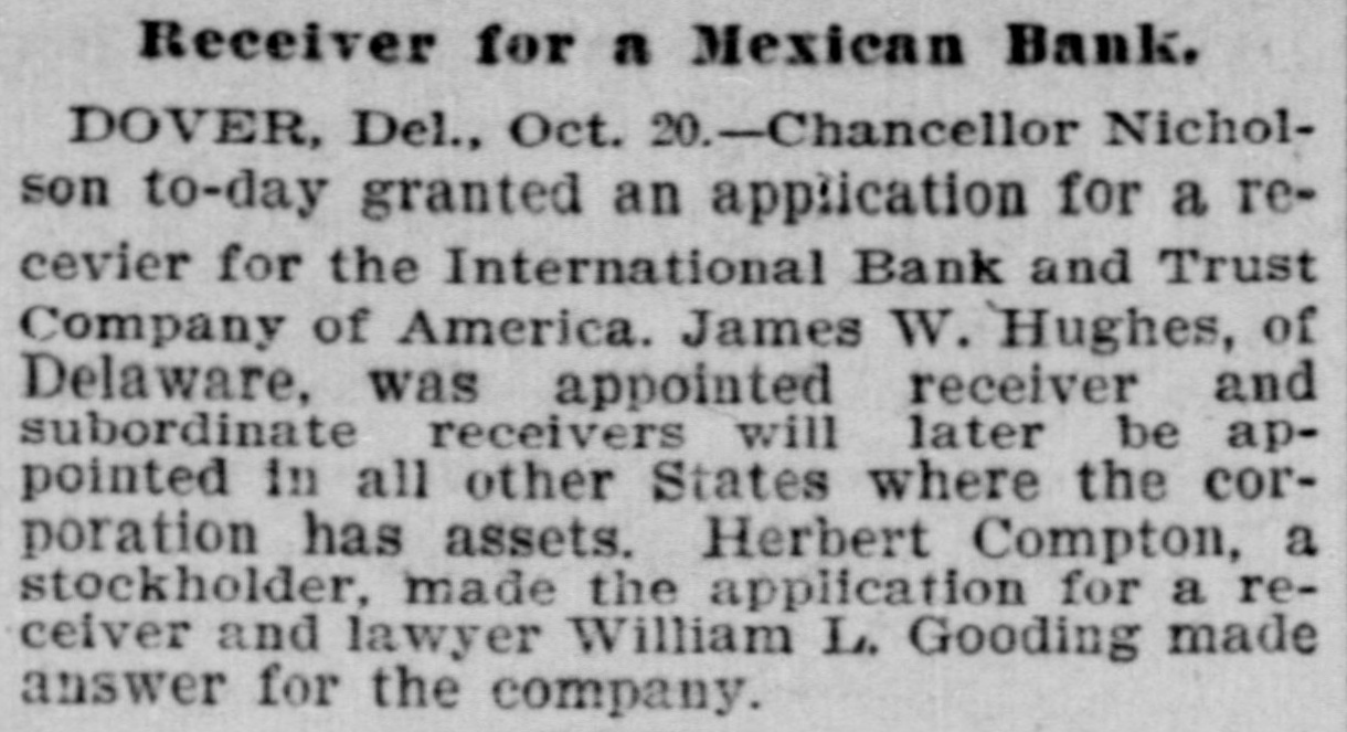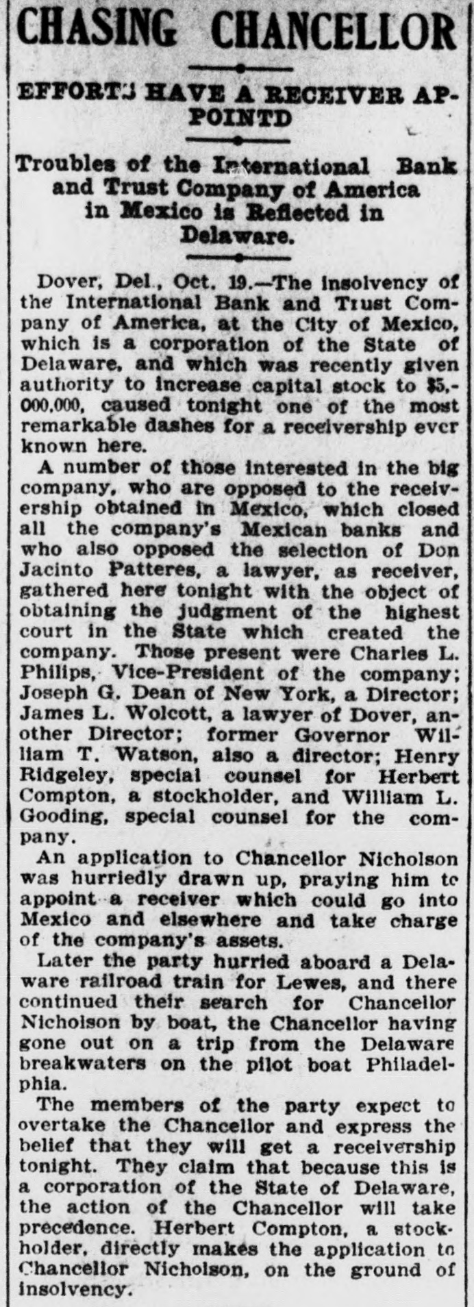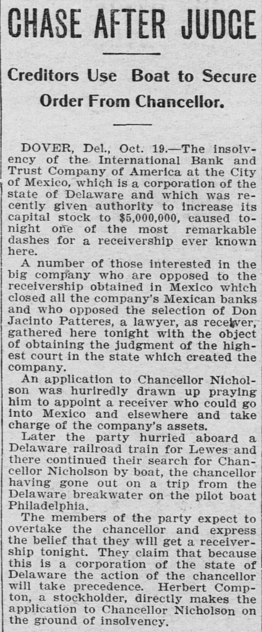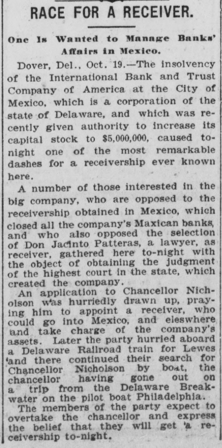 # RACE FOR A RECEIVER. One Is Wanted to Manage Banks' Affairs in Mexico. Dover, Del., Oct. 19. -The insolvency of the International Bank and Trust Company of America at the City of Mexico, which is a corporation of the state of Delaware, and which was recently given authority to increase its capital stock to $5,000,000, caused to-night one of the most remarkable dashes for a receivership ever known here. A number of those interested in the big company, who are opposed to the receivership obtained in Mexico, which closed all the company's Maxican banks, and who also opposed the selection of Don Jacinto Patteras, a lawyer, as receiver, gathered here to-night with the object of obtaining the judgment of the highest court in the state, which created the company. An application to Chancellor Nicholson was hurriedly drawn up, praying him to appoint a receiver, who could go into Mexico, and eleswhere and take charge of the company's assets. Later the party hurried aboard a Delaware Railroad train for Lewes and there continued their search for Chancellor Nicholson by boat, the chancellor having gone out on a trip from the Delaware Breakwater on the pilot boat Philadelphia. The members of the party expect to overtake the chancellor and express the belief that they will get a receivership to-night.