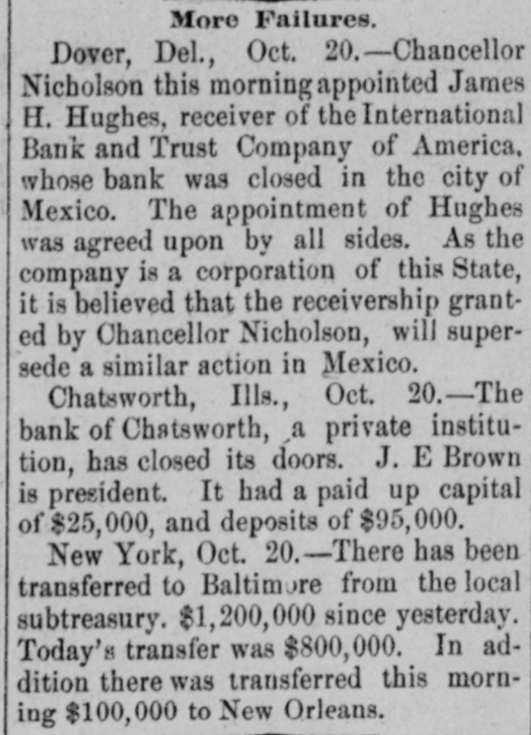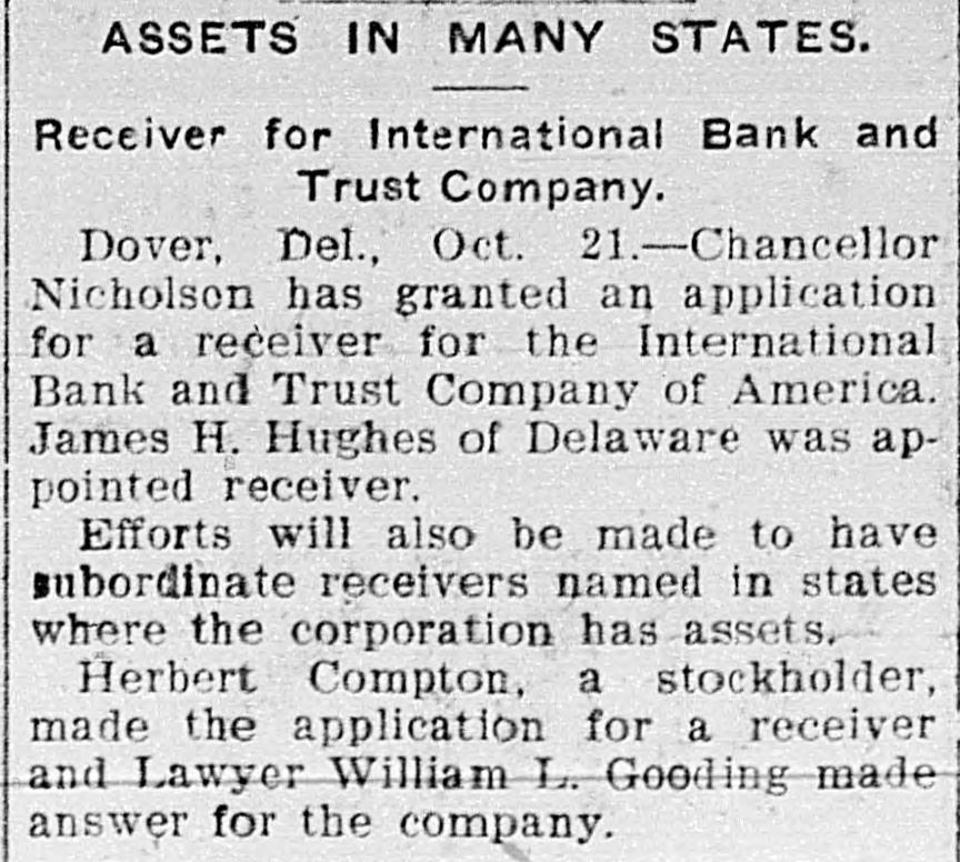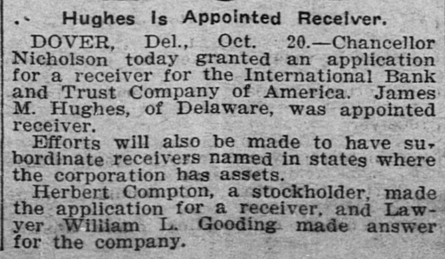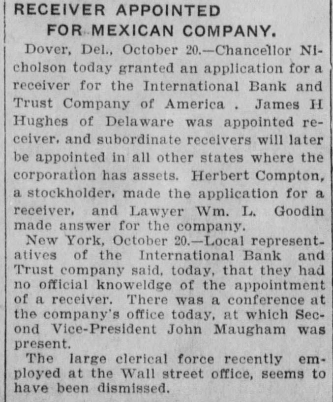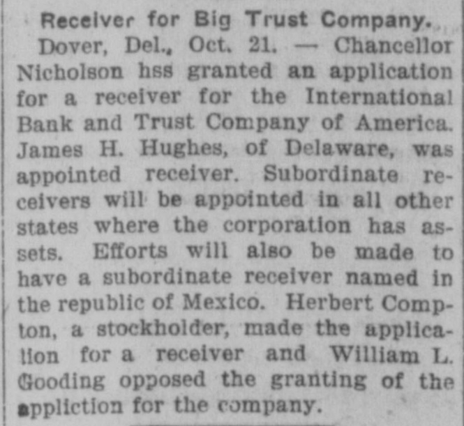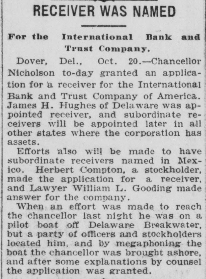 # RACE FOR A RECEIVER. One Is Wanted to Manage Banks' Affairs in Mexico. Dover, Del., Oct. 19. -The insolvency of the International Bank and Trust Company of America at the City of Mexico, which is a corporation of the state of Delaware, and which was recently given authority to increase its capital stock to $5,000,000, caused to-night one of the most remarkable dashes for a receivership ever known here. A number of those interested in the big company, who are opposed to the receivership obtained in Mexico, which closed all the company's Maxican banks, and who also opposed the selection of Don Jacinto Patteras, a lawyer, as receiver, gathered here to-night with the object of obtaining the judgment of the highest court in the state, which created the company. An application to Chancellor Nicholson was hurriedly drawn up, praying him to appoint a receiver, who could go into Mexico, and eleswhere and take charge of the company's assets. Later the party hurried aboard a Delaware Railroad train for Lewes and there continued their search for Chancellor Nicholson by boat, the chancellor having gone out on a trip from the Delaware Breakwater on the pilot boat Philadelphia. The members of the party expect to overtake the chancellor and express the belief that they will get a receivership to-night.