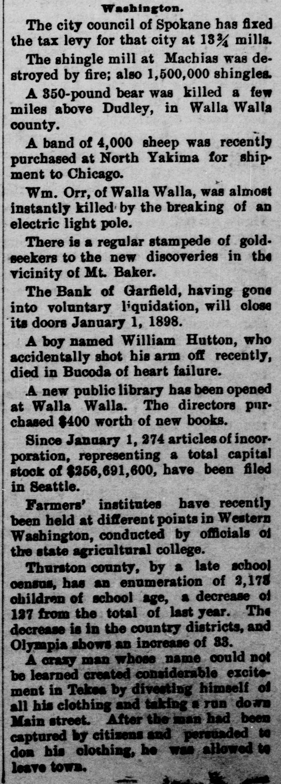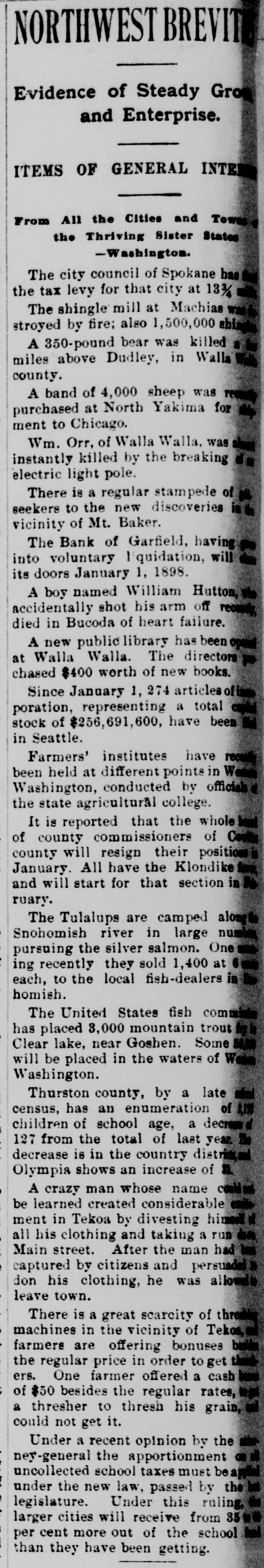 NORTHWEST BREVIT Evidence of Steady Gro and Enterprise. ITEMS OF GENERAL From All the Cities and Toway the Thriving Sister States -Washington. The city council of Spokane has the tax levy for that city at 133/4 The shingle mill at Machias wash stroyed by fire; also 1,500,000 shia A 350-pound bear was killed miles above Dudley, in Walla county. A band of 4,000 sheep was purchased at North Yakima for ment to Chicago. Wm. Orr, of Walla Walla, was almost of instantly killed by the breaking electric light pole. There is a regular stampede of seekers to the new discoveries is vicinity of Mt. Baker. The Bank of Garfield, having into voluntary l'quidation, will its doors January 1, 1898. A boy named William Hutton, who accidentally shot his arm off recently, died in Bucoda of heart failure. A new public library has been opend at Walla Walla. The directors 7 chased $400 worth of new books. Since January 1, 274 articles of inm capital poration, representing a total stock of $256,691,600, have been in Seattle. Farmers' institutes have receatly been held at different points in Weaters Washington, conducted by officials of the state agricultural college. It is reported that the whole band of county commissioners of Cowlits is county will resign their positions January. All have the Klondike Love, and will start for that section in M ruary. The Tulalups are camped along Snohomish river in large number, pursuing the silver salmon. One ing recently they sold 1,400 at 6 each, to the local fish-dealers in homish. The United States fish commin has placed 3,000 mountain trout Clear lake, near Goshen. Some 50,000 will be placed in the waters of Works Washington. Thurston county, by a late census, has an enumeration of 2,198 children of school age, a decrease of 127 from the total of last year. The decrease is in the country districtioni Olympia shows an increase of 33. A crazy man whose name could be learned created considerable of ment in Tekoa by divesting himself all his clothing and taking a run dose Main street. After the man had captured by citizens and persuaded don his clothing, he was allowed to leave town. There is a great scarcity of thre machines in the vicinity of Tekon, farmers are offering bonuses beside the regular price in order to get then ers. One farmer offered a cash togal of $50 besides the regular rates, a thresher to thresh his grain, could not get it. Under a recent opinion by the
