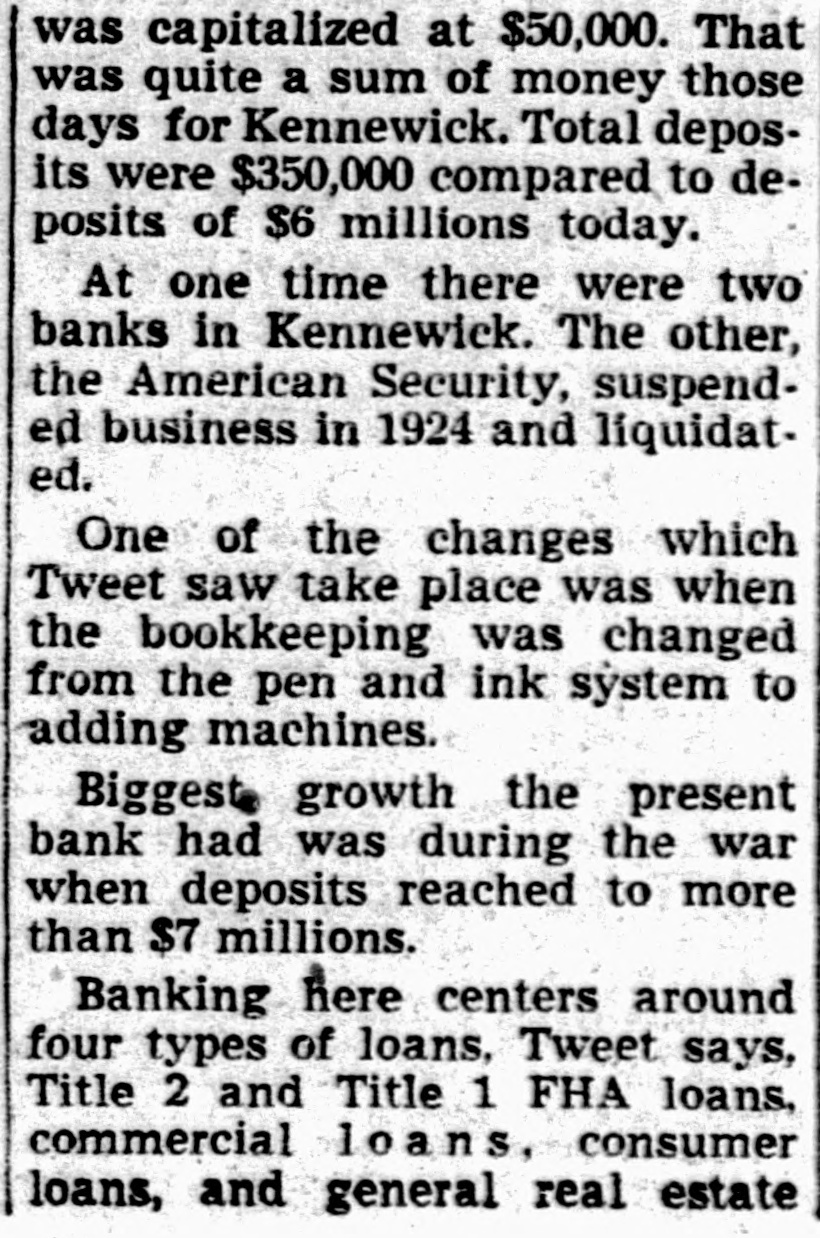was capitalized at $50,000. That was quite a sum of money those days for Kennewick. Total deposits were $350,000 compared to deposits of $6 millions today. At one time there were two banks in Kennewick. The other, the American Security, suspended business in 1924 and liquidated. One of the changes which Tweet saw take place was when the bookkeeping was changed from the pen and ink system to adding machines. Biggest growth the present bank had was during the war when deposits reached to more than $7 millions. Banking here centers around four types of loans, Tweet says, Title 2 and Title 1 FHA loans, commercial loans, consumer loans, and general real estate