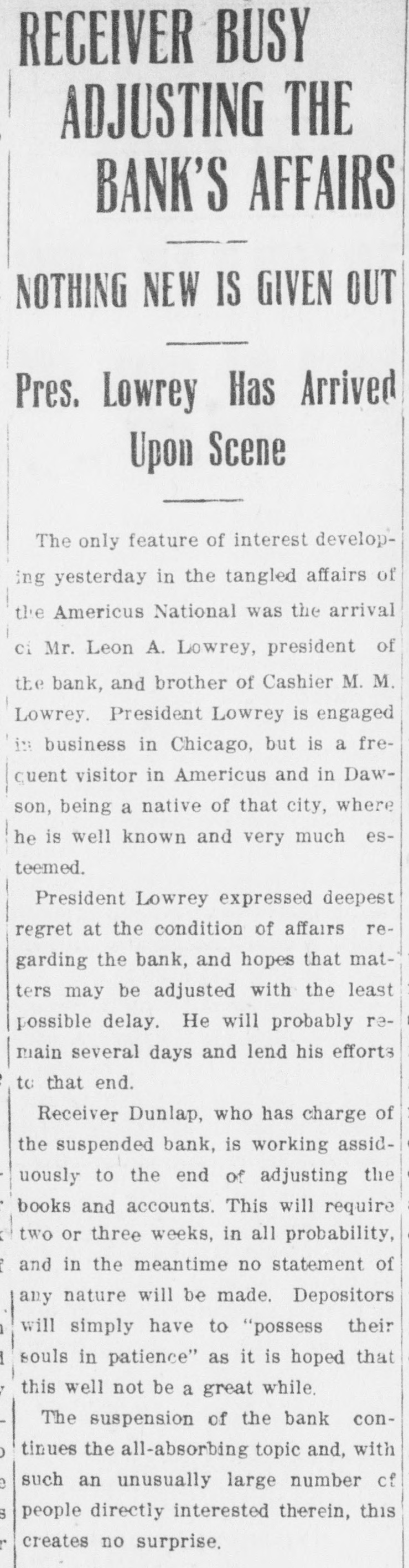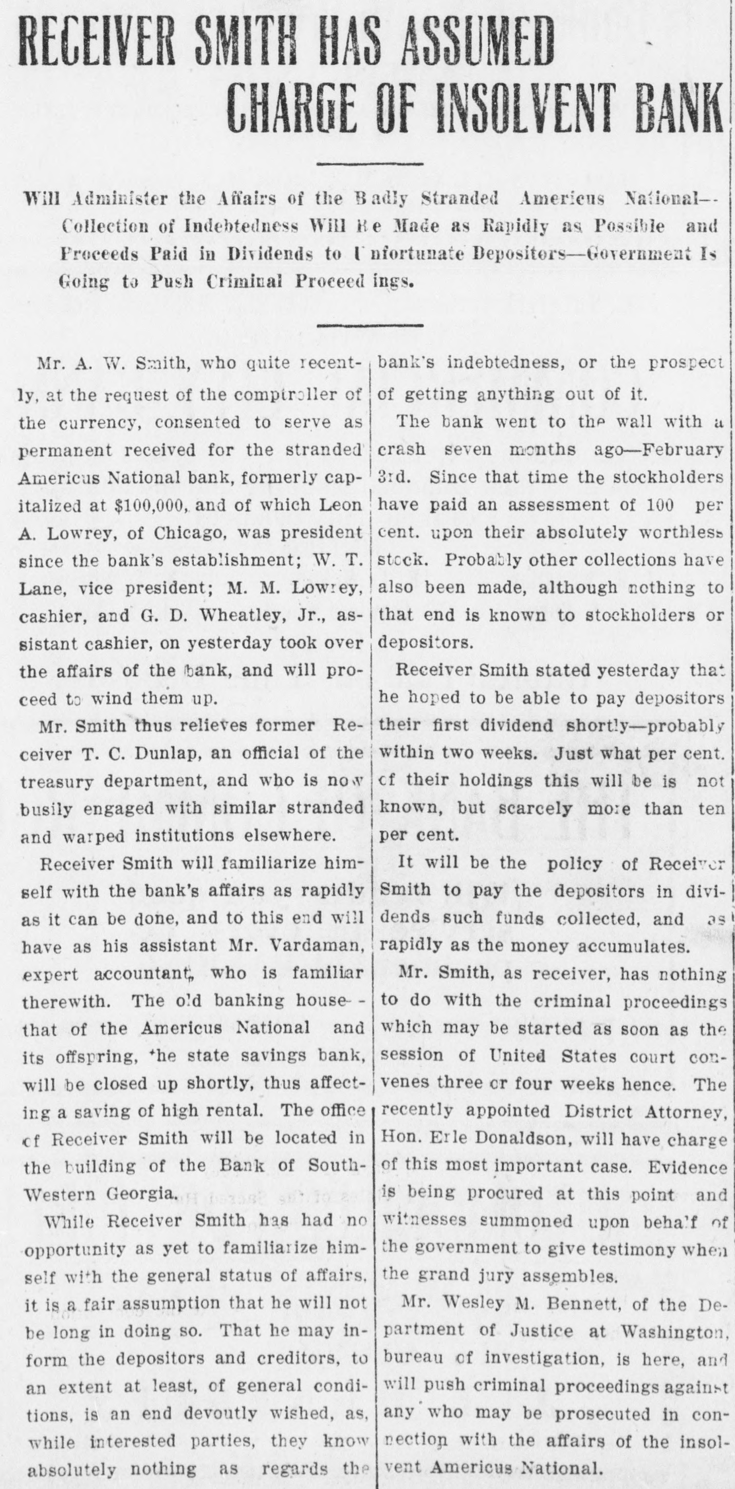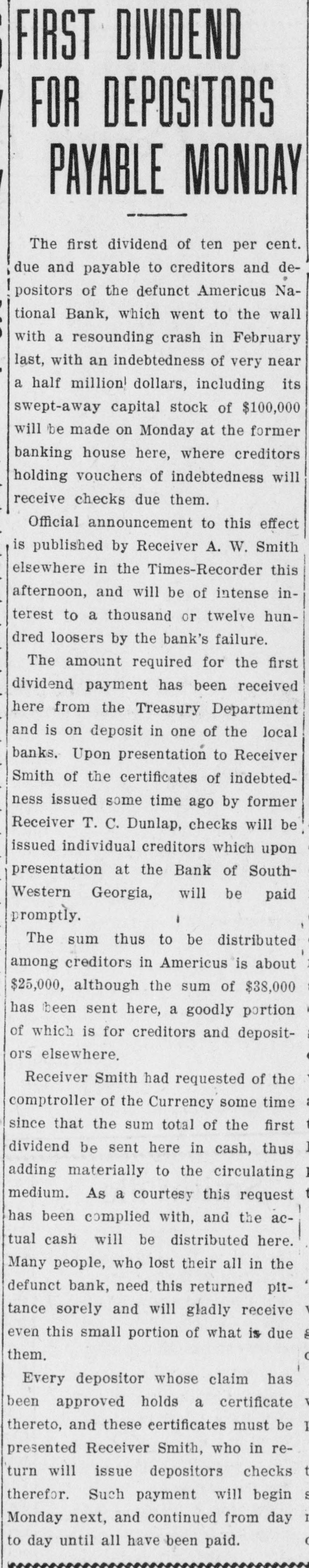 RECEIVERS WILL ADJUST AFFAIRS INSOLVENT BANK 48 part belonging to women, children, and people of small means, all of which WALLIS NAMED seems to have vanished within a brief FAIL OTHER PLANS time. The estimate of $600,000 includRECEIVER FOR es the original capital stock of $100,000, which, it seems, was long ago SIGNALLY dissipated and is now utterly worthSAVINGS BANK less. However, there are proven claims DEPOSITORS WILL REAof depositors amounting to $319,000, LIZE SOME PORTION besides unverified deposits of $35,000. OFFSPRING OF NATION'L BANK In addition, there are other items unThe 'swap song' in the affairs of the der this account of $27,000, making a insolvent and somewhat depleted grand total of $381,000. It is said Americus National Bank which went to His Appointment is Made the amounts due other banks will agthe wall early in February, was sung gregate $110,000. Yesterday yesterday when it was announced that The total liabilities, capitulated, are the final proposition made by depositestimated at about $504,000, besides Judge Z. A. Littlejohn at a late ors to the bank's directors for its the capital stock of $100,000, to be hour yesterday appointed Mr. W. P. liquidation, outside the usual channels added. This is supposed to include the Wallis receiver for the Americus Trust employed by the government, had fall"overdrafts" of about $75,000, the & Savings Bank, an offspring of the en flat. This forlorn hope to which greater portion of which is regarded defunct Americus National, and, prior the depositors had clung, has failed as entirely worthless; probably $10,000 to the closing of that bank ,operated signally. to $12,000 being considered collectaby the same officers. The little saving This being true, Receiver T. C. Dunble. bank was organized under a state lap will continue the work, already Notes held by the bank, good and charter, and had a capital stock of fast progressing, toward liquidating indifferent, may approximate $340,000, $15,000. the national bank in the usual mana considerable portion of them being Its deposit account, at the time of ner employed by the government, at deemed collectable. The total differthe closing of the national bank, was which he has been busied since the ence between available assets and liasaid to be about $13,000. Its assets collapse of the institution in Februbilities is about $162,000, it was said at this time are thought to be rather ary. recently by one of the attorneys intersmall. Just what depositors will reQuite recently a last hope was held ested. Of this large amount something ceive in the liquidation of the bank is, out that the bank's directors might be like $130,000 seems unaccounted for, of course, largely a matter of couinduced to liquidate the bank, providaccording to statements of those injecture. ed the stockholders and depositors terested in the bank's affairs. About two weeks ago, Attorney Gencomplied with certain terms suggested, No authentic information has been eral Warren Grice came to Americus and the four Lowery brothers, all of given out by Receiver Dunlap, as this to see about the appointment of a rethem directors, put up $150,000 to that would be contrary to the regulations ceiver for the little state bank, and end. They had previously expressed of his department. proposed the appointment of Mr. L. G. a willingness to lend substantial asWhen the Americus National closed Council to that position. Mr. Council, sistance to this end by putting up real its doors February 3rd, after a most however, found it inexpedienct to acestate to safeguard the party who prosperous seven years career, the cept the position and so notified Judge would liquidate the bank. people of Americus were stupefied with Littlejohn, who has since named Mr. On the showdown recently, however, astonishment. About nine hundred deWallis as the receiver instead. the value of the realty tendered was positors, many of whom, it is said, The exact status of the bank's conconsidered far less than the amount made large deposits over the counter dition will not be known until Reexpected of them, and the liquidation only the day before the failure withceiver Wallis has gone fully into its plan, as suggested, fell flat, It is out the slightest suspicion of impendfinancial affairs. A number of its desaid directors tendered yesterday the ing danger, were appalled. Up to the positors, it is understood, were women sum of $62,500, or less than half the last day and hour, it is said, deposits and children. amount required, hence the liquidaflowed in freely, and the bank was tion plan failed. considered one of the safest in GeorThe result will be that the stockgia. A comparatively small amount holders will be assessed, under the liaof cash was found in its vaults when FARMER A BUSINESS bility clause, and probably $70,000 Receiver Dunlap assumed charge the raised from that source. The stocknext day. The work of depletion had MAN THANKS TO holders' liability is $100,000, but some been terribly complete. of them are unable to pay. This To this bank hundreds of people, amount, with that to be laboriously RURAL PHONES some of them widows, had been atcollected from the assets of the bank, tracted by the alluring rates of intergood, bad and indifferent, will be disAtlanta, May 30.-Rural telephones est offered, and the belief that their are beignning to play just as importtributed as far as it will go in the money would be absolutely safe in a payment of the bank's indebtedness ant if not a more important part than national bank. Merchants, farmers and deposit account. either rural free delivery or parcels and others deposited there. Many post, in putting the farmer on an econJust what depositors will eventually poor people who had saved a pittance omic equality with the city business receive is a mooted question. No estifor their declining years, had their man. mate is given out by those in authority little hoard swept away-just how The growth of rural telephones or and guess