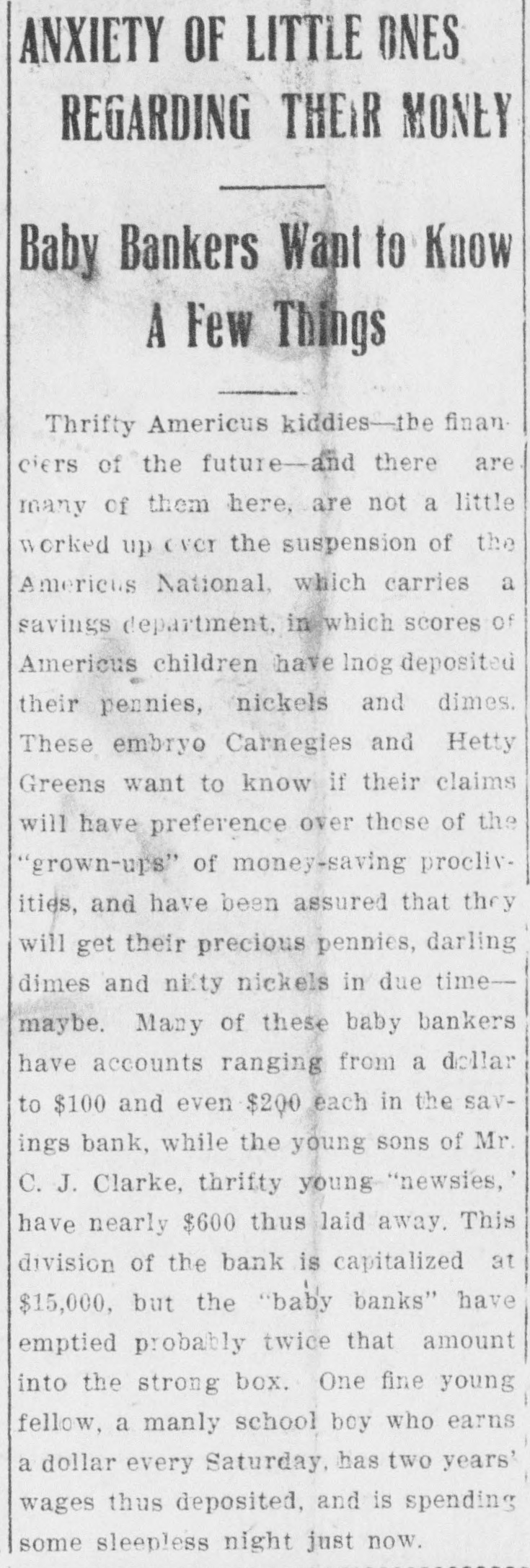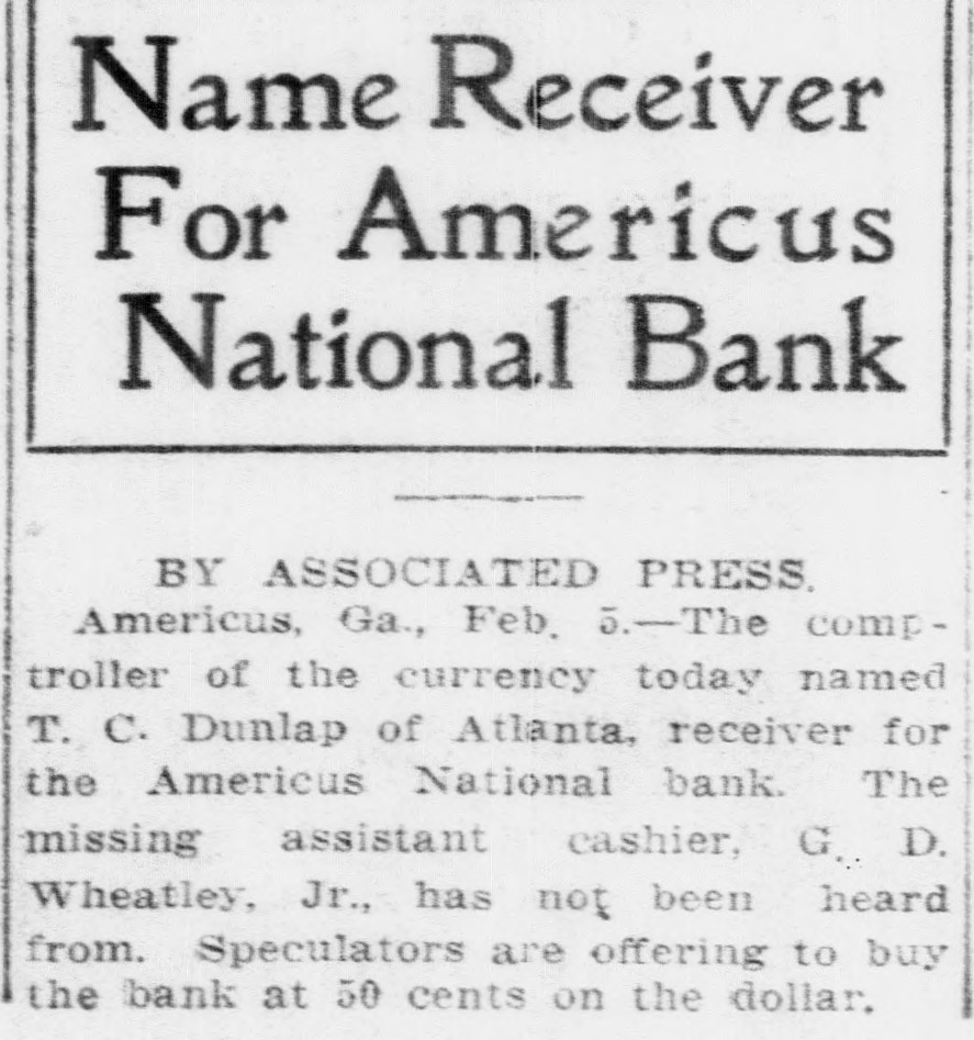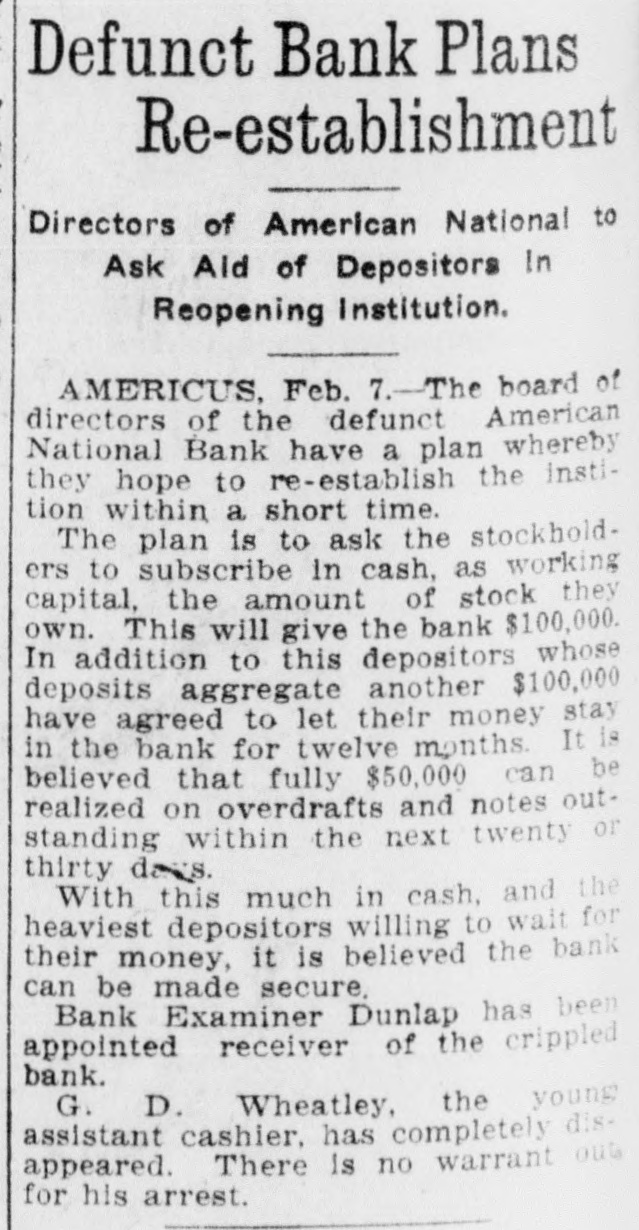 RECEIVERS WILL ADJUST AFFAIRS INSOLVENT BANK 48 part belonging to women, children, and people of small means, all of which WALLIS NAMED seems to have vanished within a brief FAIL OTHER PLANS time. The estimate of $600,000 includRECEIVER FOR es the original capital stock of $100,000, which, it seems, was long ago SIGNALLY dissipated and is now utterly worthSAVINGS BANK less. However, there are proven claims DEPOSITORS WILL REAof depositors amounting to $319,000, LIZE SOME PORTION besides unverified deposits of $35,000. OFFSPRING OF NATION'L BANK In addition, there are other items unThe 'swap song' in the affairs of the der this account of $27,000, making a insolvent and somewhat depleted grand total of $381,000. It is said Americus National Bank which went to His Appointment is Made the amounts due other banks will agthe wall early in February, was sung gregate $110,000. Yesterday yesterday when it was announced that The total liabilities, capitulated, are the final proposition made by depositestimated at about $504,000, besides Judge Z. A. Littlejohn at a late ors to the bank's directors for its the capital stock of $100,000, to be hour yesterday appointed Mr. W. P. liquidation, outside the usual channels added. This is supposed to include the Wallis receiver for the Americus Trust employed by the government, had fall"overdrafts" of about $75,000, the & Savings Bank, an offspring of the en flat. This forlorn hope to which greater portion of which is regarded defunct Americus National, and, prior the depositors had clung, has failed as entirely worthless; probably $10,000 to the closing of that bank ,operated signally. to $12,000 being considered collectaby the same officers. The little saving This being true, Receiver T. C. Dunble. bank was organized under a state lap will continue the work, already Notes held by the bank, good and charter, and had a capital stock of fast progressing, toward liquidating indifferent, may approximate $340,000, $15,000. the national bank in the usual mana considerable portion of them being Its deposit account, at the time of ner employed by the government, at deemed collectable. The total differthe closing of the national bank, was which he has been busied since the ence between available assets and liasaid to be about $13,000. Its assets collapse of the institution in Februbilities is about $162,000, it was said at this time are thought to be rather ary. recently by one of the attorneys intersmall. Just what depositors will reQuite recently a last hope was held ested. Of this large amount something ceive in the liquidation of the bank is, out that the bank's directors might be like $130,000 seems unaccounted for, of course, largely a matter of couinduced to liquidate the bank, providaccording to statements of those injecture. ed the stockholders and depositors terested in the bank's affairs. About two weeks ago, Attorney Gencomplied with certain terms suggested, No authentic information has been eral Warren Grice came to Americus and the four Lowery brothers, all of given out by Receiver Dunlap, as this to see about the appointment of a rethem directors, put up $150,000 to that would be contrary to the regulations ceiver for the little state bank, and end. They had previously expressed of his department. proposed the appointment of Mr. L. G. a willingness to lend substantial asWhen the Americus National closed Council to that position. Mr. Council, sistance to this end by putting up real its doors February 3rd, after a most however, found it inexpedienct to acestate to safeguard the party who prosperous seven years career, the cept the position and so notified Judge would liquidate the bank. people of Americus were stupefied with Littlejohn, who has since named Mr. On the showdown recently, however, astonishment. About nine hundred deWallis as the receiver instead. the value of the realty tendered was positors, many of whom, it is said, The exact status of the bank's conconsidered far less than the amount made large deposits over the counter dition will not be known until Reexpected of them, and the liquidation only the day before the failure withceiver Wallis has gone fully into its plan, as suggested, fell flat, It is out the slightest suspicion of impendfinancial affairs. A number of its desaid directors tendered yesterday the ing danger, were appalled. Up to the positors, it is understood, were women sum of $62,500, or less than half the last day and hour, it is said, deposits and children. amount required, hence the liquidaflowed in freely, and the bank was tion plan failed. considered one of the safest in GeorThe result will be that the stockgia. A comparatively small amount holders will be assessed, under the liaof cash was found in its vaults when FARMER A BUSINESS bility clause, and probably $70,000 Receiver Dunlap assumed charge the raised from that source. The stocknext day. The work of depletion had MAN THANKS TO holders' liability is $100,000, but some been terribly complete. of them are unable to pay. This To this bank hundreds of people, amount, with that to be laboriously RURAL PHONES some of them widows, had been atcollected from the assets of the bank, tracted by the alluring rates of intergood, bad and indifferent, will be disAtlanta, May 30.-Rural telephones est offered, and the belief that their are beignning to play just as importtributed as far as it will go in the money would be absolutely safe in a payment of the bank's indebtedness ant if not a more important part than national bank. Merchants, farmers and deposit account. either rural free delivery or parcels and others deposited there. Many post, in putting the farmer on an econJust what depositors will eventually poor people who had saved a pittance omic equality with the city business receive is a mooted question. No estifor their declining years, had their man. mate is given out by those in authority little hoard swept away-just how The growth of rural telephones or and guess