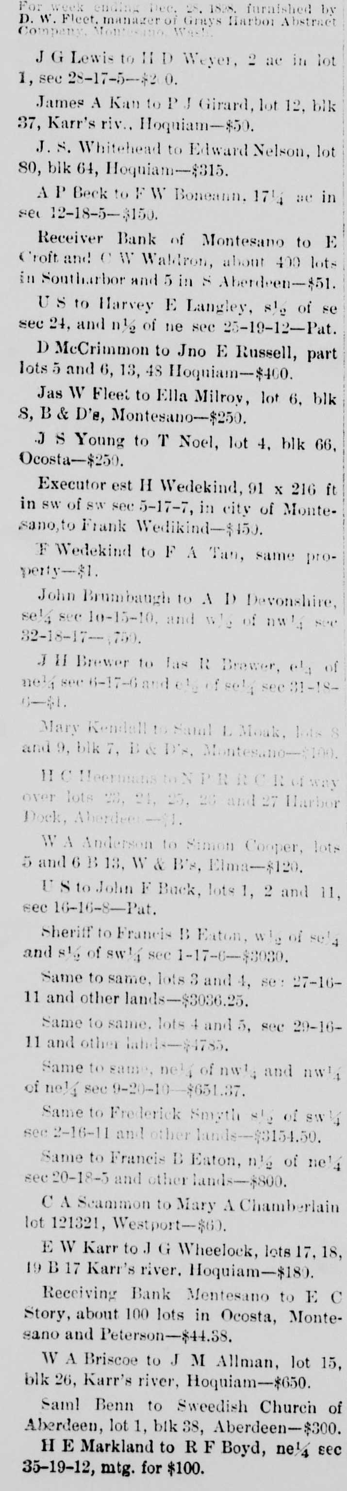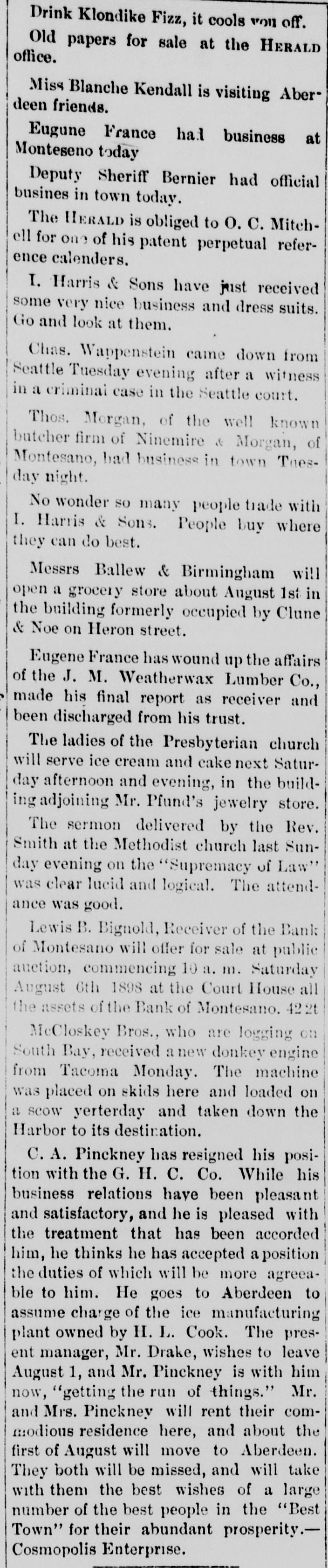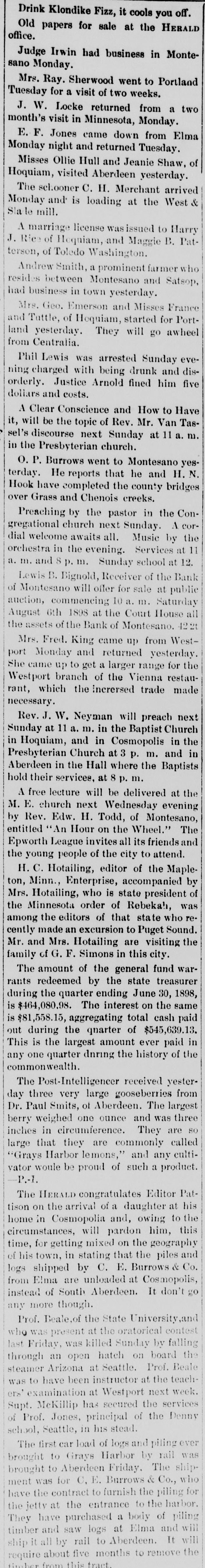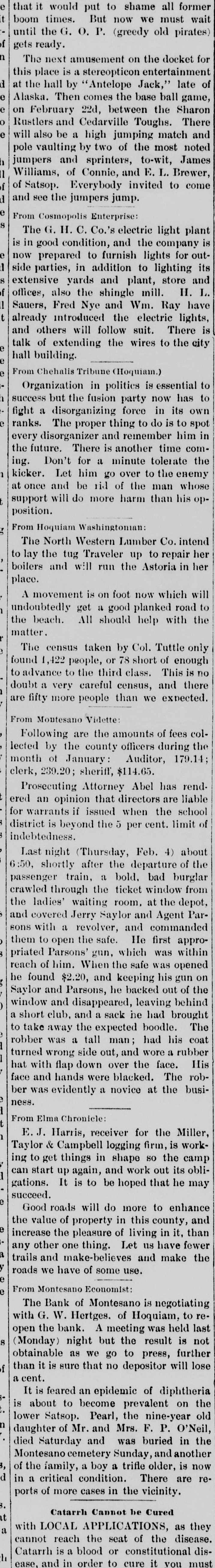 Rustlers and Cedarville Toughs. will also be a high jumping ma pole vaulting by two of the mos jumpers and sprinters, to-wit, Williams, of Connie, and E. L. of Satsop. Everybody invited t 1 and see the jumpers jump. From Cosmopolis Enterprise: The G. H. C. Co.'s electric ligl is in good condition, and the com now prepared to furnish lights I side parties, in addition to ligh extensive yards and plant, st offices, also the shingle mill. Sauers, Fred Nye and Wm. Ra already introduced the electric and others will follow suit. T talk of extending the wires to hall building. From Chehalis Tribune (Hoquiam.) Organization in politics is esse success but the fusion party now fight a disorganizing force in ranks. The proper thing to do is every disorganizer and remember the future. There is another tim ing. Don't for a minute toler kicker. Let him go over to the at once and be rid of the man support will do more harm than position. From Hoquiam Washingtonian: The North Western Lumber Co to lay the tug Traveler up to rej boilers and will run the Astoria place. A movement is on foot now wh undoubtedly get a good planked the beach. All should help will matter. The census taken by Col. Tut found 1,422 people, or 78 short of to advance to the third class. Th doubt a very careful census, and are fifty more people than we ex From Montesano Vidette: Following are the amounts of f lected by the county officers dur month of January: Auditor, clerk, 239.20; sheriff, $114.65. Prosecuting Attorney Abel has ered an opinion that directors ar for warrants if issued when the district is beyond the 5 per cent. indebtedness. Last night (Thursday, Feb. 4) 6:50, shortly after the departur passenger train, a bold, bad crawled through the ticket windo the ladies' waiting room, at the and covered Jerry Saylor and Age sons with a revolver, and comi them to open the safe. He first priated Parsons' gun, which was reach of him. When the safe was he found $2.20, and keeping his Saylor and Parsons, he backed ou window and disappeared, leaving a short club, and a sack he had 1 to take away the expected boodle robber was a tall man; had 1 turned wrong side out, and wore a hat with flap down over the face face and hands were blacked. TI ber was evidently a novice at th ness. From Elma Chronicle: E. J. Harris, receiver for the Taylor & Campbell logging firm, i ing to get things in shape SO th can start up again, and work out gations. It is to be hoped that succeed. Good roads will do more to e the value of property in this coun increase the pleasure of living in any other one thing. Let us hav trails and make-believes and ma roads we have of some use. From Montesano Economist: The Bank of Montesano is neg with G. W. Hertges. of Hoquian open the bank. A meeting was h (Monday) night but the result obtainable as we go to press, than it is sure that no depositor , a cent. It is feared an epidemic of dip is about to become prevalent lower Satsop. Pearl, the nine-y daughter of Mr. and Mrs. F. P. died Saturday and was buried Montesano cemetery Sunday, and of the family, a boy a trifle older in a critical condition. There ports of more cases in the vicinity Catarrh Cannot be Cured