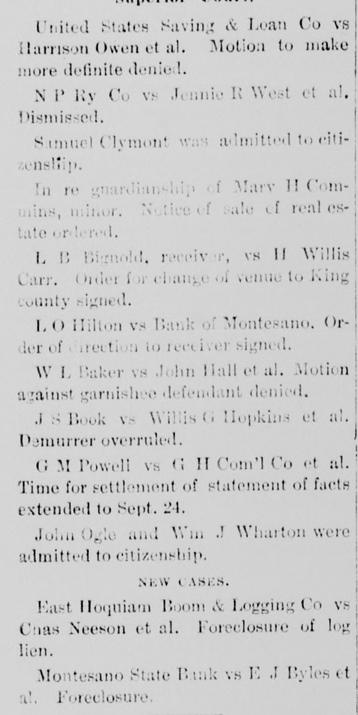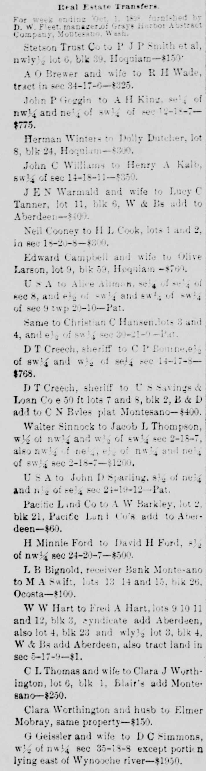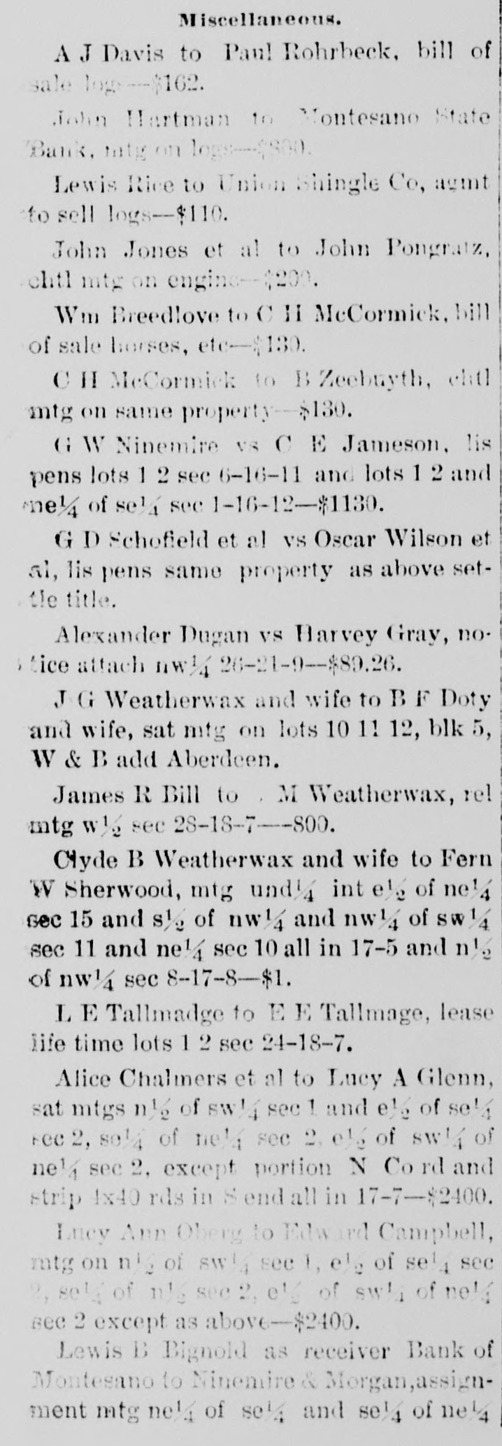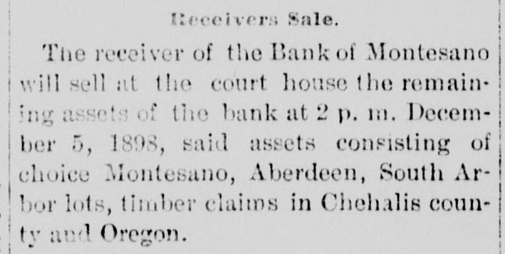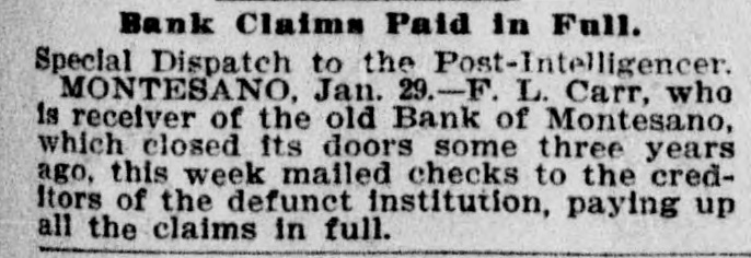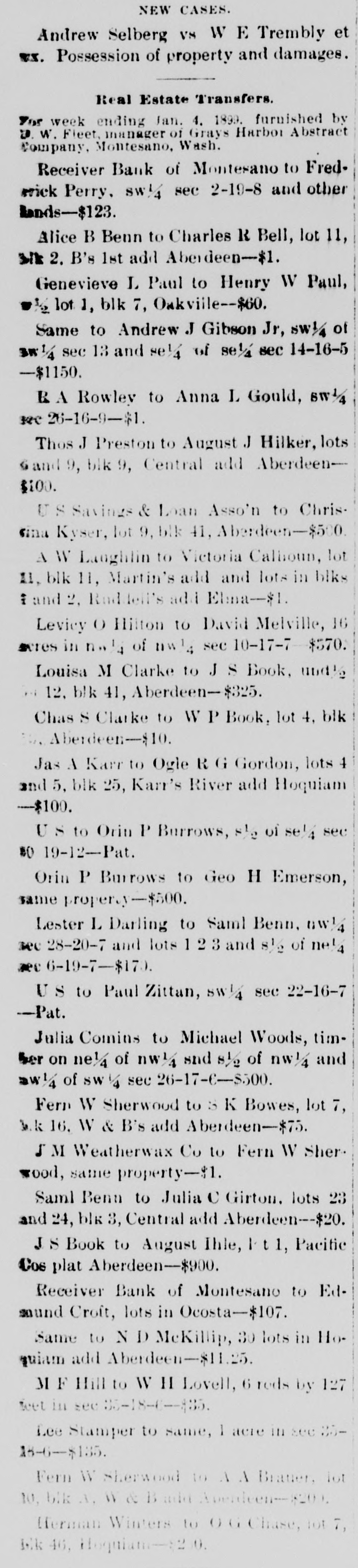 Rustlers and Cedarville Toughs. will also be a high jumping ma pole vaulting by two of the mos jumpers and sprinters, to-wit, Williams, of Connie, and E. L. of Satsop. Everybody invited t 1 and see the jumpers jump. From Cosmopolis Enterprise: The G. H. C. Co.'s electric ligl is in good condition, and the com now prepared to furnish lights I side parties, in addition to ligh extensive yards and plant, st offices, also the shingle mill. Sauers, Fred Nye and Wm. Ra already introduced the electric and others will follow suit. T talk of extending the wires to hall building. From Chehalis Tribune (Hoquiam.) Organization in politics is esse success but the fusion party now fight a disorganizing force in ranks. The proper thing to do is every disorganizer and remember the future. There is another tim ing. Don't for a minute toler kicker. Let him go over to the at once and be rid of the man support will do more harm than position. From Hoquiam Washingtonian: The North Western Lumber Co to lay the tug Traveler up to rej boilers and will run the Astoria place. A movement is on foot now wh undoubtedly get a good planked the beach. All should help will matter. The census taken by Col. Tut found 1,422 people, or 78 short of to advance to the third class. Th doubt a very careful census, and are fifty more people than we ex From Montesano Vidette: Following are the amounts of f lected by the county officers dur month of January: Auditor, clerk, 239.20; sheriff, $114.65. Prosecuting Attorney Abel has ered an opinion that directors ar for warrants if issued when the district is beyond the 5 per cent. indebtedness. Last night (Thursday, Feb. 4) 6:50, shortly after the departur passenger train, a bold, bad crawled through the ticket windo the ladies' waiting room, at the and covered Jerry Saylor and Age sons with a revolver, and comi them to open the safe. He first priated Parsons' gun, which was reach of him. When the safe was he found $2.20, and keeping his Saylor and Parsons, he backed ou window and disappeared, leaving a short club, and a sack he had 1 to take away the expected boodle robber was a tall man; had 1 turned wrong side out, and wore a hat with flap down over the face face and hands were blacked. TI ber was evidently a novice at th ness. From Elma Chronicle: E. J. Harris, receiver for the Taylor & Campbell logging firm, i ing to get things in shape SO th can start up again, and work out gations. It is to be hoped that succeed. Good roads will do more to e the value of property in this coun increase the pleasure of living in any other one thing. Let us hav trails and make-believes and ma roads we have of some use. From Montesano Economist: The Bank of Montesano is neg with G. W. Hertges. of Hoquian open the bank. A meeting was h (Monday) night but the result obtainable as we go to press, than it is sure that no depositor , a cent. It is feared an epidemic of dip is about to become prevalent lower Satsop. Pearl, the nine-y daughter of Mr. and Mrs. F. P. died Saturday and was buried Montesano cemetery Sunday, and of the family, a boy a trifle older in a critical condition. There ports of more cases in the vicinity Catarrh Cannot be Cured