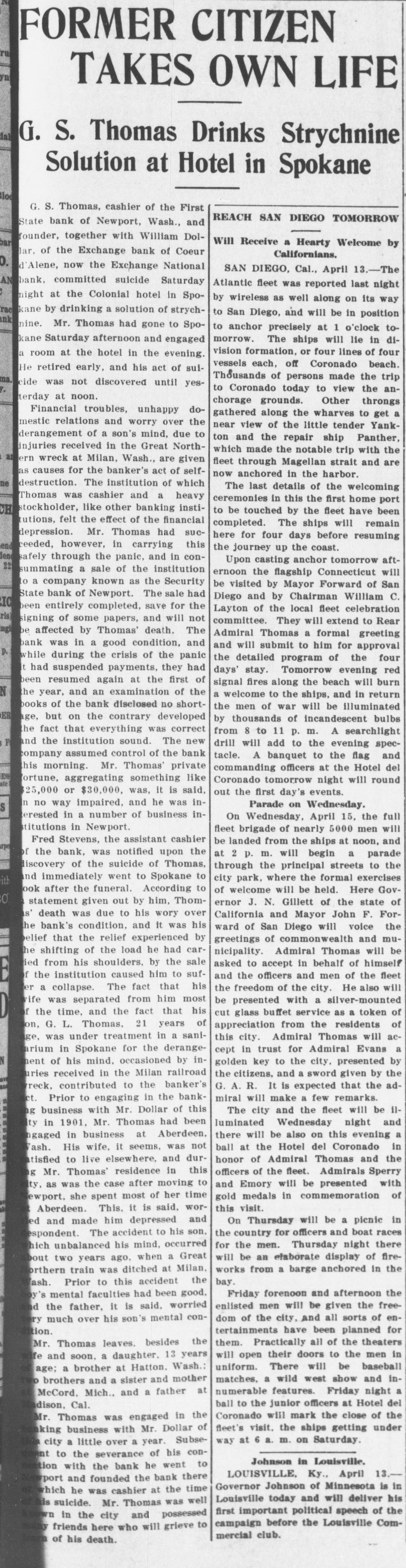 FORMER CITIZEN TAKES OWN LIFE G. S. Thomas Drinks Strychnine Solution at Hotel in Spokane G. S. Thomas, cashier of the First REACH SAN DIEGO TOMORROW State bank of Newport, Wash., and founder, together with William DolWill Receive a Hearty Welcome by lar. of the Exchange bank of Coeur Californians. 0. l'Alene, now the Exchange National SAN DIEGO, Cal., April 13.-The AN bank, committed suicide Saturday Atlantic fleet was reported last night night at the Colonial hotel in Spoby wireless as well along on its way kane by drinking a solution of strychto San Diego, and will be in position nine. Mr. Thomas had gone to Spoto anchor precisely at 1 o'clock tokane Saturday afternoon and engaged morrow. The ships will lie in division formation, or four lines of four a room at the hotel in the evening. vessels each, off Coronado beach. He retired early, and his act of suiThousands of persons made the trip cide was not discovered until yesto Coronado today to view the anterday at noon. chorage grounds. Other throngs Financial troubles, unhappy dogathered along the wharves to get a mestic relations and worry over the near view of the little tender Yankderangement of a son's mind, due to ton and the repair ship Panther, injuries received in the Great Northwhich made the notable trip with the ern wreck at Milan, Wash., are given fleet through Magellan strait and are as causes for the banker's act of selfnow anchored in the harbor. destruction. The institution of which ne The last details of the welcoming Thomas was cashier and a heavy ceremonies in this the first home port stockholder, like other banking instiCH to be touched by the fleet have been tutions, felt the effect of the financial completed. The ships will remain depression. Mr. Thomas had suchere for four days before resuming ceeded, however, in carrying this the journey up the coast. safely through the panic, and in conUpon casting anchor tomorrow aftsummating a sale of the institution ernoon the flagship Connecticut will to a company known as the Security be visited by Mayor Forward of San State bank of Newport. The sale had Diego and by Chairman William C. IC been entirely completed, save for the Layton of the local fleet celebration signing of some papers, and will not committee. They will extend to Rear be affected by Thomas' death. The Admiral Thomas a formal greeting bank was in a good condition, and and will submit to him for approval p. while during the crisis of the panic the detailed program of the four had suspended payments, they had days' stay. Tomorrow evening red been resumed again at the first of signal fires along the beach will burn the year, and an examination of the N a welcome to the ships, and in return books of the bank disclosed no shortthe men of war will be illuminated ER age, but on the contrary developed by thousands of incandescent bulbs the fact that everything was correct from 8 to 11 p. m. A searchlight and the institution sound. The new drill will add to the evening speccompany assumed control of the bank tacle. A banquet to the flag and this morning. Mr. Thomas' private commanding officers at the Hotel del fortune, aggregating something like Coronado tomorrow night will round $25,000 or $30,000, was, it is said, out the first day's events. n no way impaired, and he was inParade on Wednesday. S terested in a number of business inOn Wednesday, April 15, the full stitutions in Newport. fleet brigade of nearly 5000 men will Fred Stevens, the assistant cashier be landed from the ships at noon, and of the bank, was notified upon the at 2 p. m. will begin a parade liscovery of the suicide of Thomas, through the principal streets to the ind immediately went to Spokane to city park, where the formal exercises ook after the funeral. According to of welcome will be held. Here Gov0 statement given out by him, Thomernor J. N. Gillett of the state of s' death was due to his wory over California and Mayor John F. Forhe bank's condition, and it was his ward of San Diego will voice the elief that the relief experienced by greetings of commonwealth and muhe shifting of the load he had carnicipality. Admiral Thomas will be ied from his shoulders. by the sale asked to accept in behalf of himself the institution caused him to sufand the officers and men of the fleet er a collapse. The fact that his the freedom of the city. He also will vife was separated from him most be presented with a silver-mounted the time, and the fact that his cut glass buffet service as a token of on, G. L. Thomas. 21 years of appreciation from the residents of ge, was under treatment in a sanithis city. Admiral Thomas will acarium in Spokane for the derangecept in trust for Admiral Evans a nent of his mind, occasioned by ingolden key to the city, presented by uries received in the Milan railroad the citizens, and a sword given by the freck, contributed to the banker's G. A. R. It is expected that the admiral will make a few remarks. ct. Prior to engaging in the bankng business with Mr. Dollar of this The city and the fleet will be ilty in 1901, Mr. Thomas had been luminated Wednesday night and there will be also on this evening a ngaged in business at Aberdeen. Vash. His wife, it seems, was not ball at the Hotel del Coronado in honor of Admiral Thomas and the atisfied to live elsewhere, and durg Mr. Thomas' residence in this officers of the fleet. Admirals Sperry and Emory will be presented with ty, as was the case after moving to gold medals in commemoration of ewport. she spent most of her time this visit. Aberdeen. This, it is said. wored and made him depressed and On Thursday will be a picnic in the country for officers and boat races espondent. The accident to his son, for the men. Thursday night there hich unbalanced his mind, occurred will be an elaborate display of firebout two years ago, when a Great works from a barge anchored in the orthern train was ditched at Milan, bay. ash. Prior to this accident the Friday forenoon and afternoon the y's me