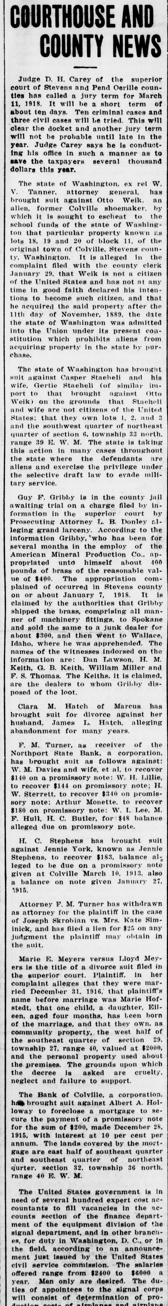COURTHOUSE AND COUNTY NEWS Judge D. H. Carey of the superior counand Pend called a jury term of court has of Stevens Oerille for term March ties 1918. It will be a short and days. Ten criminal cases will be tried. docket and another jury three about 11, the civil ten cases This in term will the clear not be probable until late conductwill Judge Carey says he is as to year. his office in such a manner thousand save ing the taxpayers several dollars this year. The state of Washington. ex rel has W. Tanner. attorney general. Weik. v. suit against Otto an by brought former Colville shoemaker. to the alien, which it is sought to escheat Washingfunds of the state of known as school that particular property of the ton 19 and 20 of block 11. counoriginal lots 18. town of Colville. Stevens in the Washington. It is alleged clerk ty, filed with the county complaint 29. that Weik is not a citizen at any January United States and has not his intenof the in good faith declared that time such citizen. and the the said date he tions acquired to become of November, property 1889. after the 11th state day of Washington was admitted conthe the Union under its present from into which prohibits aliens chase. stitution acquiring property in the state by purstate of Washington has brought his The Staeheli and imGertie Staeheli (of suit wife. against that Casper brought against similar Staehell Otto port to on the grounds that United Weik) wife are not citizens of the 2. and and that they own lots 1, northeast States: southwest quarter of north. and the of section 6. township 33 taking quarter 39 E. W. M. The state is range action in many cases throughout are this where the defendants the state and exercise the privilege under milialiens the selective draft law to evade tary service. F. Gribby is in the county by jail inGuy trial on a charge filed Attorney L. B. awaiting formation Prosecuting in the superior According Donley court to the al- by grand larceny. been for leging Gribby, who has the information months in the employ Co., of apunto himself several American Mineral Production about 400 valpropriated of brass of the reasonable compounds $400. The appropriation county ue of of occurred in Stevens It is plained or about January 7. 1918. that Gribby on claimed by the authorities all manthe brass, comprising Spokane shipped of machinery fittings. to dealer for ner sold the same to a junk Wallace, and $300. and then went to The about where he was apprehended. on the Idaho, of the witnesses indorsed H. M. names are: Dan Lawson. and information G. B. Keith, William Miller claimed. Keith, Thomas. The Keiths. it is disare F. S. the dealers to whom Gribby posed of the loot. M. Hatch of Marcus has her Clara for divorce against brought suit James L. Hatch. alleging husband. abandonment for many years. the F. M. Turner, as receiver corporation, of Northport follows State Bank. a against: has brought suit as to recover Davies and wife, et al. Lillie, W. M. a promissory note: W. H. note; H. $140 on $144 on promissory promisto recover Sterrett. to recover $340 on recover W. note: Arthur Monette. to Lee. M. sory promissory note: W. I. balance $180 Hull, on H. C. Butler. for note. $48 alleged F. due on promissory C. Stephens has brought Jennie suit H. Jennie York, known as alto recover $183. note due on a also against leged Stephens, to be promissory balance 1913. Colville March 10. 27. a 1915. given balance at on note given January F. M. Turner has withdrawn the case Attorney attorney for the plaintiff in Kate Simas Skrobian vs. Mrs. any of Joseph has filed a lien for $25 on in the suit. inick, judgment and the plaintiff may obtain E. Meyers versus Lloyd filed MeyMarie the title of a divorce suit in her ers is superior court. Plaintiff. were maralleges that 31. 1916. that Hofthe complaint ried December was they Marie plaintiff's before marriage Ellname one child, a daughter, four months. has as een, and that they half of of stedt. the aged that marriage. west been own. born community property, the section 29. southeast quarter of $2000, the township 27. range 40, valued used at about personal property which and premises. the The grounds upon cruelty. the decree is asked are neglect the and failure to support. Bank of Colville. a corporation. A. HolThe brought suit against Albert to se. has to foreclose a mortgage payment of a 28, sum of $200, made cent per cure loway for the the promissory December note with interest at 10 per mort1915, The lands covered by the annum. are east half of southeast northeast quarter gage southeast quarter of north. qurter. and section 32. township 36 range 40 E. W. M. United States government cost is ac- in The of several hundred expert the acneed to fill vacancies in departcountants section of the finance of the counts of the equipment division branchment department, and in other C., or in signal for duty in Washington, D. announcees, according to an States the ment field, just issued by the United The salaries service commission. $6000 civil range from $2400 to The offered Men only are desired. corps duyear. of appointees to the signal of prowill ties consist of determination and airnlane of alenlance
