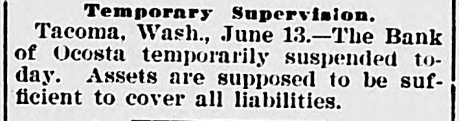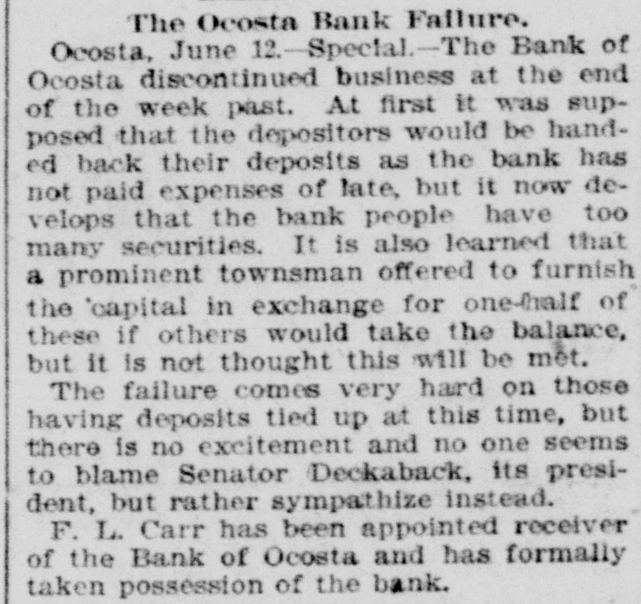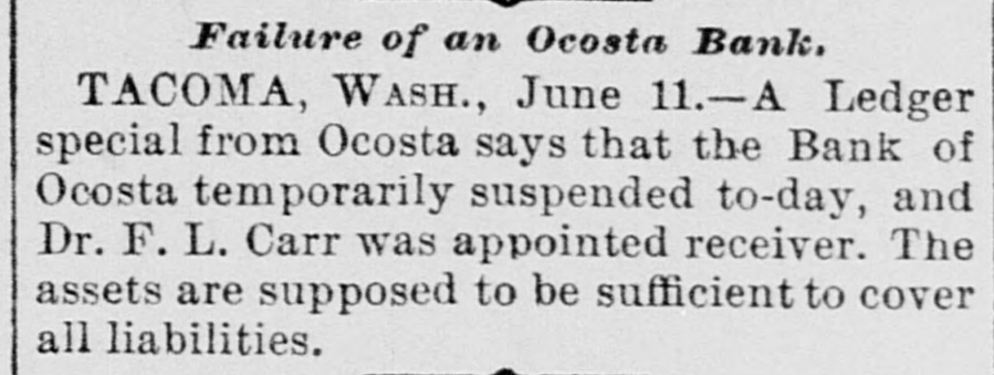 The Ocosta Bank Failure. Ocosta, June 12.-Special.-The Bank of Ocosta discontinued business at the end of the week past. At first it was supposed that the depositors would be handed back their deposits as the bank has not paid expenses of late, but it now develops that the bank people have too many securities. It is also learned that a prominent townsman offered to furnish the capital in exchange for hone-half of these if others would take the balance, but it is not thought this will be met. The failure comes very hard on those having deposits tied up at this time, but there is no excitement and no one seems to blame Senator Deckaback, its president, but rather sympathize instead. F. L. Carr has been appointed receiver of the Bank of Ocosta and has formally taken possession of the bank.