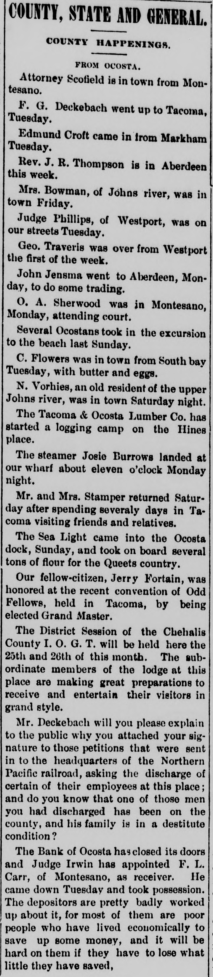 COUNTY, STATE AND GENERAL. COUNTY HAPPENINGS. FROM OCOSTA. Attorney Scofield is in town from Montesano. F. G. Deckebach went up to Tacoma, Tuesday. Edmund Croft came in from Markham Tuesday. Rev. J. R. Thompson is in Aberdeen this week. Mrs. Bowman, of Johns river, was in town Friday. Judge Phillips, of Westport, was on our streets Tuesday. Geo. Traveris was over from Westport the first of the week. John Jensma went to Aberdeen, Monday, to do some trading. O. A. Sherwood was in Montesano, Monday, attending court. Several Ocostans took in the excursion to the beach last Sunday. C. Flowers was in town from South bay Tuesday, with butter and eggs. N. Vorhies, an old resident of the upper Johns river, was in town Saturday night. The Tacoma & Ocosta Lumber Co. has started a logging camp on the Hines place. The steamer Josie Burrows landed at our wharf about eleven o'clock Monday night. Mr. and Mrs. Stamper returned Saturday after spending severaly days in Tacoma visiting friends and relatives. The Sea Light came into the Ocosta dock, Sunday, and took on board several tons of flour for the Queets country. Our fellow-citizen, Jerry Fortain, was honored at the recent convention of Odd Fellows, held in Tacoma, by being elected Grand Master. The District Session of the Chehalis County I. O. G. T. will be held here the 25th and 26th of this month. The subordinate members of the lodge at this place are making great preparations to receive and entertain their visitors in grand style. Mr. Deckebach will you please explain to the public why you attached your signature to those petitions that were sent in to the headquarters of the Northern Pacific railroad, asking the discharge of certain of their employees at this place; and do you know that one of those men you had discharged has been on the county, and his family is in a destitute condition? The Bank of Ocosta has closed its doors and Judge Irwin has appointed F. L. Carr, of Montesano, as receiver. He came down Tuesday and took possession. The depositors are pretty badly worked up about it, for most of them are poor people who have lived economically to save up some money, and it will be hard on them if they have to lose what little they have saved,