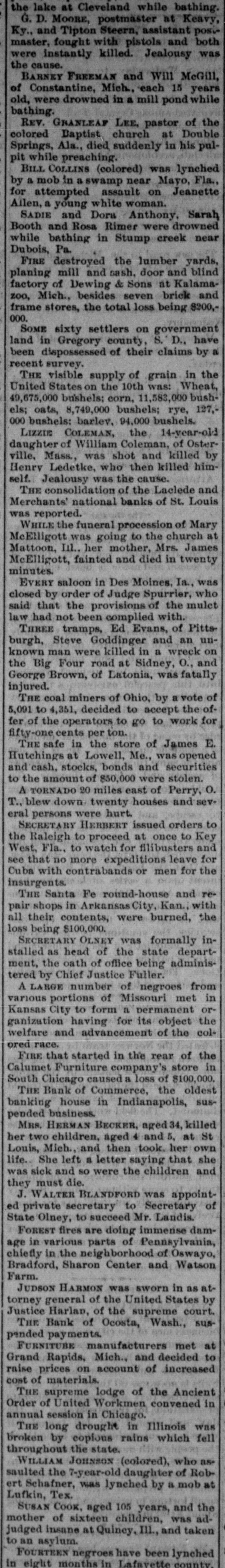 the lake at Cleveland while bathing. G. D. MOORE, postmäster at Keavy, Ky., and Tipton Steern, assistant postmaster, fought with pistols and both were instantly killed. Jealousy was the cause. BARNEY FREEMAN and Will McGill, of Constantine, Mich., each 15 years old, were drowned in a mill pond while bathing. REV. GRANLEAF LEE. pastor of the colored Baptist church at Double Springs, Ala., died suddenly in his pulpit while preaching. BILL COLLINS (colored) was lynched by a mob in a swamp near Mayo, Fla., for attempted assault on Jeanette Allen, a young white woman. SADIE and Dora Anthony. Sarah Booth and Rosa Rimer were drowned while bathing in Stump creek near Dubois, Pa. FIRE destroyed the lumber yards, planing mill and sash. door and blind factory of Dewing & Sons at Kalamazoo, Mich., besides seven brick and frame stores, the total loss being $200,*000 SOME sixty settlers on government land in Gregory county, S. D., have been dispossessed of their claims by al recent survey. THE visible supply of grain in the United States on the 10th was: Wheat, 49,675,000 bushels: corn, 11,583,000 bushels; oats, 8,749,000 bushels; rye, 127,000 bushels: barlev, 94,000 bushels. LIZZIE COLEMAN, the 14-year-old daughter of William Coleman, of Osterville. Mass, was shot and killed by Henry Ledetke, who then killed himself. Jealousy was the cause. THE consolidation of the Laclede and Merchants' national banks of St. Louis reported. SUM WHILE the funeral procession of Mary 18 church the on Sujo.8 SUM Mattoon, Ill.. her mother, Mrs. James McElligott, fainted and died in twenty minutes. EVERY saloon in Des Moines, Ia., was closed by order of Judge Spurrier, who said that the provisions of the mulet law had not been complied with. THREE tramps, Ed Evans, of Pittsburgh, Steve Goddinger and an unuo wereb B up PHP элэм ивш имоня the Big Four road at Sidney, O., and George Brown, of Latonia, was fatally injured. THE coal miners of Ohio, by a vote of -JO the accept 04 decided '198'$ 04 160's fer of the operators to go to work for fifty-one cents per ton. THE safe in the store of James E. Hutchings at Lowell, Me., was opened and cash, stocks, bonds and securities to the amount of $50,000 were stolen. A TORNADO 20 miles east of Perry, O. T., blew down. twenty houses and several persons were hurt. SECRETARY HERBERT issued orders to the Raleigh to proceed at once to Key West, Fla., to watch for filibusters and see that no more expeditions leave for Cuba with contrabands or men for the insurgents. THE Santa Fe round-house and repair shops in ArkansasCity, Kan., with all their contents, were burned, the loss being $100,000. SECRETARY OLNEY was formally installed as head of the state department, the oath of office being administered by Chief Justice Fuller. A LARGE number of negroes from various portions of Missouri met in Kansas City to form a permanent organization having for its object the welfare and advancement of the colored race. FIRE that started in the rear of the Calumet Furniture company's store in South Chicago caused a loss of $100,000. THE Bank of Commerce, the oldest banking house in Indianapolis, suspended business. MRS. HERMAN BECKER, aged 34, killed her two children, aged 4 and 5, at St Louis, Mich., and then took. her own life.. She left a letter saying that she pue children the Mere os pus sick SUM they must die. -4ujodd= SUM WELTER T ed private secretary to Secretary of State Olney, to succeed Mr. Landis. FOREST fires are doing immense damage in various parts of Pennsylvania, chiefly in the neighborhood of Oswayo, Bradford, Sharon Center and Watson THEM -1" se up SEM NORHVH NOSCINT torney general of the United States by Justice Harlan, of the supreme court. THE Bank of Ocosta, Wash., susperments pepued FURNITURE manufacturers met at Grand Rapids, Mich.. and decided to raise prices on account of increased materials JO 3800 THE supreme lodge of the Ancient Order of United Workmen convened in annual session in Chicago. THE long drought in Illinois was broken by copious rains which fell throughout the state. WILLIAM JOHNSON (colored), who assaulted the 7-year-old daughter of Rob18 qour B &q Insuch SEM que Lufkin, Tex. SUSAN COOK, aged 105 years, and the