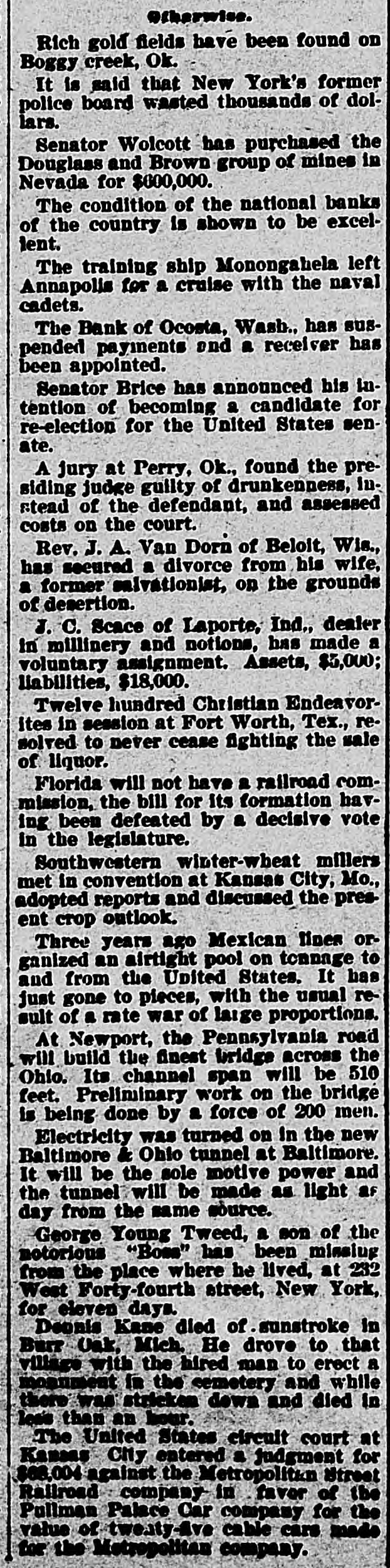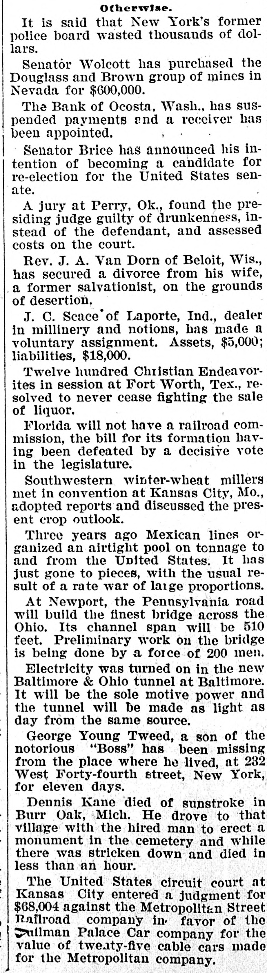 Otherwise. It is said that New York's former police board wasted thousands of dollars. Senator Wolcott has purchased the Douglass and Brown group of mines in Nevada for $600,000. The Bank of Ocosta, Wash.. has suspended payments and a receiver has been appointed. Senator Brice has announced his intention of becoming a candidate for re-election for the United States senate. A jury at Perry, Ok., found the presiding judge guilty of drunkenness, instead of the defendant, and assessed costs on the court. Rev. J. A. Van Dorn of Beloit, Wis., has secured a divorce from his wife, a former salvationist, on the grounds of desertion. J. C. Scace of Laporte, Ind., dealer in millinery and notions, has made a voluntary assignment. Assets, $5,000; liabilities, $18,000. Twelve hundred Christian Endeavorites in session at Fort Worth, Tex., resolved to never cease fighting the sale of liquor. Florida will not have a railroad commission, the bill for its formation having been defeated by a decisive vote in the legislature. Southwestern winter-wheat millers met in convention at Kansas City, Mo., adopted reports and discussed the present crop outlook. Three years ago Mexican lines organized an airtight pool on tonnage to and from the United States. It has just gone to pieces, with the usual result of a rate war of large proportions. At Newport, the Pennsylvania road will build the finest bridge across the Ohio. Its channel span will be 510 feet. Preliminary work on the bridge is being done by a force of 200 men. Electricity was turned on in the new Baltimore & Ohio tunnel at Baltimore. It will be the sole motive power and the tunnel will be made as light as day from the same source. George Young Tweed, a son of the notorious "Boss" has been missing from the place where he lived, at 232 West Forty-fourth street, New York, for eleven days. Dennis Kane died of sunstroke in Burr Oak, Mich. He drove to that village with the hired man to erect a monument in the cemetery and while there was stricken down and died in less than an hour. The United States circuit court at Kansas City entered a judgment for $68,004 against the Metropolitan Street Railroad company in favor of the Cullman Palace Car company for the value of tweaty-five cable cars made for the Metropolitan company.