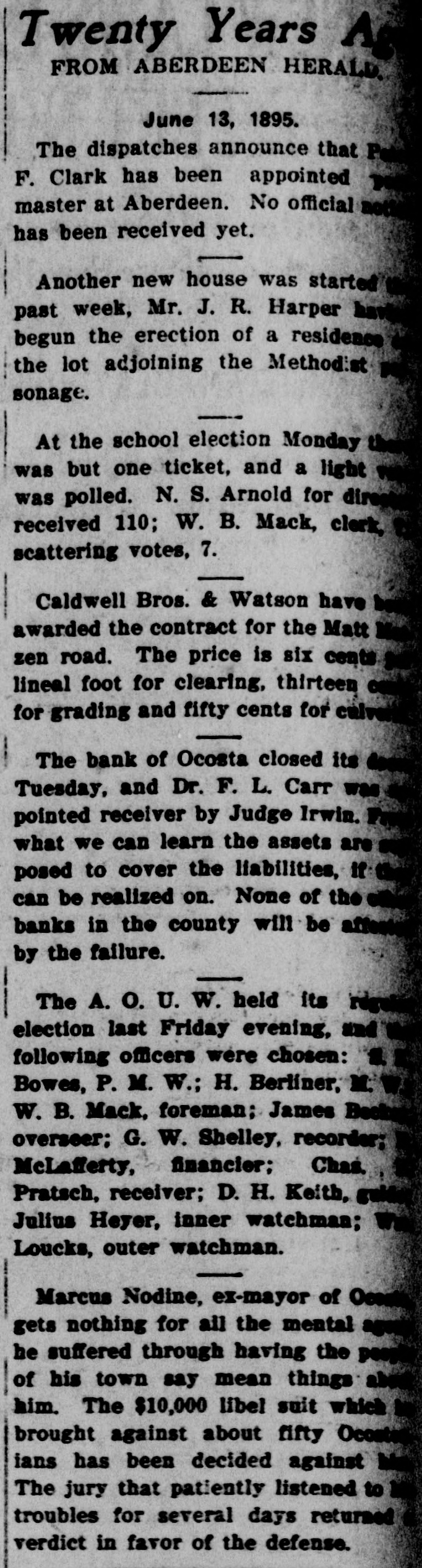 Twenty Years FROM ABERDEEN HERALI June 13, 1895. The dispatches announce that P F. Clark has been appointed master at Aberdeen. No official has been received yet. Another new house was started past week, Mr. J. R. Harper begun the erection of a residence the lot adjoining the Method:st sonage. i At the school election Monday was but one ticket, and a light was polled. N. S. Arnold for dir received 110; W. B. Mack, clerk. scattering votes, 7. I Caldwell Bros. & Watson have awarded the contract for the Matt zen road. The price is six cents lineal foot for clearing, thirteen for grading and fifty cents for culve The bank of Ocosta closed its Tuesday, and Dr. F. L. Carr was pointed receiver by Judge Irwin. what we can learn the assets are posed to cover the liabilities, if can be realized on. None of the banks in the county will be at by the failure. The A. O. U. W. held its reg election last Friday evening, and following officers were chosen: Bowes, P. M. W.; H. Berliner, W. B. Mack, foreman; James overseer; G. W. Shelley, recorder; McLafferty, financier; Chas. Pratsch, receiver; D. H. Keith, Julius Heyer, inner watchman; Loucks, outer watchman. Marcus Nodine, ex-mayor of gets nothing for all the mental he suffered through having the of his town say mean things al him. The $10,000 libel suit which brought against about fifty Ocost ians has been decided against The jury that patiently listened to troubles for several days returned verdict in favor of the defense.