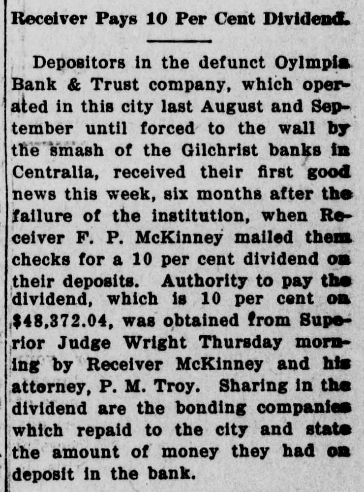 Receiver Pays 10 Per Cent Dividend. Depositors in the defunct Oylmpia Bank & Trust company, which operated in this city last August and September until forced to the wall by the smash of the Gilchrist banks in Centralia, received their first good news this week, six months after the failure of the institution, when Receiver F. P. McKinney mailed them checks for a 10 per cent dividend on their deposits. Authority to pay the dividend, which is 10 per cent on $48,372.04, was obtained from Superior Judge Wright Thursday morning by Receiver McKinney and his attorney, P. M. Troy. Sharing in the dividend are the bonding companies which repaid to the city and state the amount of money they had on deposit in the bank.
