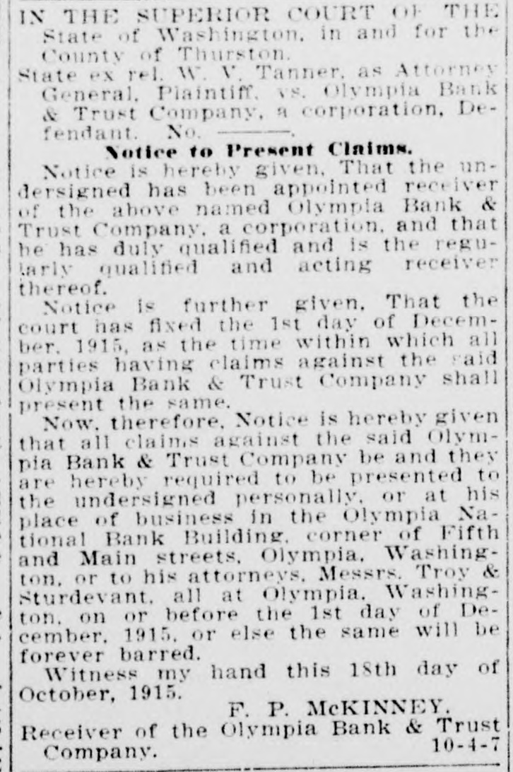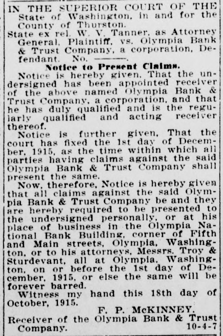 IN THE SUPERIOR COURT OF THE State of Washington. in and for the County of Thurston. State ex rel. W. V. Tanner, as Attorney General. Plaintiff. VS. Olympia Bank & Trust Company, 8 corporation, Defendant. No. Notice to Present Claims. Notice is hereby given, That the undersigned has been appointed receiver of the above named Olympia Bank & Trust Company. a corporation. and that he has duly qualified and is the regularly qualified and acting receiver thereof. Notice is further given, That the court has fixed the 1st day of December. 1915, as the time within which all parties having claims against the said Olympia Bank & Trust Company shall present the same. Now. therefore. Notice is hereby given that all claims against the said Olympia Bank & Trust Company be and they are hereby required to be presented to the undersigned personally. or at his place of business in the Olympia National Bank Building. corner of Fifth and Main streets. Olympia, Washington. or to his attorneys. Messrs. Troy & Sturdevant. all at Olympia, Washington. on or before the 1st day of December. 1915. or else the same will be forever barred. Witness my hand this 18th day of October, 1915. F. P. McKINNEY. Receiver of the Olympia Bank & Trust 10-4-7 Company.