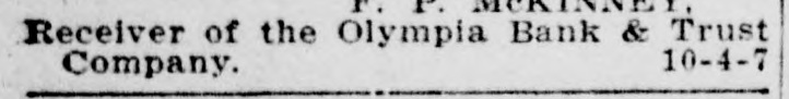 Frank P. McKinney, assistant cashier of the Olympia National bank, was appointed receiver of the local and Tenino banks, but declined to handle more than the local bank. ... which recently was closed, was arrested again Tuesday on a charge of embezzling ... Hays, organizer and cashier of the Olympia Bank & Trust company which recently was closed, was arrested again Tuesday on a charge of embezzling $36,550 of the funds of that bank and was later released on an additional bond of $5,000.