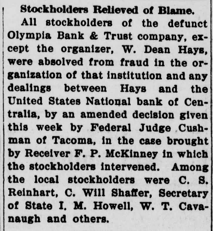 Stockholders Relieved of Blame. All stockholders of the defunct Olympia Bank & Trust company, except the organizer, W. Dean Hays, were absolved from fraud in the organization of that institution and any dealings between Hays and the United States National bank of Centralia, by an amended decision given this week by Federal Judge Cushman of Tacoma, in the case brought by Receiver F. P. McKinney in which the stockholders intervened. Among the local stockholders were C. S. Reinhart, C. Will Shaffer, Secretary of State I. M. Howell, W. T. Cavanaugh and others.