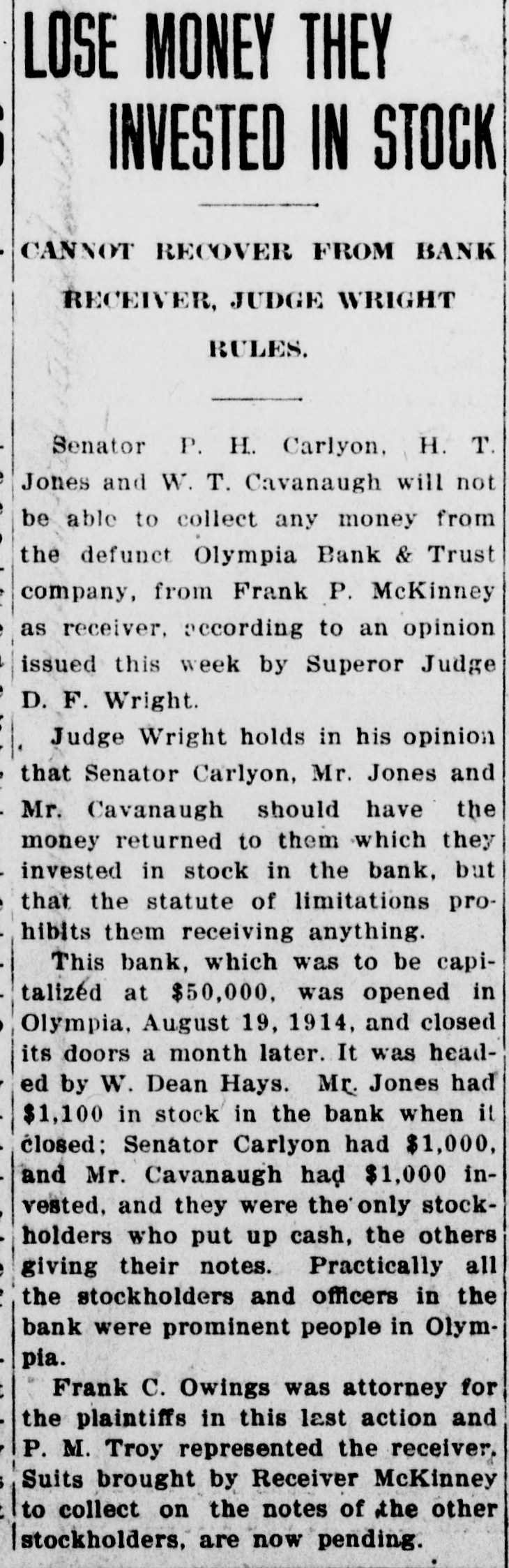 LOSE MONEY THEY INVESTED IN STOCK CANNOT RECOVER FROM BANK RECEIVER, JUDGE WRIGHT RULES. Senator P. H. Carlyon, H. T. Jones and W. T. Cavanaugh will not be able to collect any money from the defunct Olympia Bank & Trust company, from Frank P. McKinney as receiver, according to an opinion issued this week by Superor Judge D. F. Wright. Judge Wright holds in his opinion that Senator Carlyon, Mr. Jones and Mr. Cavanaugh should have the money returned to them which they invested in stock in the bank, but that the statute of limitations prohibits them receiving anything. This bank, which was to be capitalized at $50,000. was opened in Olympia, August 19, 1914, and closed its doors a month later. It was headed by W. Dean Hays. Mr. Jones had $1,100 in stock in the bank when it closed: Senator Carlyon had $1,000, and Mr. Cavanaugh had $1,000 invested, and they were the'only stockholders who put up cash, the others giving their notes. Practically all the stockholders and officers in the bank were prominent people in Olympia. Frank C. Owings was attorney for the plaintiffs in this last action and P. M. Troy represented the receiver. Suits brought by Receiver McKinney to collect on the notes of the other stockholders. are now pending.