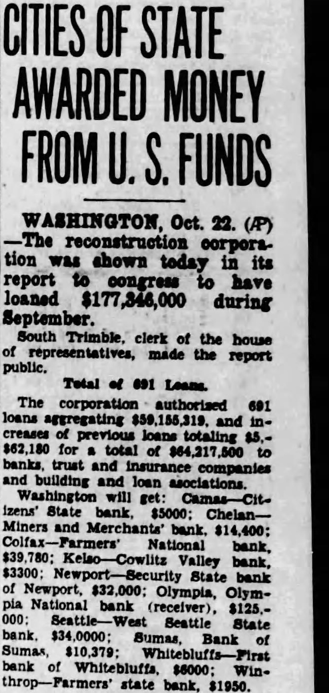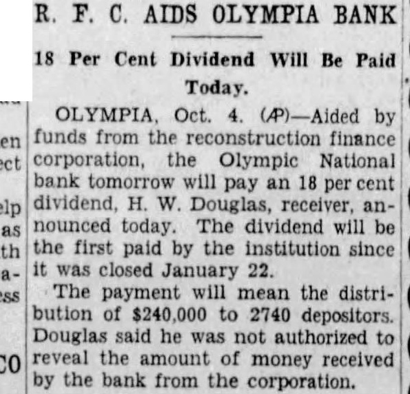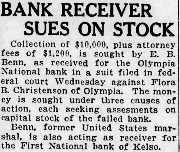 JOB-MAKING PROGRAM LAUNCHED BY LEADERS SUES BANK STOCKHOLDERS Receiver Claims 100 Per Cent Assessment Not Made. collection $22,against two capital stockholders the insolvent Olympia Nationbank filed in federal court by Douglass, receiver The stockholders, Earle McRoskey and John C. Van Etten, the estate the late Clara Etten. have allegedly failed per cent assessments levied against their stocks