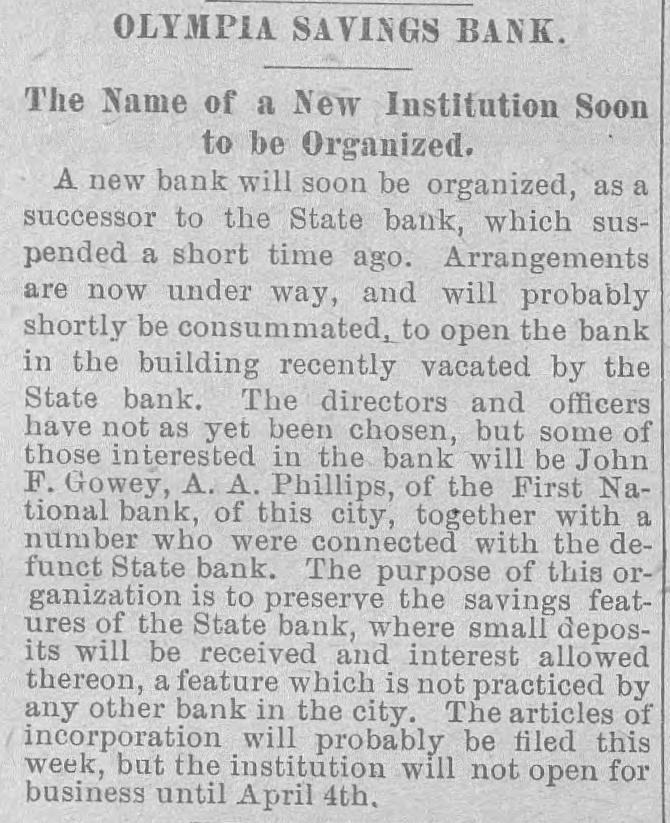 OLYMPIA SAVINGS BANK. The Name of a New Institution Soon to be Organized. A new bank will soon be organized, as a successor to the State bank, which suspended a short time ago. Arrangements are now under way, and will probably shortly be consummated, to open the bank in the building recently vacated by the State bank. The directors and officers have not as yet been chosen, but some of those interested in the bank will be John F. Gowey, A. A. Phillips, of the First National bank, of this city, together with a number who were connected with the defunct State bank. The purpose of this organization is to preserve the savings features of the State bank, where small deposits will be received and interest allowed thereon, a feature which is not practiced by any other bank in the city. The articles of incorporation will probably be filed this week, but the institution will not open for business until April 4th.
