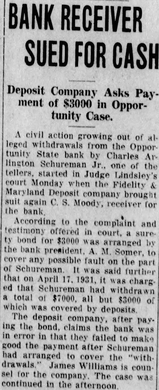 RECEIVER Deposit Company Asks Payment of $3000 in Opportunity Case. civil action growing out of leged withdrawals from the Opportunity State bank by Charles lington Schureman one of the tellers, started in Judge Lindsley's court Monday when the Fidelity Maryland Deposit company brought suit again Moody, receiver for the According to the complaint and testimony offered in court, bond for $3000 arranged the bank M. Somer, any possible fault on the part Schureman. was said further that on April 1931, charg. ed that Schureman had withdrawn total of all but $3000 which was covered by deposits. The deposit company, after pay. ing the bond. claims the bank was error in that they failed to make good had the after Schureman arranged to cover the drawals. James Williams is counsel for the company The case was continued in the afternoon.