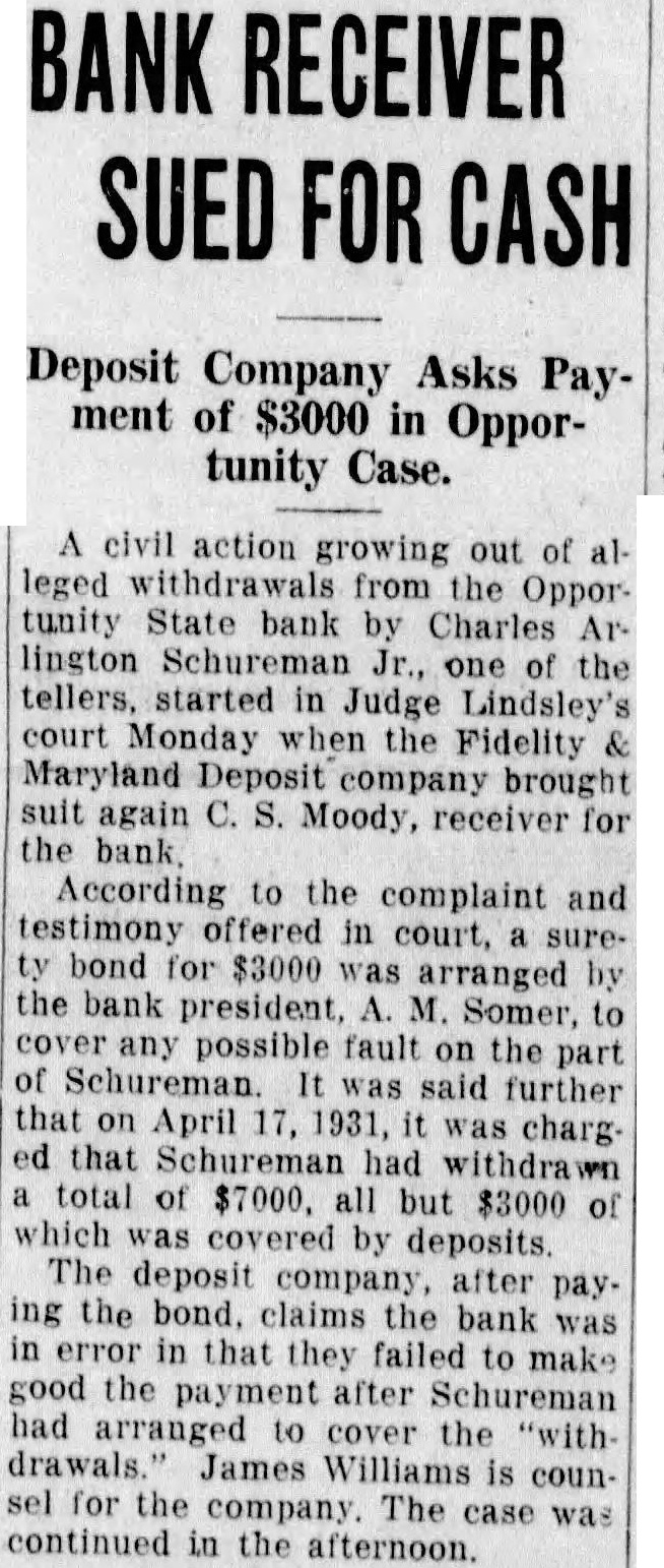 BANK RECEIVER SUED Deposit Company Asks Payment of $3000 in Opportunity Case. civil action growing out of leged withdrawals from the Opportunity State bank by Charles Arlington Schureman one of the tellers. started in Judge Lindsley's court Monday when the Fidelity Maryland brought suit again Moody, receiver for the bank According to the complaint and testimony offered in court, bond for $3000 arranged by the bank president, Somer, to any possible fault on the part said further that 17, 1931, chargthat had withdrawn total of $7000. all but $3000 which covered by deposits. The deposit company, after paying the bond. claims the bank was in error in that they failed to make good the payment after Schureman had arranged to cover the drawals.' James Williams is counsel for the company. The case continued in the afternoon.