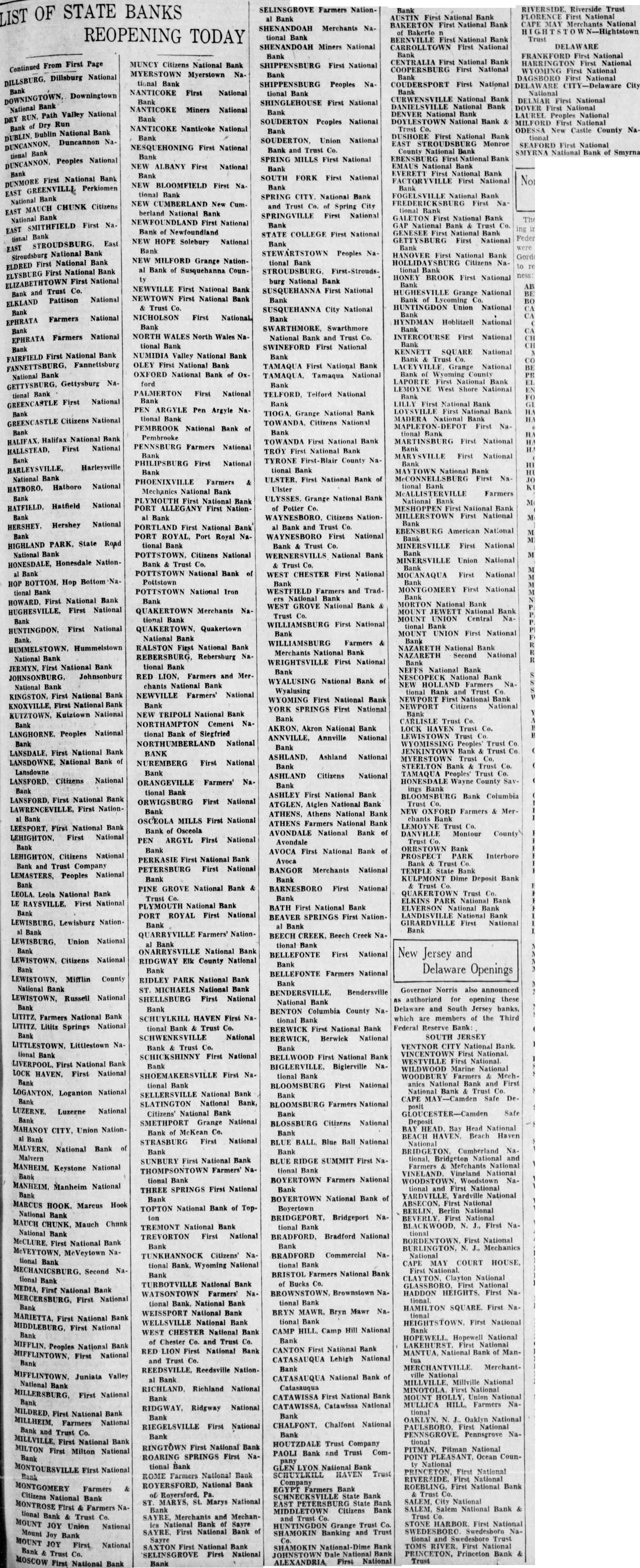 From First Page Continued Dillsburg National DILLSBURG, Downingtown Bank National Valley National Path DRY Dry Run of Bank National Bank Dublin Duncannon NaDUNCANNON, Bank tional Peoples National DUNCANNON, Bank First National Bank DUNMORE Perkiomen GREENVILLE EAST Bank National CHUNK Citizens MAUCH EAST Bank National SMITHFIELD First NaEAST tional East EAST Stroudsburg National Bank First National Bank ELDRED First National Bank ELYSBURG First National ELIZABETHTOWN and Trust Co. Bank Pattison National ELKLAND