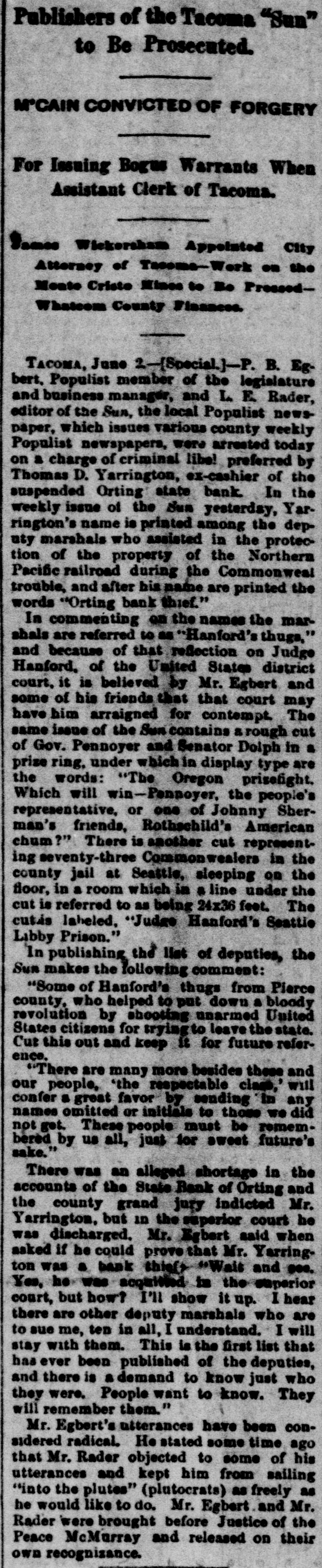 Publishers of the Tacoma "Sun" to Be Prosecuted. M'CAIN CONVICTED OF FORGERY For Issuing Bogue Warrants When Assistant Clerk of Tacoms. Sames Wickersham Appointed City Attorney of Twoma-Work on the Meate Cristo Mines w Be PressedWhatcom County Financea TACOMA, June 2-[Special.]-P. B. Eg. bert, Populist member of the legislature and business manager, and L. E. Rader, editor of the Sun, the local Popalist news paper, which issues various county weekly Populist newspapers, were arreated today on a charge of criminal libe! preferred by Thomas D. Yarrington, ex-cashier of the suspended Orting state bank. In the weekly issue of the Sun yesterday, Yarrington's name is printed among the deputy marshals who assisted in the protection of the property of the Northern Pacific railroad during the Commonweal trouble, and after his name are printed the words "Orting bank thief." In commenting on the names the marshals are referred to as "Hanford's thugs," and because of that reflection on Judge Hanford. of the United States district court, it is believed by Mr. Egbert and some of his friends that that court may have him arraigned for contempt The same issue of the Sun contains a rough cut of Gov. Pennoyer and Senator Dolph in a prize ring. under whichin display type are the words: "The Oregon prisefight. Which will win-Pennoyer, the people's representative, or one of Johnny Sherman's friends, Rothschild's American chum?" There is another cut representing seventy-three Commonwealers in the county jail at Seattle, sleeping on the floor, in a room which in a line under the cut is referred to as being 24x36 feet. The cut-is labeled, "Judge Hanford's Seattle Libby Prison." In publishing the list of deputies, the Sun makes the following comment: "Some of Hanford's thugs from Pierce county. who helped to put down a bloody revolution by shooting unarmed United States citizens for trying to leave the state. Cut this out and keep it for future reference. "There are many more besides these and our people, 'the respectable class, will confer a great favor by sending in any names omitted or initials to those we did not get. These people must be remembered by us all, just for sweet future's sake.' There was an alleged shortage in the accounts of the State Bank of Orting and the county grand jury indicted Mr. Yarrington, but in the superior court he was discharged. Mr. Egbert said when asked if he could prove that Mr. Yarrington was a bank thief> "Wait and see. Yes, he was acquitted is the superior court, but how? I'll show it up. I hear there are other deputy marshals who are to sue me, ten in all, I understand. I will stay with them. This is the first list that has ever been published of the deputies, and there is a demand to know just who they were. People want to know. They will remember them." Mr. Egbert's utterances have been considered radical. He stated some time ago that Mr. Rader objected to some of his utterances and kept him from sailing "into the plutes" (plutocrats) as freely as he would like to do. Mr. Egbert and Mr. Rader were brought before Justice of the Peace McMurray and released on their own recognizance.