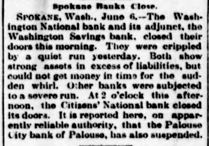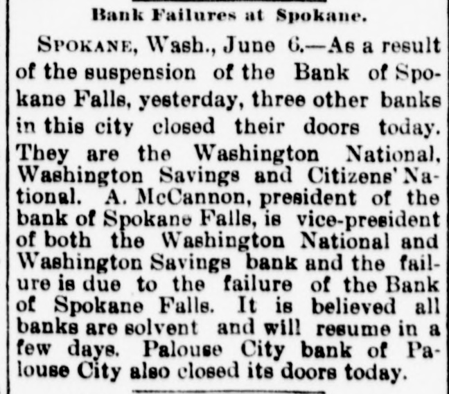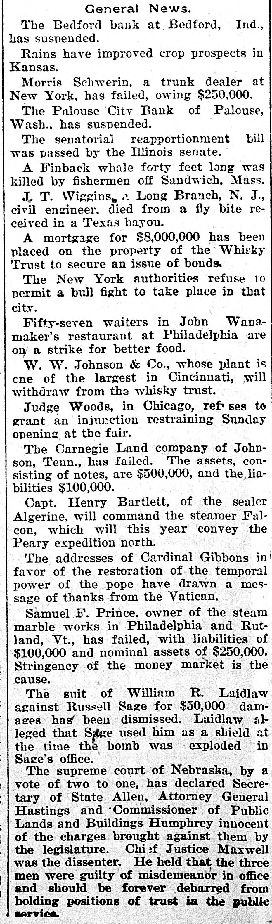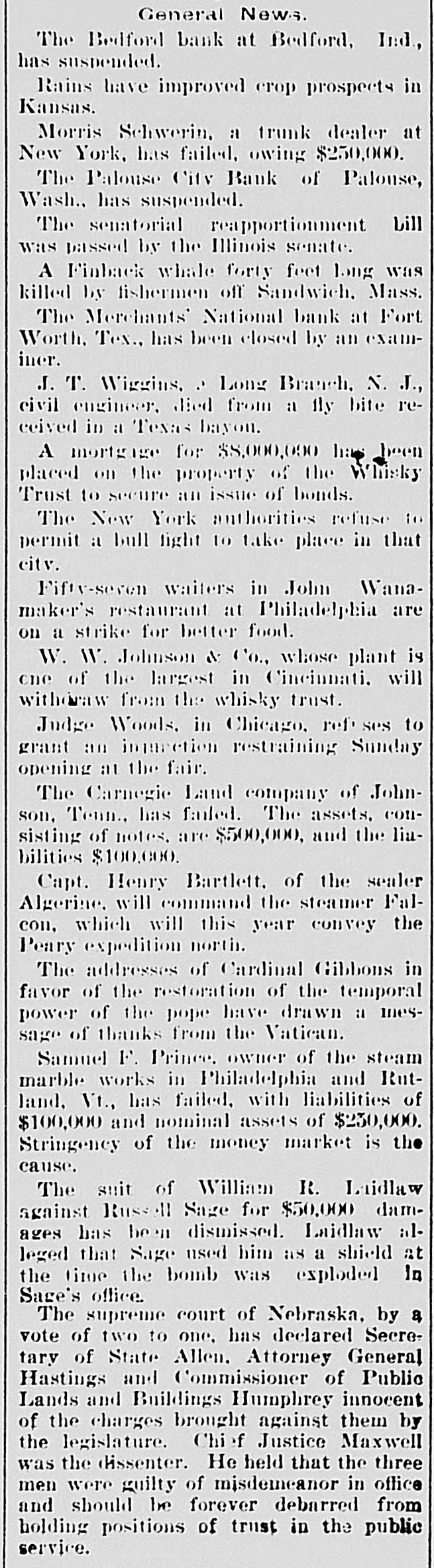 know nothing of his whereabouts. 1218 stated that he left his business affairs in bad condition. His property has been attached in a suit brought by Mrs. Charlotte Baker to recover $12,000 given to Mr. Merrill to urchase shares of stock for her. but since that time he has failed to turn them over to her. Other attachments are: Sarah A. Cohen. $40,000; Hepsebeth Fenton, $5,000; Susan D. B. Webber, $10,000; Robert M. Morse, $25,000; Lucia A. D. Long, $100,000. John F. Hooper. Mr. Merrill's private secretary, said to-day that Mr. Merrill had gone away for rest, on the advice of a physician. His financial affairs, his secretary says, are in good condition. and all claims against him will be promptly paid when he returns. Winthorp M. Merrill said to-day: "1 think it would be safe to estimate that after all my father's liabilities are met he would be worth from $100,000 to $200,000." Three More Spokane Banks Closed. SPOKANE, Wash., June 6.-As a result of the suspension of the Pank of Spokane Falls yesterday, three other banks in this city closed their doors to-day. They are the Washington National, the Washington Savings and the Citizens' National. A. M. Cannon, president of the Bank of Spokane Falls, is vice president of both the Washington National and Washington Savings Bank and the failure is due directly to the failure of the Bank of Spokane Falls. There great excitement during the run occurred on day and was a Washington nearly every Nabank in the city. The tional has a paid-up capital of $100,000, and according to a recent statement has deto $326,000. posits amounting The capital Wash- of 1D g ton Savings has a paid-up $50,000 and deposits of $100,000. The Citiof $150,000 and to about zens' deposits National amounting has a capital $400,000. It is believed all the banks are perfectly solvent and will resume in a few days. The Palonse City Bank of Palouse City, also closed its doors to-day. Bedford Bank Forced to Suspend. Special to the Indianapolis Journal BEDFORD, Ind., June 6.-The Bedford Bank this morning closed its doors. The president claims that owing to an unprecedented heavy run on the Chicago banks yesterday, which had promised assistance, the bank was forced to suspend. Depositors are promised to receive full value for every dollar. The bank 18 one of the oldest in the State. The exact amount of deposits 18 not known at present, but are supposed to be large. Packing House Attached. WICHITA, Kan., June 6.-The Laclede and Third National Banks, of St. Louis, and the Bank of Commerce, of Kansas City, to-day sued out attachments for $50.000 and $25,000, and $50,000, respectively, against the Francis Whittaker & Sone house. Late this evening N. packing of the property. The sheriff is in possession W. Levy, president of the Wichita National Bank, was appointed receiver. The plant here is valued at $200,000. Assignment of New England Publishers. BOSTON, June 5.-Potter & Potter, publishers of the New England Magazine, the Yankee Blade, the Woman's Home Journal, the American Vehicle and the Amesbury, have assigned to W. J. Clark, of this city. Isaac J. Potter said that the New England Magazine had broken the firm. and that the other publications were in good condition. The liabilities are between $75,000 and $100,000. A Wisconsin Bank Suspends. Lane The State