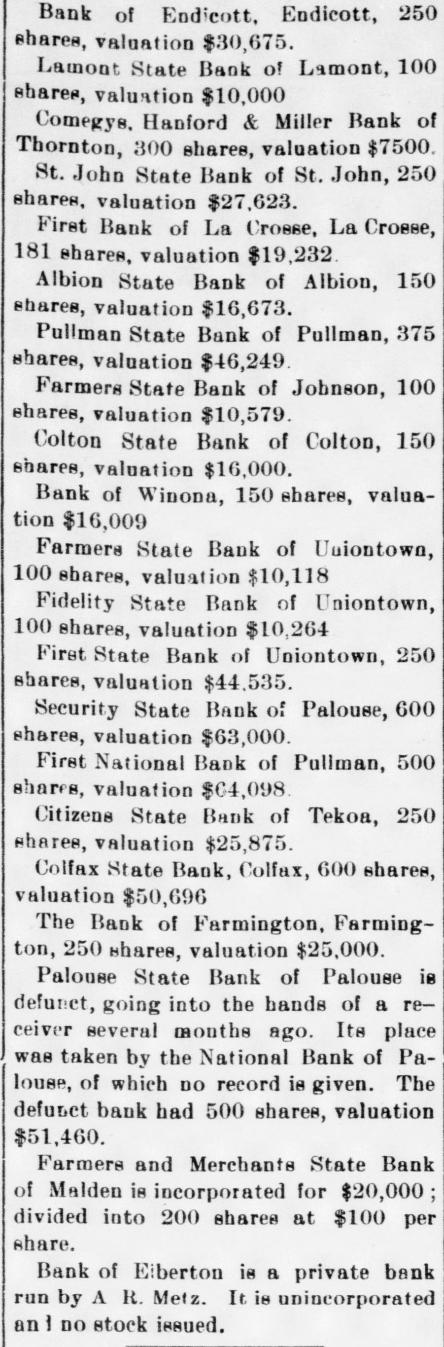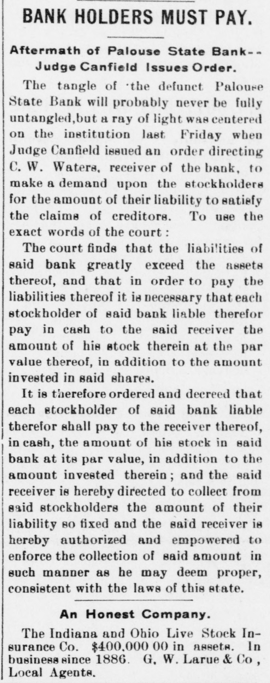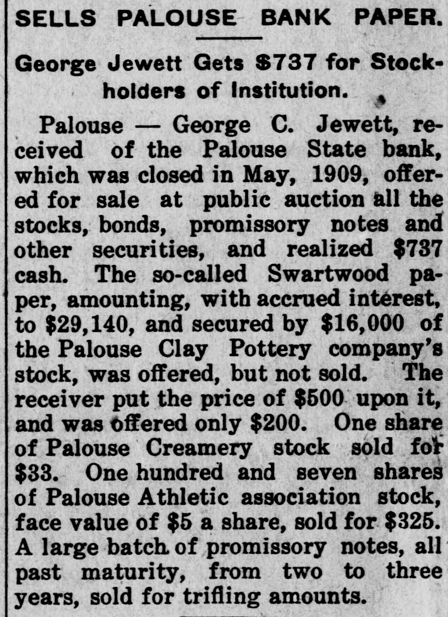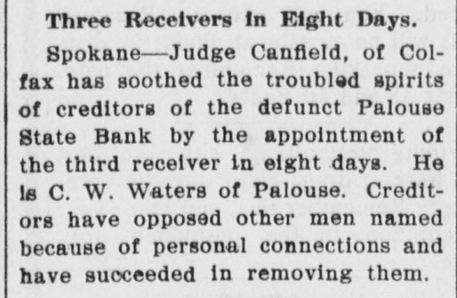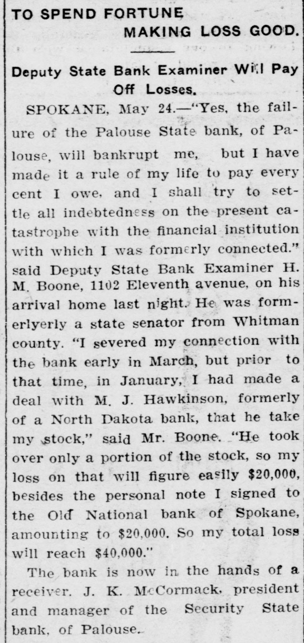 TO SPEND FORTUNE MAKING LOSS GOOD. Deputy State Bank Examiner Will Pay Off Losses. SPOKANE, May 24.-"Yes, the failure of the Palouse State bank, of Palouse, will bankrupt me, but I have made it a rule of my life to pay every cent I owe, and I shall try to settle all indebtedness on the present catastrophe with the financial institution with which I was formerly connected." said Deputy State Bank Examiner H. M. Boone, 1102 Eleventh avenue, on his arrival home last night. He was formerlyerly a state senator from Whitman county. "I severed my connection with the bank early in March, but prior to that time, in January, I had made a deal with M. J. Hawkinson, formerly of a North Dakota bank, that he take my stock," said Mr. Boone. "He took over only a portion of the stock, so my loss on that will figure easily $20,000, besides the personal note I signed to the Old National bank of Spokane, amounting to $20,000. So my total loss will reach $40,000." The bank is now in the hands of a receiver. J. K. McCormack. president and manager of the Security State bank, of Palouse..