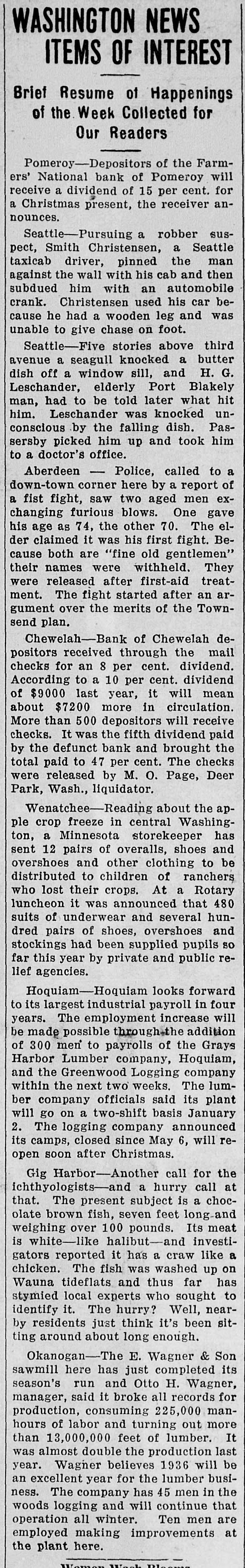 WASHINGTON NEWS ITEMS OF INTEREST Brief Resume of Happenings of the Week Collected for Our Readers. THE MARKETS Portland Wheat - Big Bend bluestem. hard white, 85c soft white and western white, hard winter, northern spring and western red, 70c. Hay-Buying price, f. O. b. Portland: Alfalfa, $14@14.50; valley timothy, $15@15.50; eastern Oregon timothy, $18@18.50; clover, $11; oat hay, $11; oats and vetch, $12@12.50. Butterfat-28@31c. Eggs-Ranch, 17@29c. Cattle-Steers, good, $6.00@6.75. Hogs-Good to choice, $4.65@5.25. Lambs-Good to choice, $5@5.50. Seattle Wheat-Soft white, western white, 72c; hard winter, northern spring, 74c; western red, 73c; bluestem, 84c. Butterfat-33e. Eggs-Ranch, 18@35c. Cattle-Choice steers, $6@6.75. Hogs-Good to choice, $5.25@5.35. Lambs-Choice, $5@5.50. Spokane Cattle-Steers, good, $5.25@6. Hogs-Good to choice, $4.85@5. Lambs-Medium to good, $4@4.50. The Seattle Gas company announced a new rate, offering reductions of from 5 to 30 per cent on former schedules, taking effect on November 16. Fire, believed to have started from refuse, damaged the Gruber-Docherty lumber mill at Yelm to the extent of $60,000, according to reports made to fire department officials. Walla Walla has spent $209,056 in public improvements this year. Of this amount $116,248 was spent in restoring sidewalks and bulkheads damaged by a flood in March. Sir Harry Lauder, Scottish comedian, has sent an order from his home in Scotland for six boxes of Washington apples, two each of Winesaps, Spitzenbergs and Newtons. Edward Remy, widely known fruit grower, died at his home in Yakima. He was a leading horticultural experimenter and developed the King Albert cherry, named after the king of Belgium. William H. Hobson, superintendent of the Greenwood Logging company, was killed in an accident in the Wishkah valley when a speeder he was riding jumped the track and crushed him beneath it. The dairy industry in the state, particularly east of the Cascades, is in a healthy condition, according to State Dairy Inspector Kennewick. Low feed costs and favorable butterfat returns are responsible. Rising grain prices may help the Farmers National bank at Pomeroy, which failed last May 16, to pay its obligations in full, James E. Drain, receiver, said. A first dividend of 20 per cent was paid last week. What is believed to be the first inter-school algebra contest was held in Olympia recently, when Olympia high school's freshman squad of mathematicians won a 9 to 0 victory over the six-man team of Littlerock high. Only a few moments before he would have entered it, the car of Jack McCauley, Twisp, was utterly demolished in an explosion in what apparently was an attempt on McCauley's life. McCauley is a brother of the sheriff. Elsie May Crego, 16-months-old, the daughter of Captain and Mrs. William Crego of the Salvation Army post at Kelso, is alive as a result of the successful removal of a three-cornered piece of chicken bone from her throat by three Portland specialists. The Kelso-Portland Navigation company is planning to run a small boat to Toledo to augment service by a larger boat between Kelso and Portland. It is 20 years since boats were operated between Kelso and Toledo giving freight and passenger service. Police dogs have a reputation for being a bit stern and impatient, but the rule does not always apply. This was proven at Hoquiam recently. A two-year-old female police dog, owned by Mrs. Harry Madsen arrived home