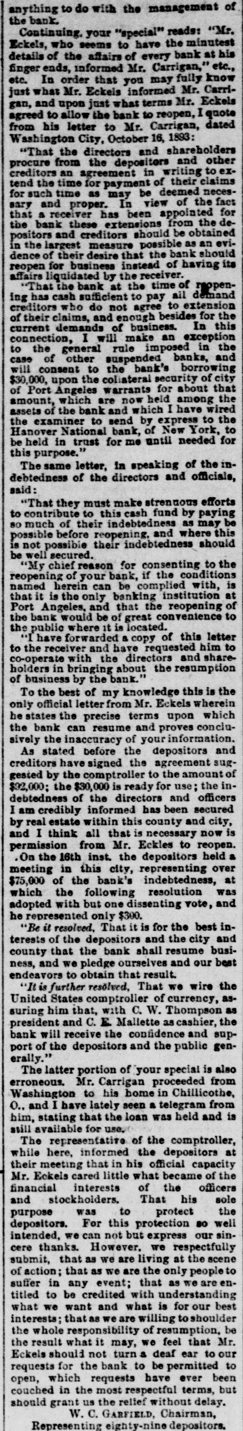 anything to do with the management of the bank. Continuing, your "special" reads: "Mr. Eckels, who seems to have the minutest details of the affairs of every bank at his finger ends, informed Mr. Carrigan," etc., etc. In order that you may fully know just what Mr. Eckels informed Mr. Carrigan, and upon just what terms Mr. Eckels agreed to allow the bank to reopen, I quote from his letter to Mr. Carrigan, dated Washington City, October 16, 1893: "That the directors and shareholders procure from the depositors and other creditors an agreement in writing to extend the time for payment of their claims for such time as may be deemed necessary and proper. In view of the fact that a receiver has been appointed for the bank these extensions from the depositors and creditors should be obtained in the largest measure possible as an evidence of their desire that the bank should reopen for business instead of having its affairs liquidated by the receiver. "That the bank at the time of reopening has cash sufficient to pay all demand creditors who do not agree to extension of their claims, and enough besides for the current demands of business. In this connection, I will make an exception to the general rule imposed in the case of other suspended banks, and will consent to the bank's borrowing $30,000, upon the collateral security of city of Port Angeles warrants for about that amount, which are now held among the assets of the bank and which I have wired the examiner to send by express to the Hanover National bank, of New York, to be held in trust for me until needed for this purpose." The same letter, in speaking of the indebtedness of the directors and officials, said: "That they must make strenuous efforts to contribute to this cash fund by paying so much of their indebtedness as may be possible before reopening, and where this is not possible their indebtedness should be well secured. "My chief reason for consenting to the reopening of your bank, if the conditions named herein can be complied with, is that it is the only banking institution at Port Angeles, and that the reopening of the bank would be of great convenience to the public where it is located. "I have forwarded a copy of this letter to the receiver and have requested him to co-operate with the directors and shareholders in bringing about the resumption of business by the bank." To the best of my knowledge this is the only official letter from Mr. Eckels wherein he states the precise terms upon which the bank can resume and proves conclusively the inaccuracy of your information. As stated before the depositors and creditors have signed the agreement suggested by the comptroller to the amount of $92,000; the $30,000 is ready for use; the indebtedness of the directors and officers I am credibly informed has been secured by real estate within this county and city, and I think all that is necessary now is permission from Mr. Eckles to reopen. .On the 16th inst. the depositors held a meeting in this city, representing over $75,000 of the bank's indebtedness, at which the following resolution was adopted with but one dissenting vote, and he represented only $300. "Be it resolved, That it is for the best interests of the depositors and the city and county that the bank shall resume business, and we pledge ourselves and our best endeavors to obtain that result. "It is further resölved, That we wire the United States comptroller of currency, assuring him that, with C. W. Thompson as president and C. E. Mallette as cashier, the bank will receive the confidence and support of the depositors and the public generally." The latter portion of your special is also erroneous. Mr. Carrigan proceeded from Washington to his home in Chillicothe, O., and I have lately seen a telegram from him, stating that the loan was held and is still available for use. The representative of the comptroller, while here, informed the depositors at their meeting that in his official capacity Mr. Eckels cared little what became of the financial interests of the officers and stockholders. That his sole purpose was to protect the depositors. For this protection so well intended, we can not but express our sincere thanks. However, we respectfully submit, that as we are living at the scene of action; that as we are the only people to suffer in any event; that as we are entitled to be credited with understanding what we want and what is for our best interests; that as we are willing to shoulder the whole responsibility of resumption, be the result what it may, we feel that Mr. Eckels should not turn a deaf ear to our requests for the bank to be permitted to open, which requests have ever been couched in the most respectful terms, but should grant us the relief without delay. W c Chairman