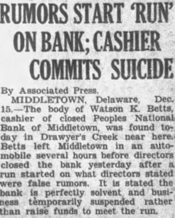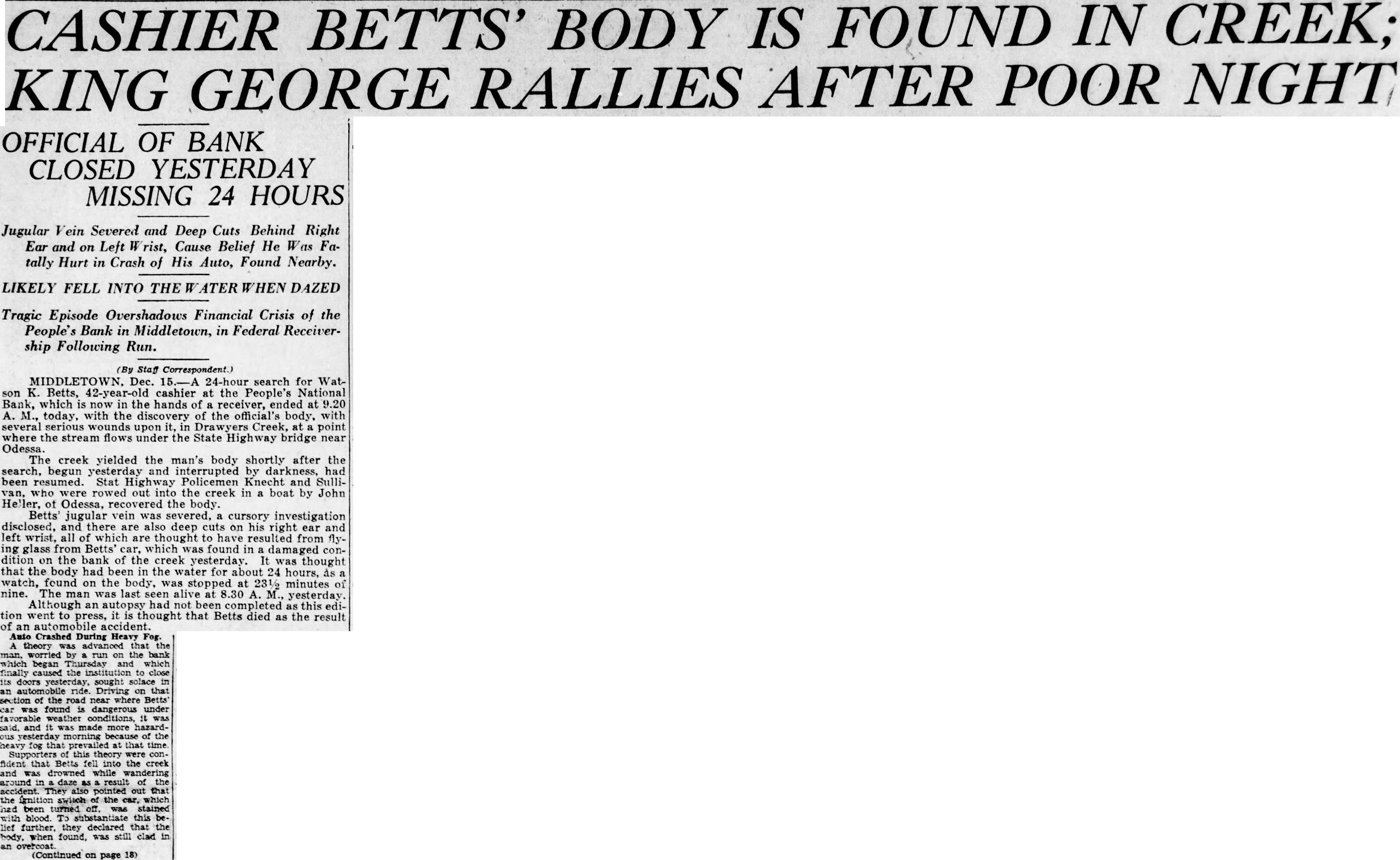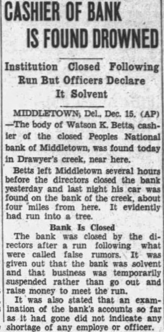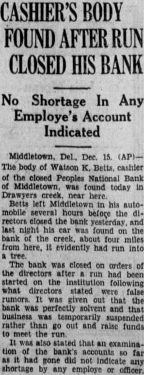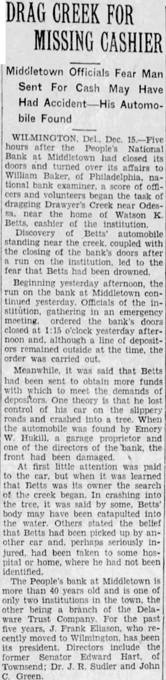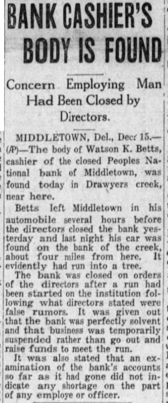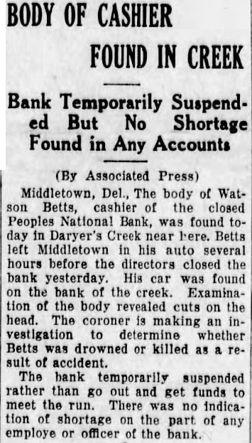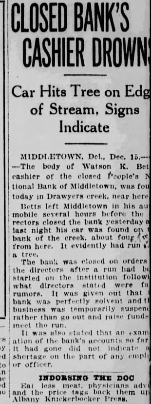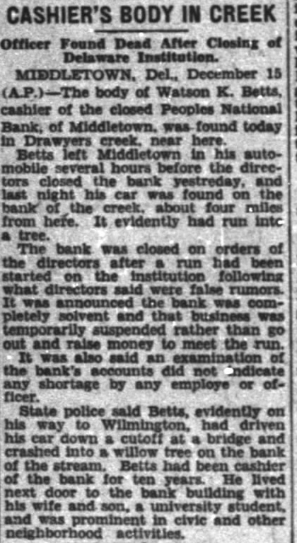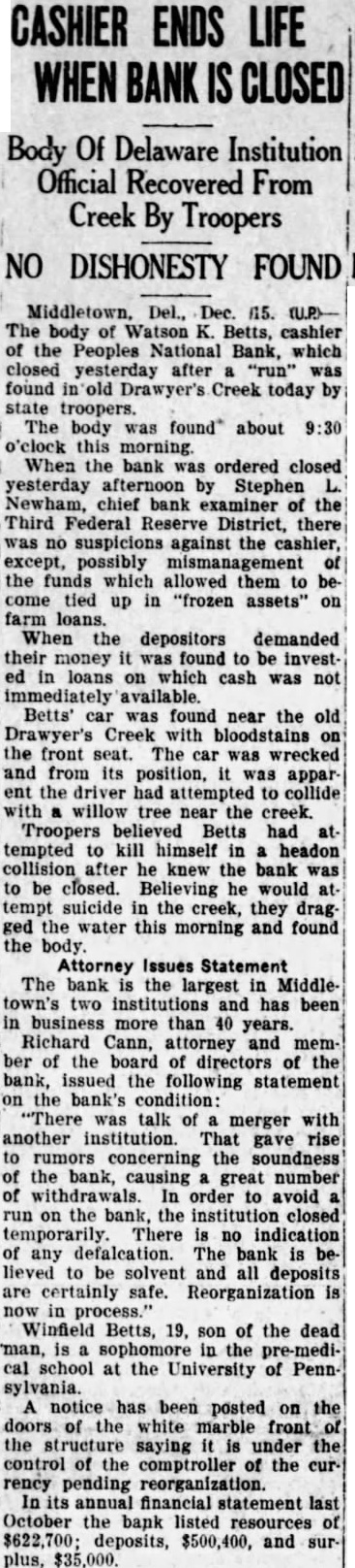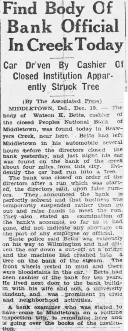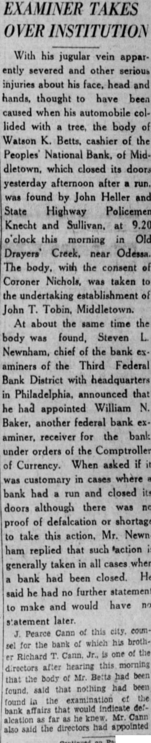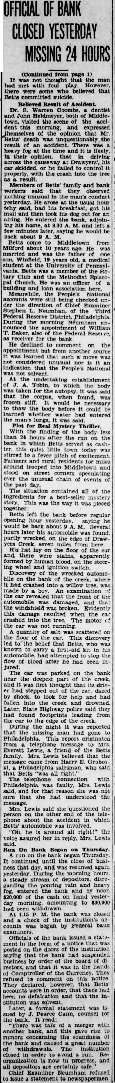 (Continued from page 1) not thought that the man with foul play. However, there were some who believed that Betts committed suicide. Believed Result of Accident. Dr. Warren Coombs, dentist John both Middletown, visited the scene the accident this morning, and expressed themselves of the opinion that Mr. Betts' death was unquestionably the result of an accident. There heavy fog at the time and is likely, in their opinion, that in driving across the causeway at Drawyers', his car skidded, or he failed control properly, with the crash into the tree result. Members of Betts' family and bank workers said that they observed nothing in the man's conduct yesterday. He arose at the usual hour said, had his breakfast, got his mail and then took his dog out for an airing. He the adjoining his home, M. and few minutes saying he would be about Betts come to Middletown from Milford about 10 years He married the father of one Winfield. 19 years old, medical student at the University of Pennsylvania. Betts member the Rotary Club and the Methodist EpiscoChurch. He was officer of loan association here. Meanwhile, the People's National accounts still being der the direction of Chief Examiner Stephen Neumhan, of the Third Federal Reserve District, Philadelphia. During the morning Neumham William Baker, the Federal Reser ve, receiver for the bank. He declined to comment on the but from source was learned that such was an that the People's National was not At the undertaking establishment Tobin. to which the body was taken for the autopsy, was said that the when found, was frozen would be to thaw the before it could be whether had entered the lungs, was for Real Thriller. the finding of the body less than 24 hours after the run on the bank in which Betts as ier. quiet little town today was stirred fever pitch Farmers and residents for miles around trooped Middletown and stood street corners speculating over the unusual chain of events of the past contained all of the ingredients for best-seller mystery story. This was the way it was pieced together: Betts left the bank before regular opening hour yesterday, saying he would back about M. Several hours later his automobile was found, partly the edge Drawyers Creek, miles from here. His hat lay on the floor the car there were stains, apparently formed by human blood. on the steering wheel and ignition switch. Discovery the wrecked automobile on the bank of the creek. where it had crashed into willow tree, was made by boy. An examination the revealed that the front of the automobile damaged, that the windshield was broken. Evidently this damage resulted when the car crashed into the tree. The motor of the was not running. quantity of salt was scattered on the floor the car. This discovery led the belief Betts, who known to carry first-aid kit in his automobile, had attempted stop the flow of blood after he had been injured. The car was parked on the bank near the deepest part of the creek, and thought that its drivhad stepped out of the car, dazed shock, look for help and had fallen into the creek and drowned. Later. State Highway police said they had found footprints leading from the the edge of the creek. During the night was reported that missing man had gone Philadelphia, This report originated from telephone message Mrs. Everett Lewis, friend of the Betts family. Mrs. Lewis believed that the message came from Harry Grabos ki, Philadelphia salesman, who said that "was right." The telephone connection with Philadelphia faulty, Mrs. Lewis said, and that reason was that she had understood the message. Mrs. Lewis said she questioned the person on the other of the phone about the accident which Betts' was "Oh, he is around all the assured her in reply, Mrs. Lewis Run On Bank Began on Thursday. run the Thursday. It until the close of business that was resumed again yesterday. During the morning hours, steady stream disregarding the rain and heavy fog, the and by noon of the cash on hand yesterday to $30,000 had At 1.15 P. M. the bank was closed and check of the counts begun by Federal bank examiners. Officials of the bank issued statement in the form of notice that was posted on the of the institution saying that the had suspended business by order of the board of directors, that was in the hands of of the They refused to on this notice. They however, that Betts' in order, that there had been no defalcation and that the institution solvent. Later, formal statement isby Pearce Cann, counsel for the bank. It read: "There was talk of merger with another bank, and this gave to rumors concerning the soundness the bank caused great number withdrawals. The institution closed in order to avoid Reorganization now progress, and all depositors are Chief Examiner Neumham refused issue a statement to newspapermen.